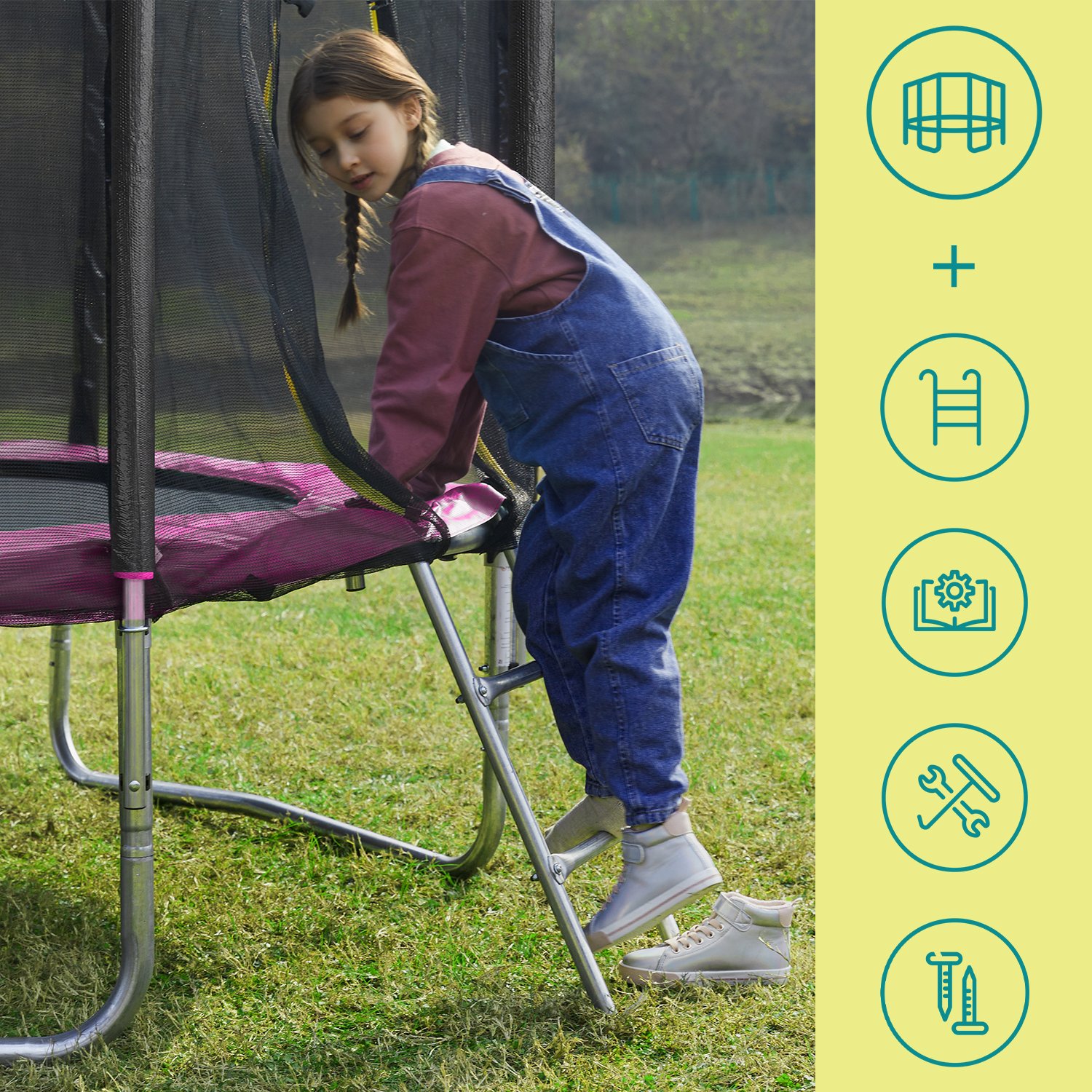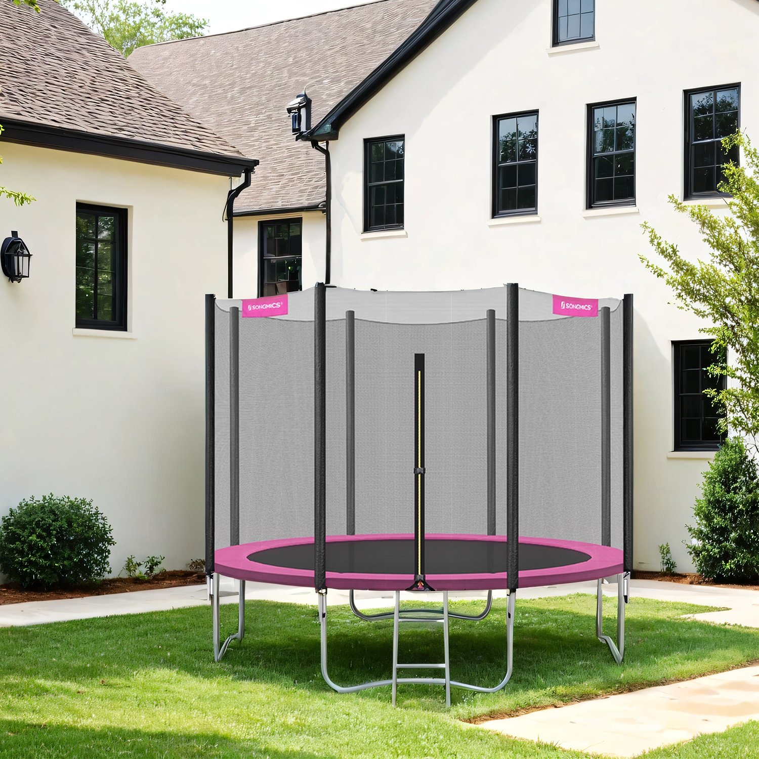 Trampolin 305 cm, havetrampolin, med sikkerhedsnet, kantd?ksel, stige, 180 cm h?je lige st?nger, st?lramme, bl?