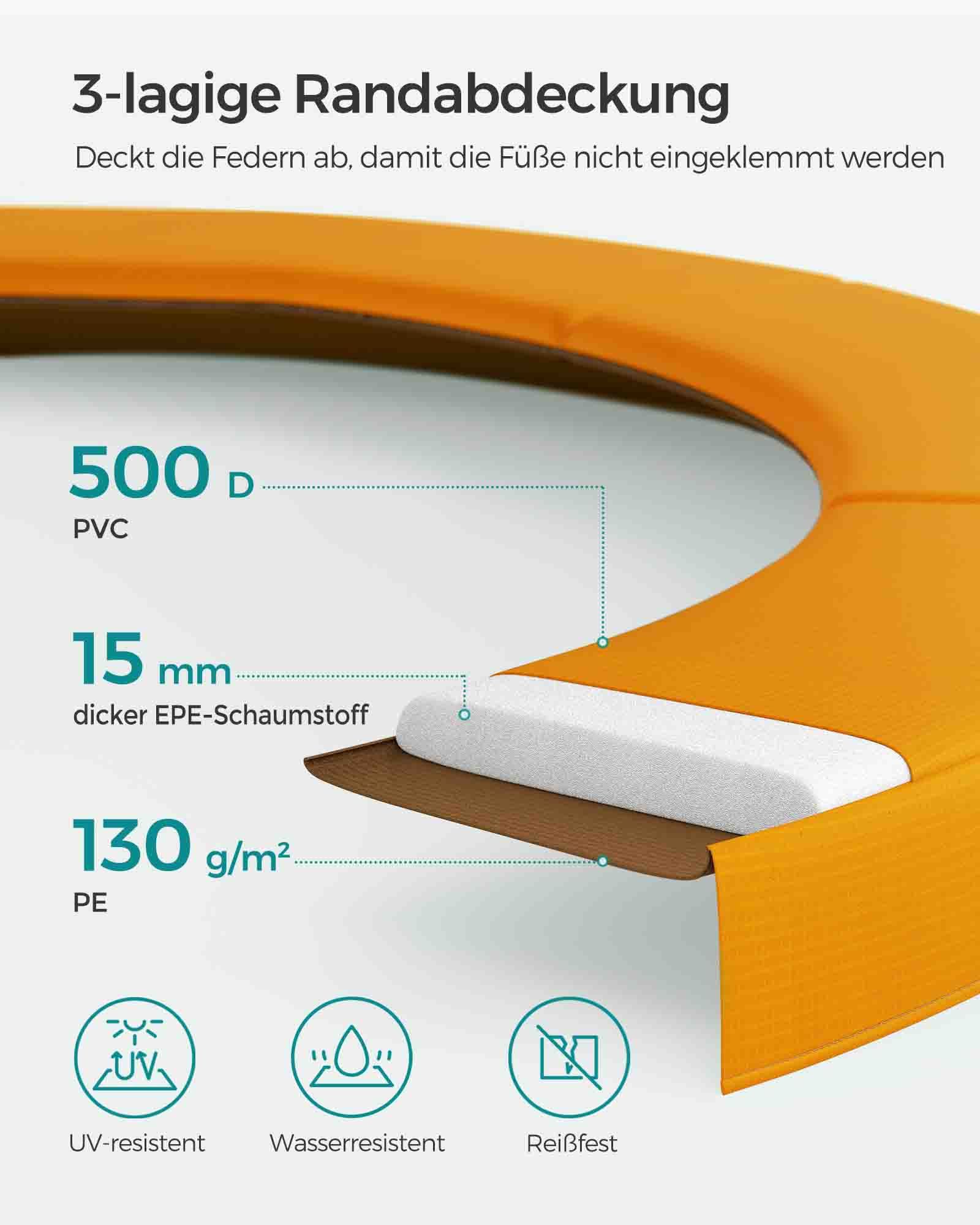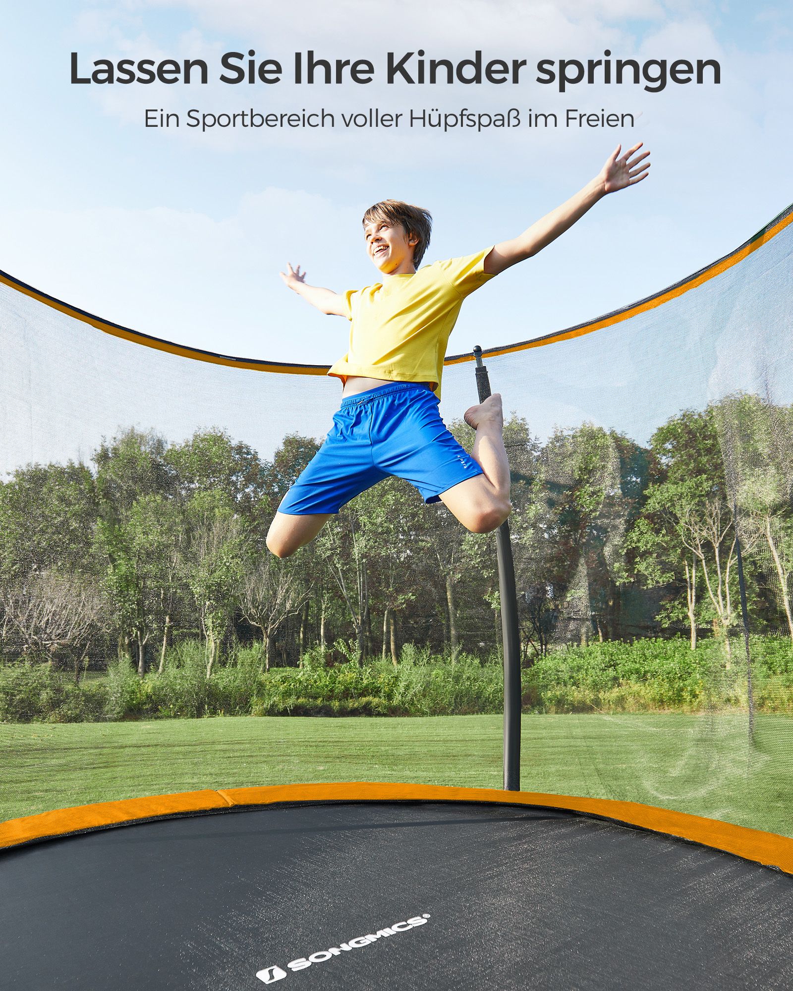Hav det sjovt i haven! Denne 305 cm store trampolin er perfekt til at hoppe rundt i haven p? en varm eftermiddag (eller endda til lidt fitness). Lad ogs? dine b?rn hoppe efter hjertets lyst p? denne trampolin fra SONGMICS, mens du soler dig eller st?r ved grillen.Sikkerhed har h?jeste prioritet Trampolinspring skal selvf?lgelig f?rst og fremmest v?re sjovt. Men sikkerheden m? ikke komme i anden r?kke. Derfor er denne trampolin udstyret med et t?tmasket sikkerhedsnet, der d?mper st?d s?rligt godt. Desuden er st?ngerne monteret p? ydersiden af nettet og d?kket med EPE-skum, hvilket ogs? reducerer risikoen for skader.Produktdetaljer: – Farve: Sort-orange – Diameter: 305 cm – Ramme materiale: Galvaniseret st?lr?r – Springdug materiale: Polypropylen (265 g/?) – Sikkerhedspolstring materiale: PVC (310 g/?), EPE-skum – Afstand mellem gulv og trampolinoverflade: 76 cm – Maks. belastbarhed: 150 kg Leveringsomfang: – 1 x trampolin ? 305 cm – 1 x stige – 1 x tilbeh?rspose – 1 x vejledning (DE, EN, FR, ES, IT) SONGMICS Bem?rkninger: – Trampolinen b?r altid kun bruges af ?n person. Brug af flere personer p? samme tid kan f?re til skader. – Udf?r ikke saltomortaler p? trampolinen. – H?ng ikke p? den ?verste kant af sikkerhedsnet. – Fjern alle spidse eller skarpe genstande, f?r du g?r p? trampolinen. – Trampolinen er ikke egnet til b?rn under 3 ?r. – Kun egnet til privat brug.