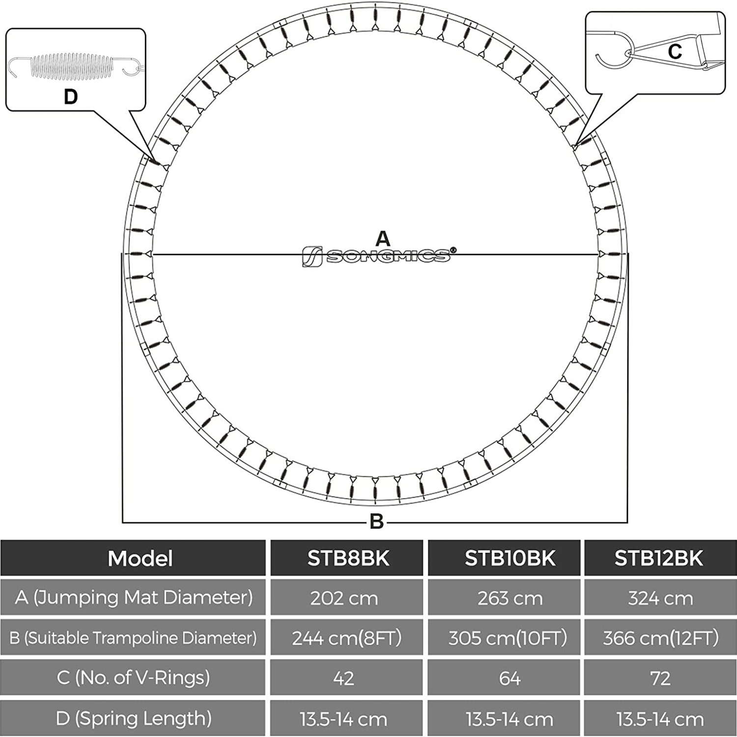 SONGMICS springt?ppe til trampolin, springm?tte med diameter 202 cm, til ? 244 cm runde trampoliner, med 42 ?jer til 13,5-14 cm lange fjedre, trampolintilbeh?r, sort STB8BK