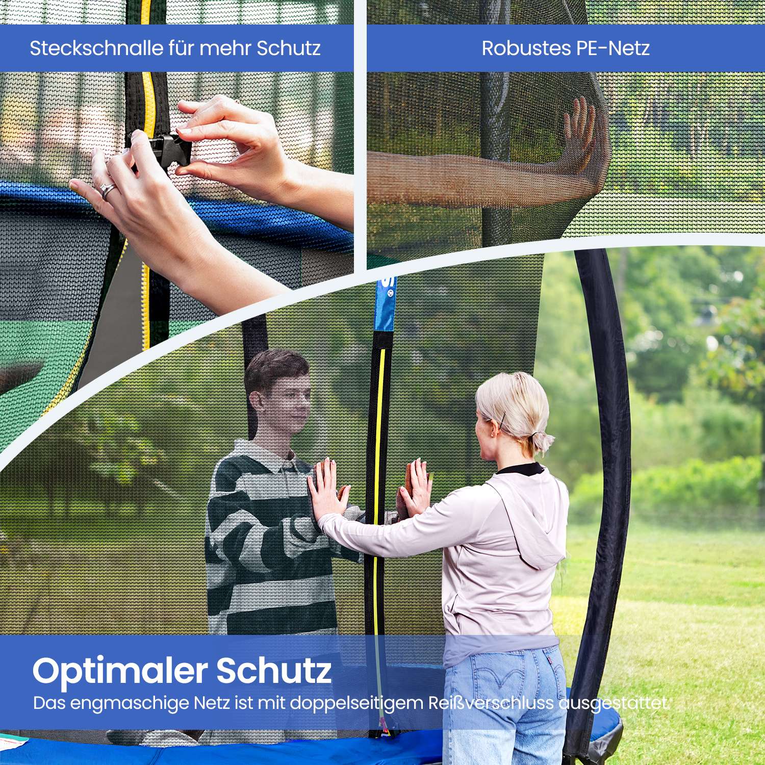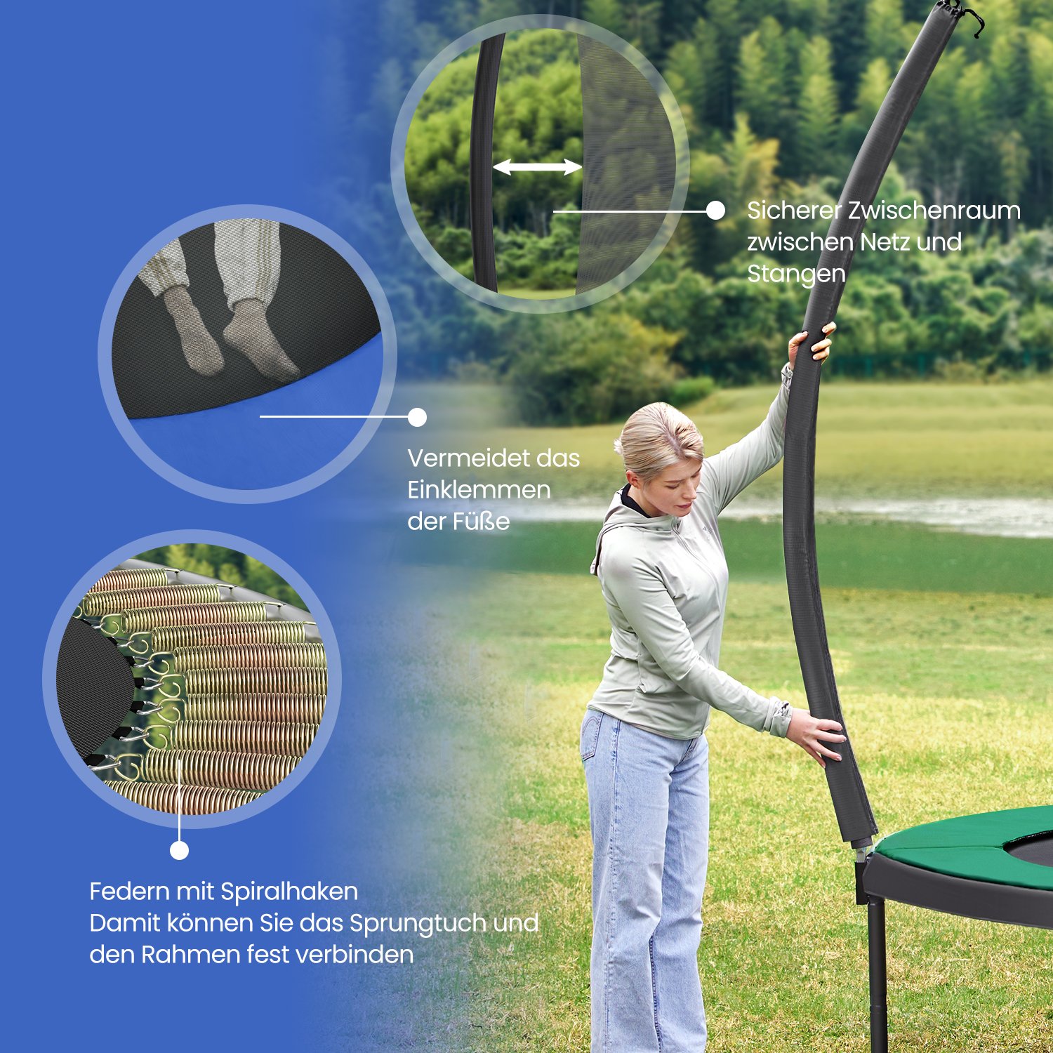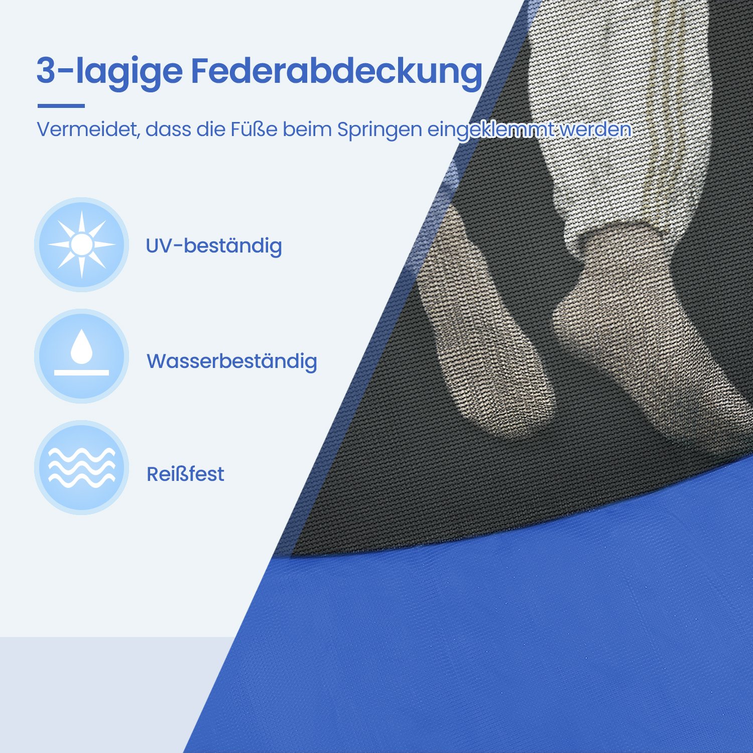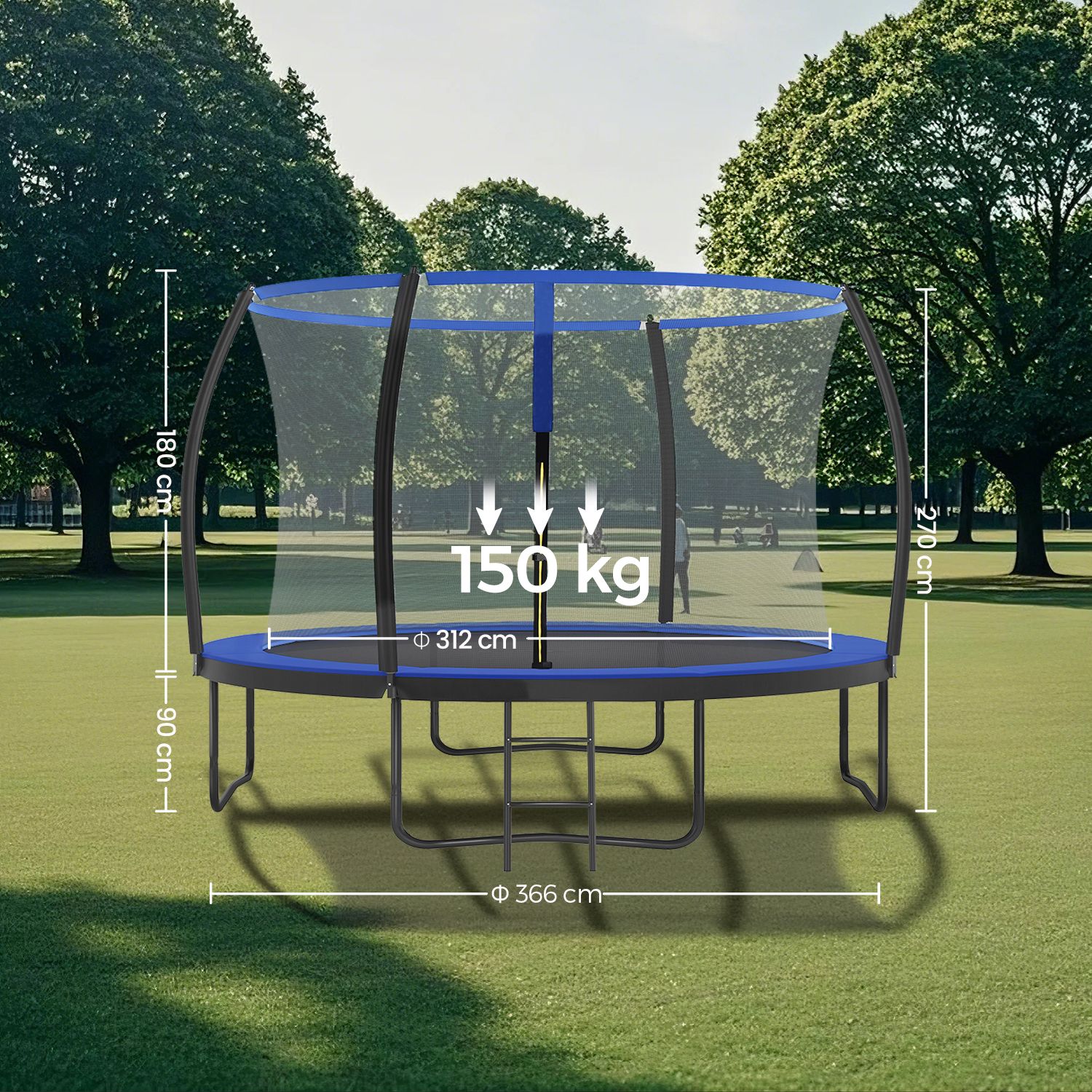 Hav det sjovt i haven!Denne 366 cm store trampolin er perfekt til at hoppe rundt i haven p? en varm eftermiddag (eller endda til lidt fitness). Lad ogs? dine b?rn hoppe efter hjertets lyst p? denne trampolin fra SONGMICS, mens du soler dig eller st?r ved grillen. Sikkerhed har h?jeste prioritet Trampolinspring skal selvf?lgelig f?rst og fremmest v?re sjovt. Men sikkerheden m? ikke komme i anden r?kke. Derfor er denne trampolin udstyret med et t?tmasket sikkerhedsnet, der d?mper st?d s?rligt godt. Derudover er st?ngerne monteret p? ydersiden af nettet og d?kket med EPE-skum, hvilket ogs? reducerer risikoen for skader.ProduktdetaljerFarve: Sort-bl?Diameter: 366 cmRammens materiale: Galvaniseret st?lr?rSpringdugens materiale: Polypropylen (265 g/m2)Sikkerhedspolstringens materiale: PVC (310 g/m2), EPE-skum Afstand mellem gulv og trampolinoverflade: 90 cm Maks. belastning: 150 kg Leveringsomfang: 1 x trampolin ? 366 cm 1 x stige 1 x tilbeh?rspose 1 x monteringsv?rkt?jss?t 1 x vejledning SONGICs bem?rkninger: Produktet leveres i 2 pakker. Det er muligt, at disse ankommer samtidigt eller med forsinkelse. Trampolinen b?r altid kun bruges af ?n person ad gangen. Brug af flere personer p? samme tid kan f?re til skader. Udf?r ikke saltomortaler p? trampolinen. H?ng ikke p? den ?verste kant af sikkerhedsnet. Fjern alle spidse eller skarpe genstande, inden du g?r p? trampolinen. Trampolinen er ikke egnet til b?rn under 6 ?r. Kun egnet til privat brug.
