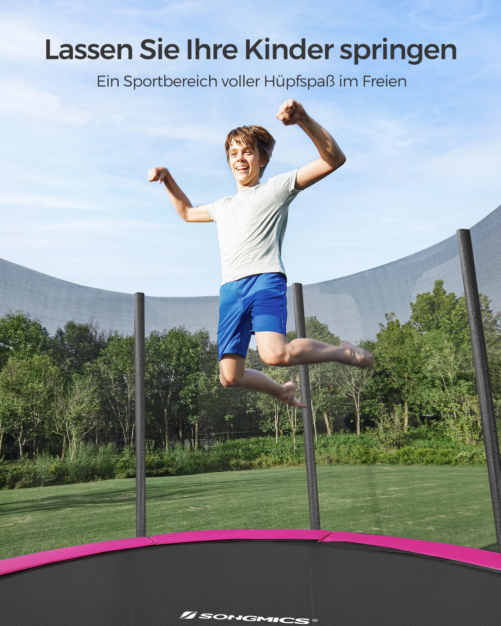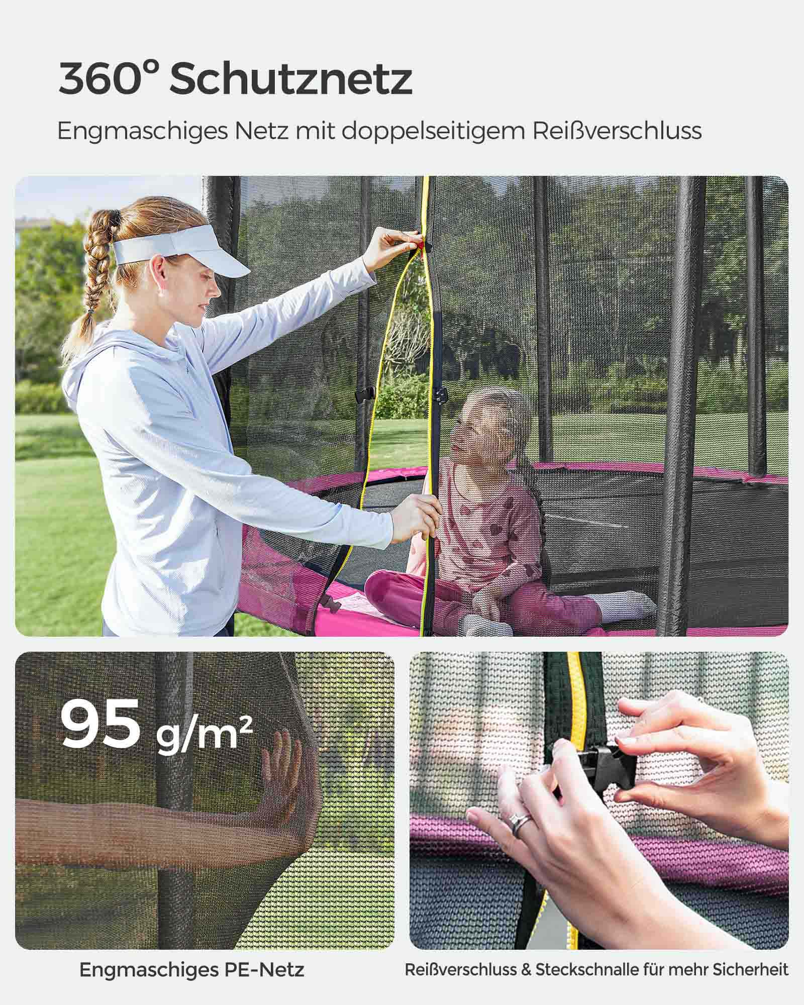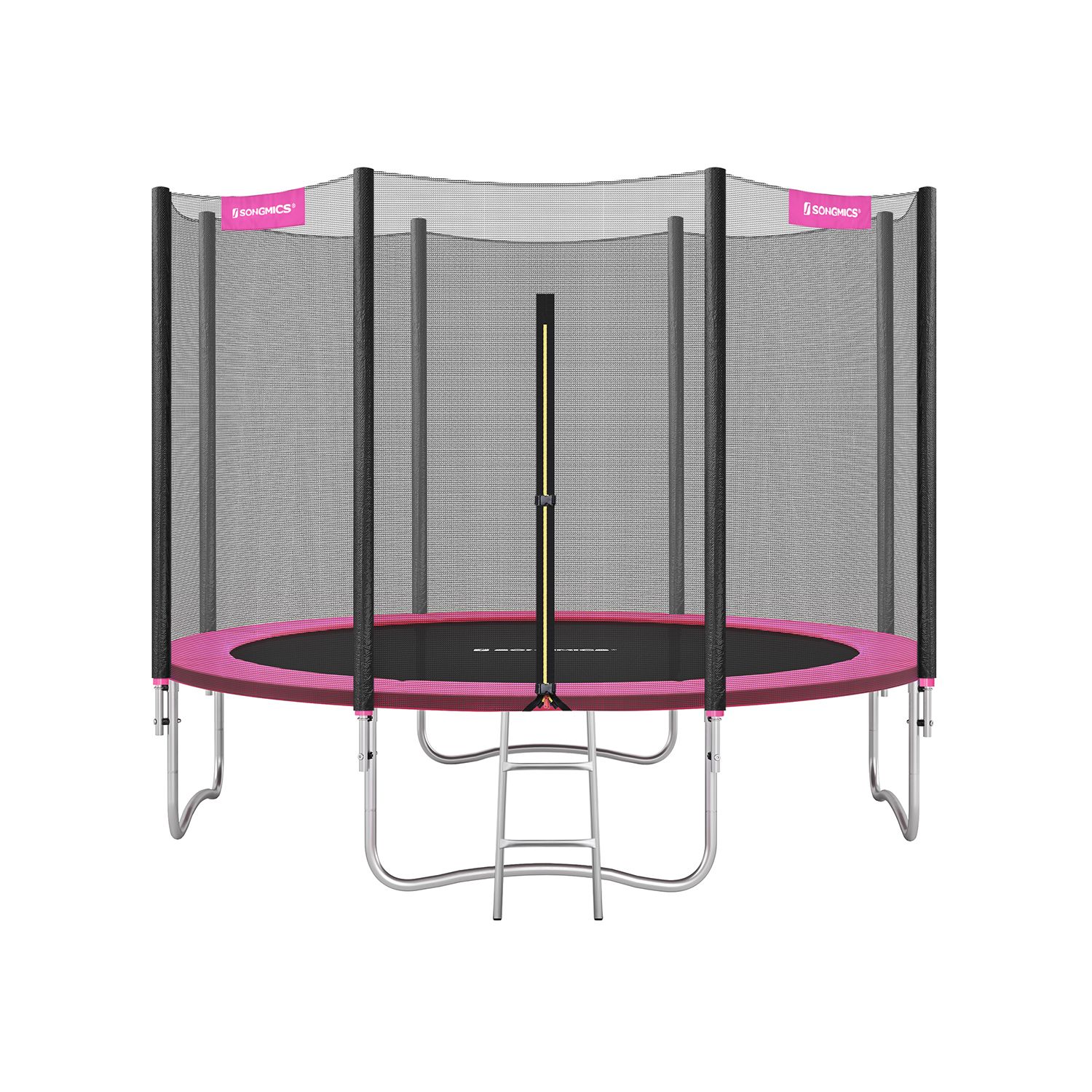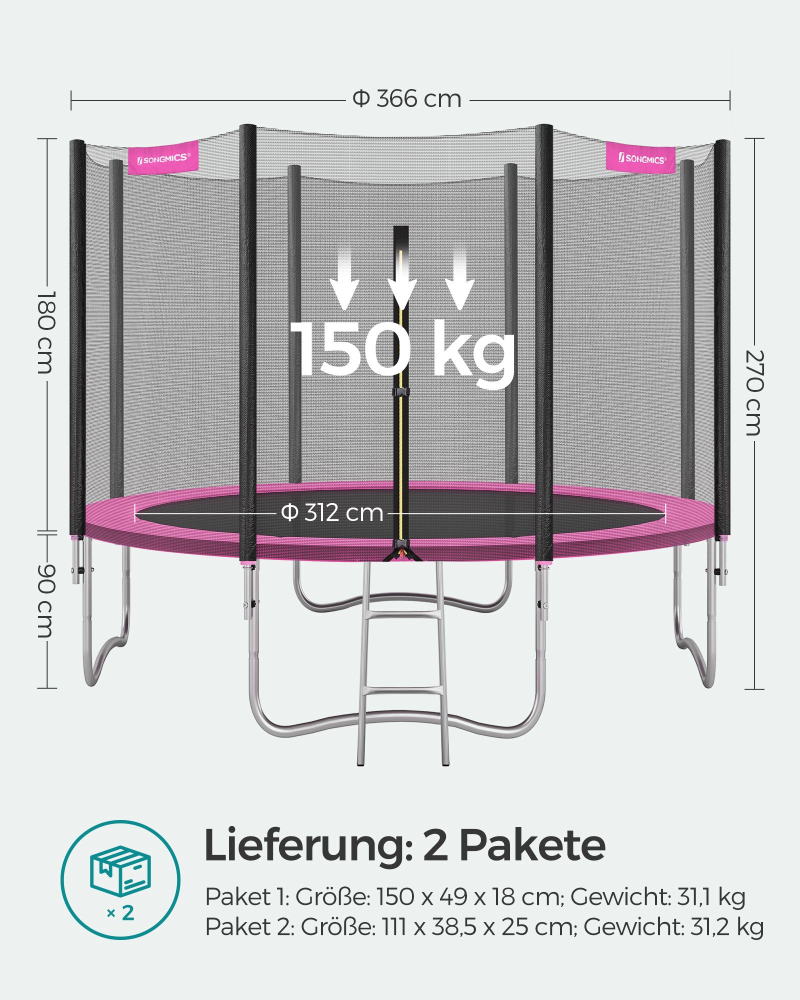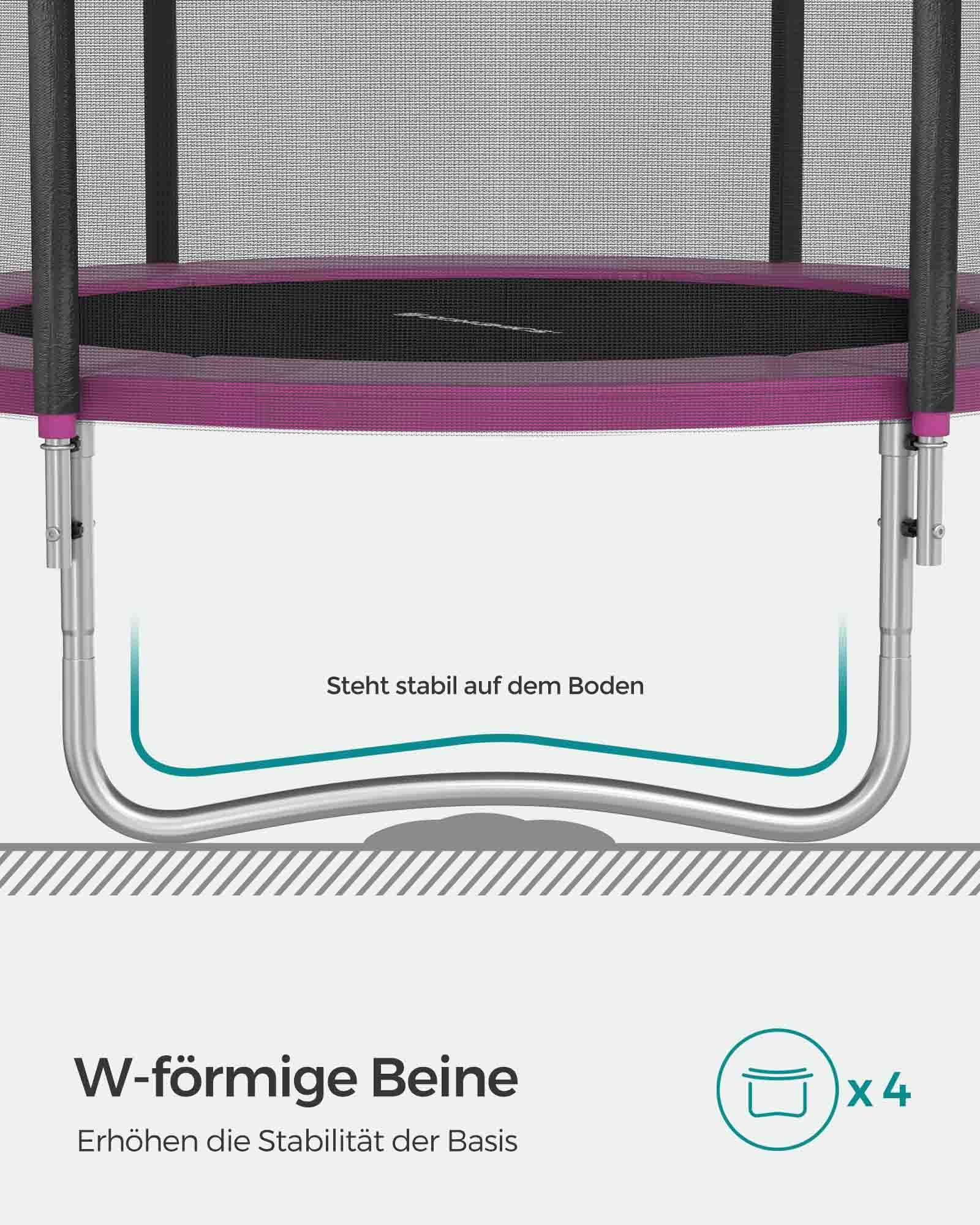 Hav det sjovt i haven! Denne 366 cm store trampolin er perfekt til at hoppe rundt i haven p? en varm eftermiddag (eller endda til lidt fitness). Lad ogs? dine b?rn hoppe efter hjertets lyst p? denne trampolin fra SONGMICS, mens du soler dig eller st?r ved grillen.Sikkerhed har h?jeste prioritet Trampolinspring skal selvf?lgelig f?rst og fremmest v?re sjovt. Men sikkerheden m? ikke komme i anden r?kke. Derfor er denne trampolin udstyret med et meget t?tmasket sikkerhedsnet, der d?mper st?d s?rligt godt. Desuden er nettets st?nger og fjedrene d?kket med EPE-skum, hvilket ogs? reducerer risikoen for skader. Produktdetaljer: – Farve: Pink – Diameter: 366 cm – Ramme materiale: Galvaniseret st?lr?r – Springdug materiale: Polypropylen (265 g/m?) – Sikkerhedspolstring materiale: PVC (310 g/m?), EPE-skum – Afstand mellem gulv og trampolinoverflade: 90 cm – Maks. statisk belastning: 150 kg Leveringsomfang: – 1 x trampolin ? 366 cm – 1 x stige – 1 x tilbeh?rspakke – 1 x vejledning SONGICs bem?rkninger: – Trampolinen b?r altid kun bruges af ?n person. Brug af flere personer samtidig kan f?re til skader. – Udf?r ikke saltomortaler p? trampolinen. – H?ng ikke p? den ?verste kant af sikkerhedsnet. – Fjern alle spidse eller skarpe genstande, inden du g?r p? trampolinen. – Trampolinen er ikke egnet til b?rn under 3 ?r. – Kun egnet til privat brug.