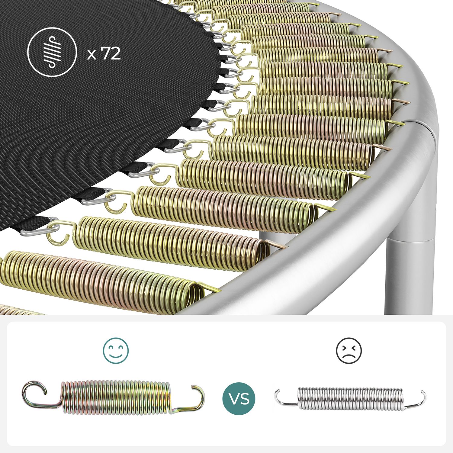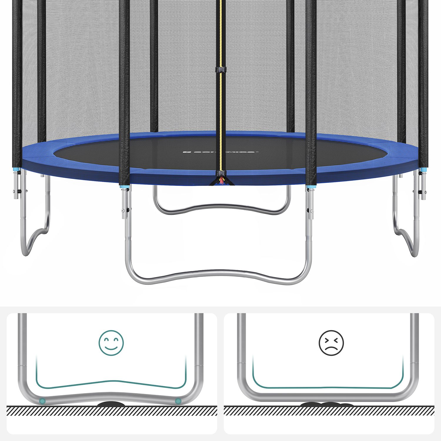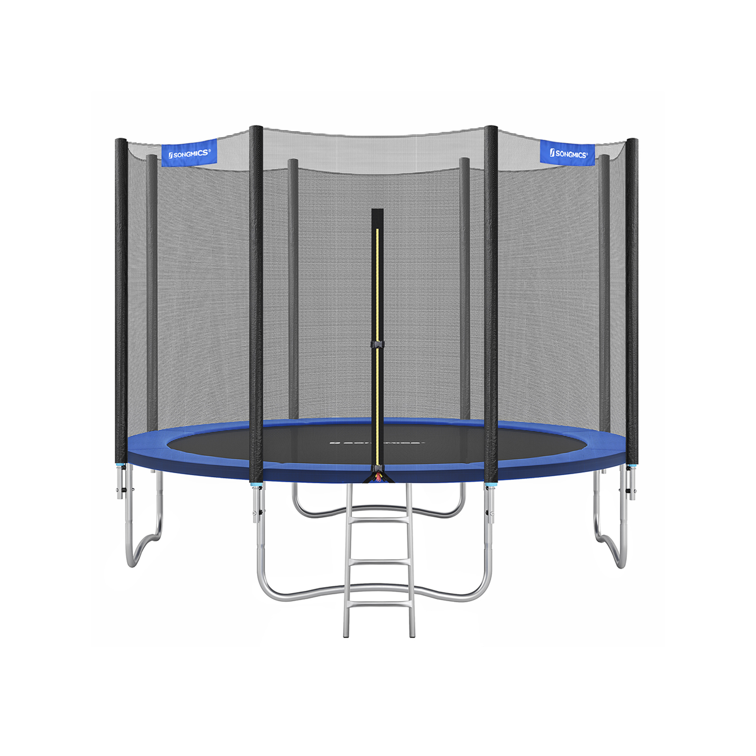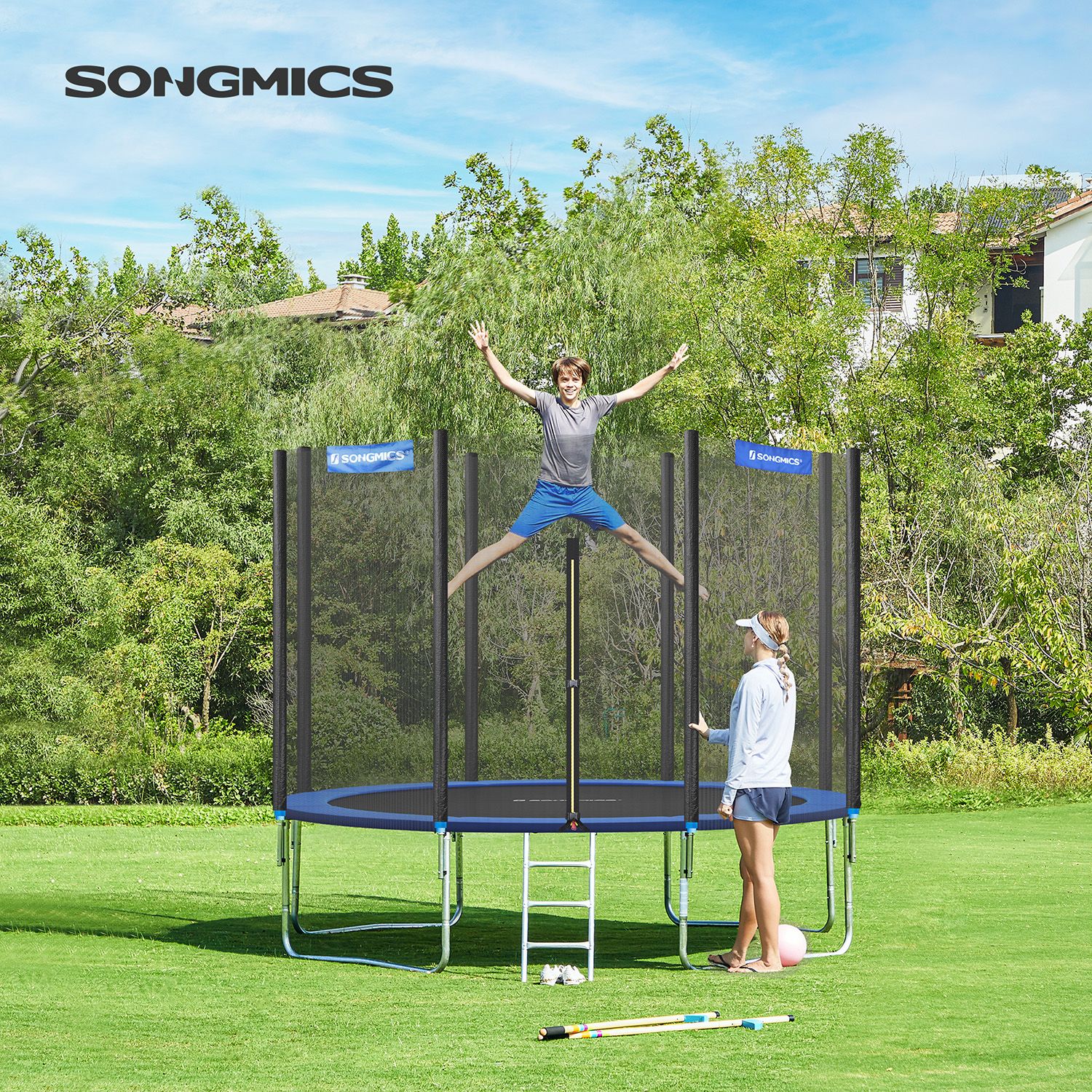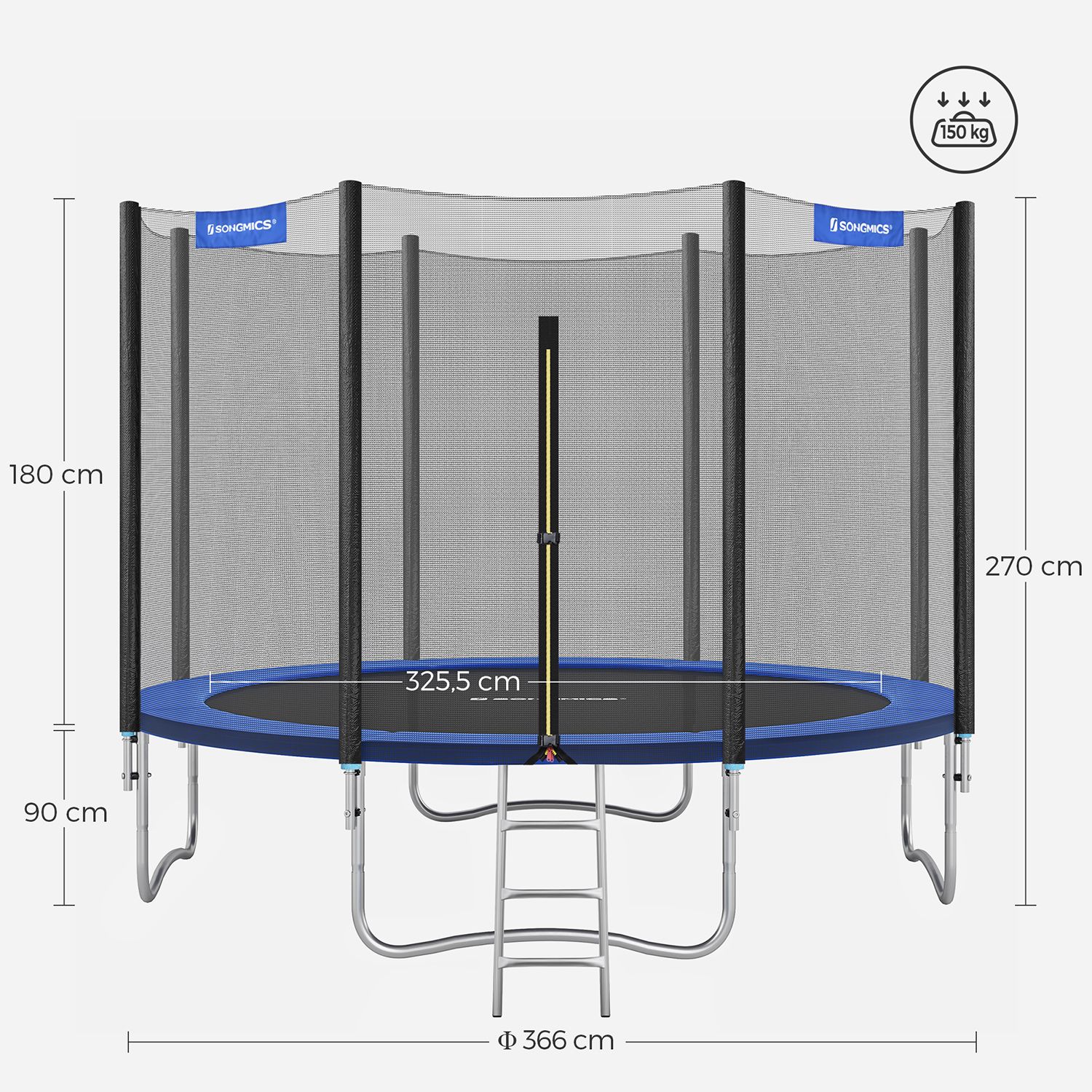 Hav det sjovt i haven! Denne 366 cm store trampolin er perfekt til at hoppe rundt i haven p? en varm eftermiddag (eller endda til lidt fitness). Lad ogs? dine b?rn hoppe efter hjertets lyst p? denne trampolin fra SONGMICS, mens du soler dig eller st?r ved grillen. Sikkerhed har h?jeste prioritet Trampolinhop skal selvf?lgelig f?rst og fremmest v?re sjovt. Men sikkerheden m? ikke komme i anden r?kke. Derfor er denne trampolin udstyret med et meget t?tmasket sikkerhedsnet, der d?mper st?d s?rligt godt. Derudover er nettets st?nger og fjedrene d?kket med EPE-skum, hvilket ogs? reducerer risikoen for skader. Produktdetaljer: – Farve: Sort-bl? – Diameter: 366 cm – Ramme materiale: Galvaniseret st?lr?r – Springdug materiale: Polypropylen (265 g/m2) – Sikkerhedspolstringens materiale: PVC (310 g/m2), EPE-skum – Afstand mellem gulv og trampolins overflade: 90 cm – Maks. statisk belastning: 150 kg Leveringsomfang:- 1 x trampolin ? 366 cm – 1 x stige – 1 x tilbeh?rspose – 1 x vejledning (DE, EN, FR, ES, IT) SONGMICS Bem?rkninger: – Trampolinen m? kun benyttes af ?n person ad gangen. Brug af flere personer p? samme tid kan f?re til skader. – Udf?r ikke saltomortaler p? trampolinen. – H?ng ikke p? den ?verste kant af sikkerhedsnet. – Fjern alle spidse eller skarpe genstande, f?r du g?r p? trampolinen. – Trampolinen er ikke egnet til b?rn under 3 ?r. – Kun egnet til privat brug.