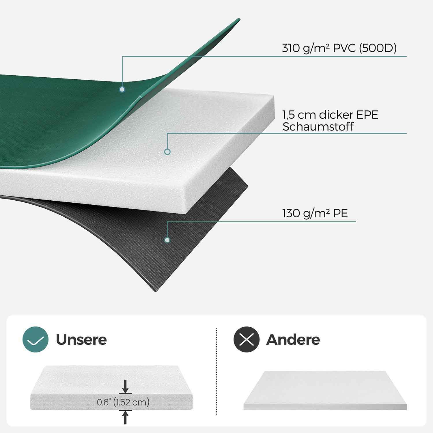 Materiale: 310 g/m? PVC (500D), 1,5 cm tykt EPE-skum, 130 g/m? PE
