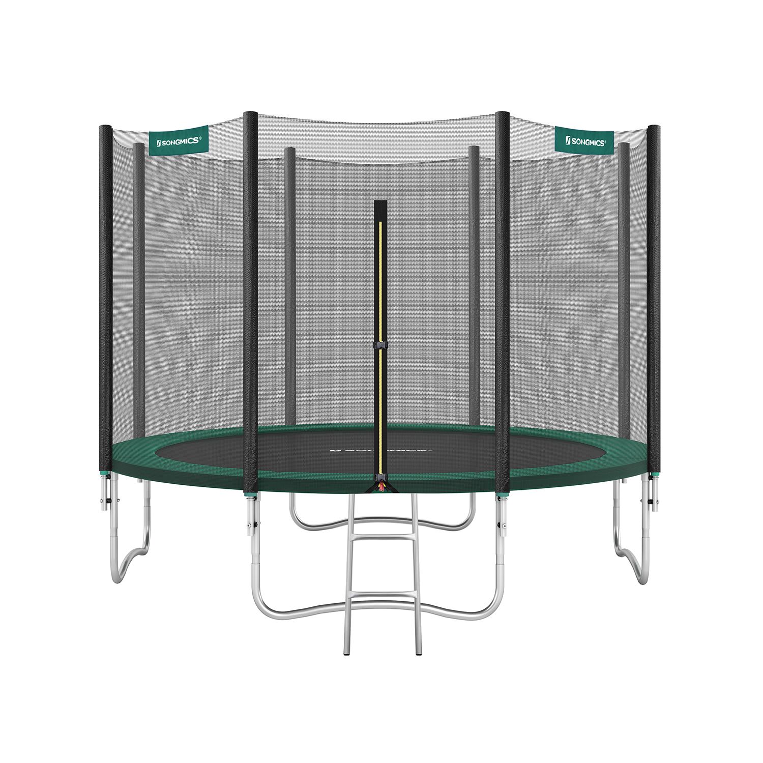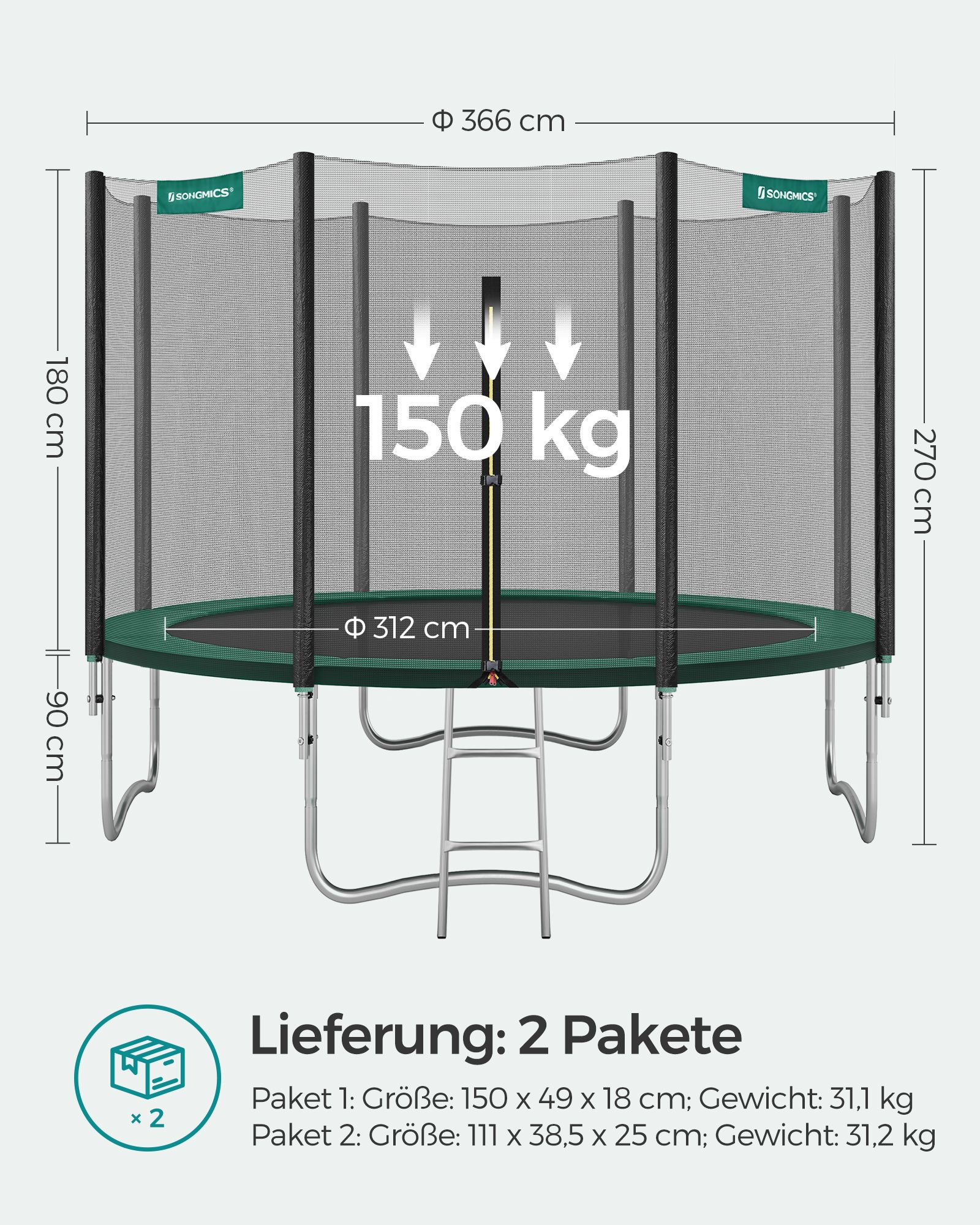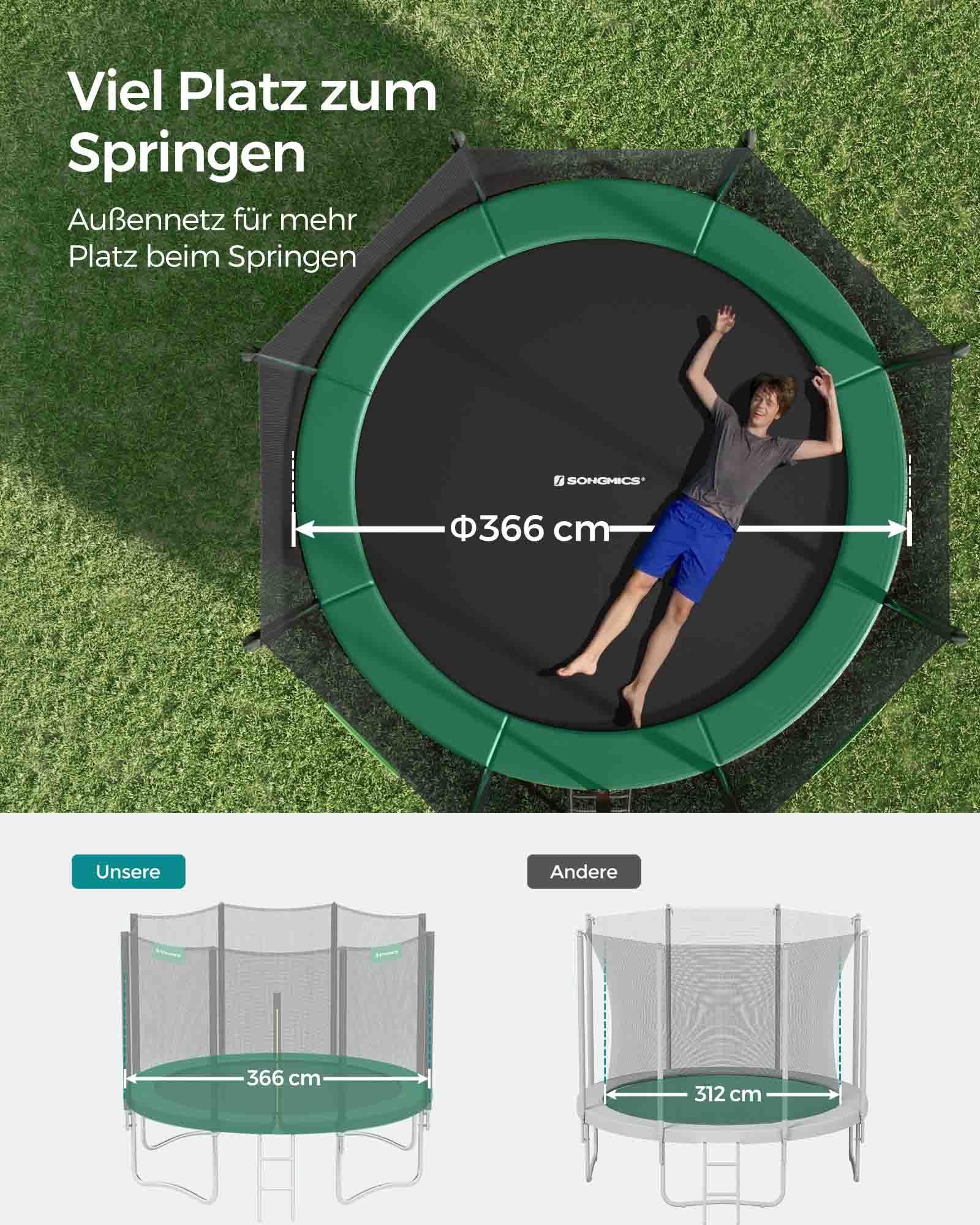 Hav det sjovt i haven!: Denne 366 cm store trampolin er perfekt til at hoppe rundt i haven p? en varm eftermiddag (eller endda til lidt fitness). Lad ogs? dine b?rn hoppe efter hjertets lyst p? denne trampolin fra SONGMICS, mens du soler dig eller st?r ved grillen. Sikkerhed har h?jeste prioritet: Trampolinhop skal selvf?lgelig f?rst og fremmest v?re sjovt. Men sikkerheden m? ikke komme i anden r?kke. Derfor er denne trampolin udstyret med et meget t?tmasket sikkerhedsnet, der d?mper st?d s?rligt godt. Derudover er nettets st?nger og fjedrene d?kket med EPE-skum, hvilket ogs? reducerer risikoen for skader. Produktdetaljer: Farve: Sort-gr?n Diameter: 366 cm Ramme materiale: Galvaniseret st?lr?r Springdug materiale: Polypropylen (265 g/m2) Sikkerhedspolstring materiale: PVC (310 g/m2), EPE-skum Afstand mellem gulv og trampolinoverflade: 90 cm Maks. statisk belastning: 150 kg Leveringsomfang: 1 x trampolin ? 366 cm 1 x stige 1 x tilbeh?rspose 1 x vejledning (DE, EN, FR, ES, IT) SONGMICS Bem?rkninger:Trampolinen m? kun benyttes af ?n person ad gangen. Brug af flere personer p? samme tid kan f?re til skader. Udf?r ikke saltomortaler p? trampolinen. H?ng ikke p? den ?verste kant af sikkerhedsnet. Fjern alle spidse eller skarpe genstande, f?r du g?r p? trampolinen. Trampolinen er ikke egnet til b?rn under 6 ?r. Kun egnet til privat brug.