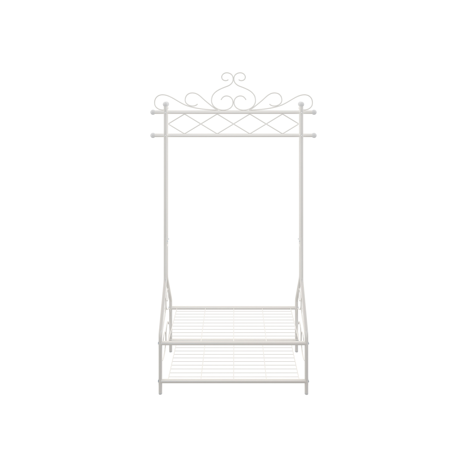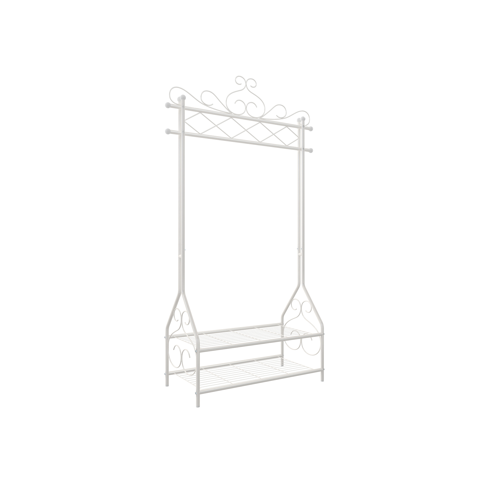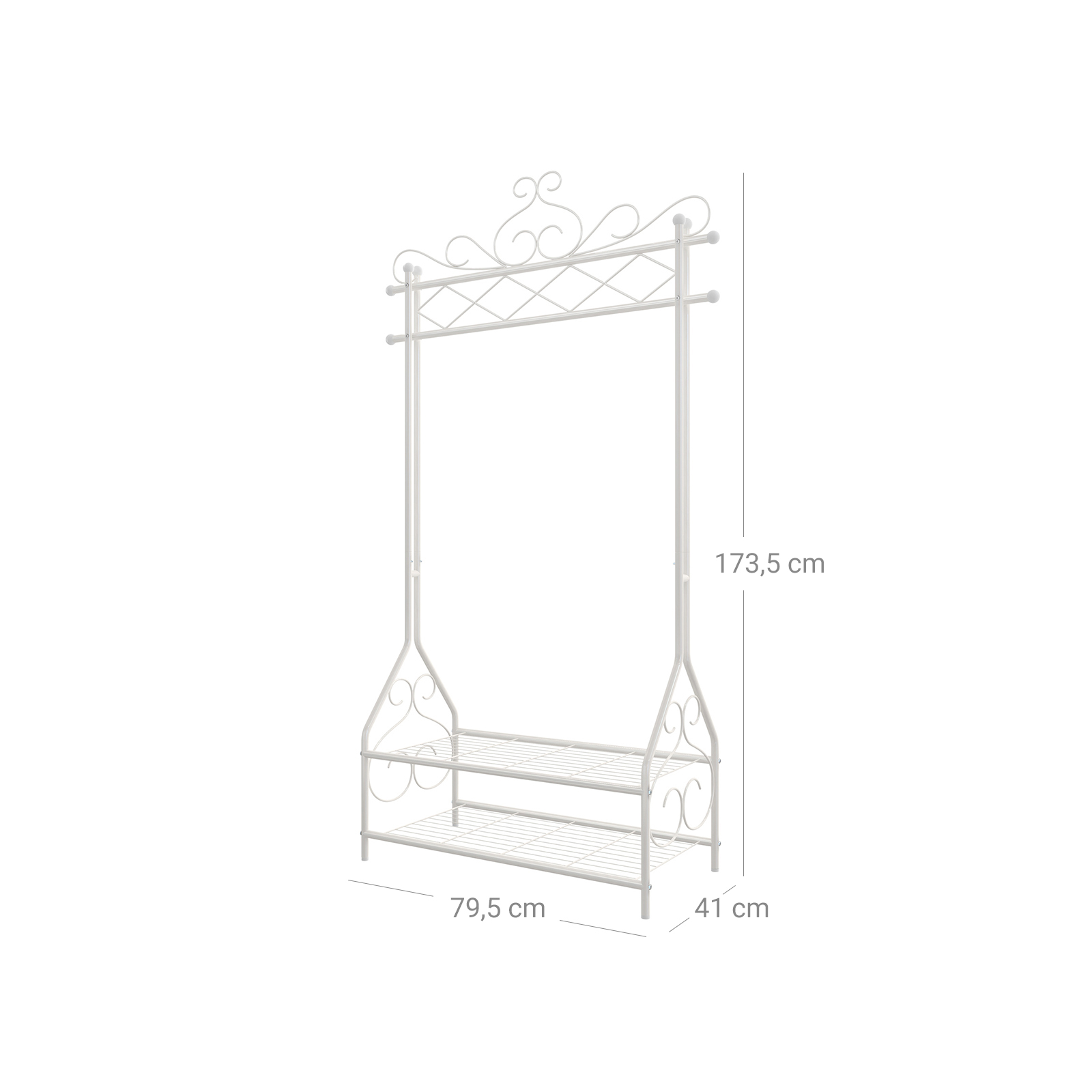 Er dine jakker og frakker som regel stablet i uorden i kl?deskabet? Ligger dine sko stadig og flyder i entreen? Her er l?sningen! ?stetik i vintage-stil Samspillet mellem de buede dekorationer og metalr?rene er typisk for vintage-stilen, og den originale design giver garderobestativet et nostalgisk pr?g i entreen, p? omkl?dningsv?relset, i sovev?relset osv. Perfekt funktionalitet Den ?verste t?jstang og de nederste hylder giver plads nok til t?j, hatte, tasker og sko, og garderobestativet skaber orden i din bolig. Det er meget velegnet til b?de organisering af din private garderobe og til varepr?sentation i butikken. SONGMICS garderobestativ er uundv?rlig for et ryddeligt hjem, da det kombinerer funktionalitet og ?stetik p? optimal vis. Produktdetaljer: – Farve: beige – Materiale: pulverlakeret jernr?r – Samlede m?l: 92 x 173 x 41 cm (B x H x D) – M?l for hver hylde: 76 x 40 cm – V?gt: 5,6 kg – Maks. belastbarhed – B?jlestang: 25 kg – Hver hylde: 10 kg Leveringsomfang: – 1 x t?jstativ – 1 x vejledning (DE, EN, FR, IT, ES)