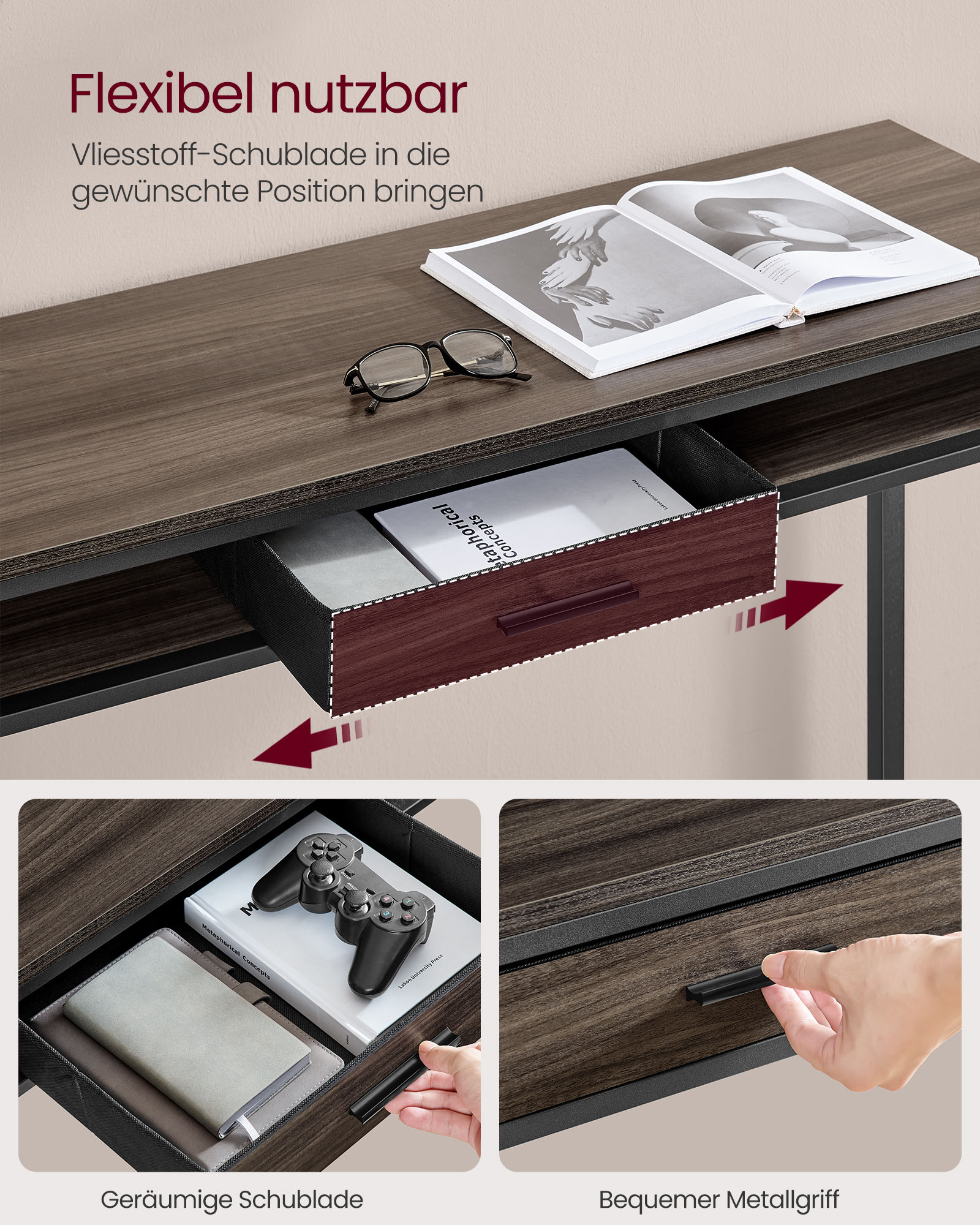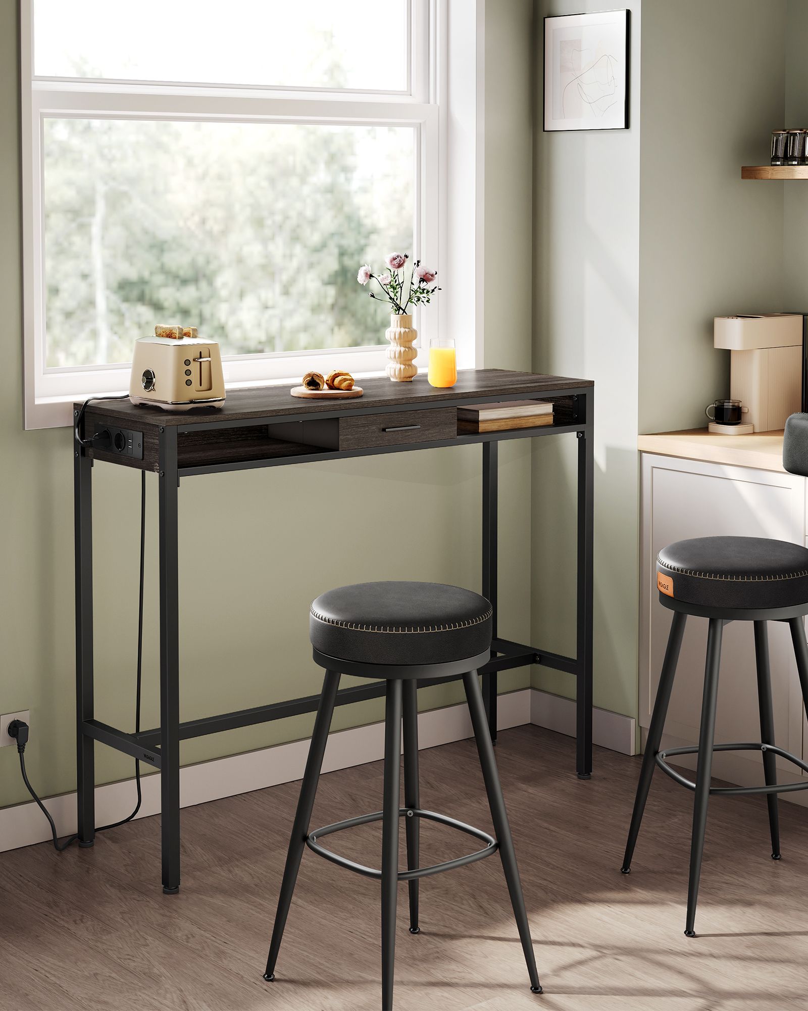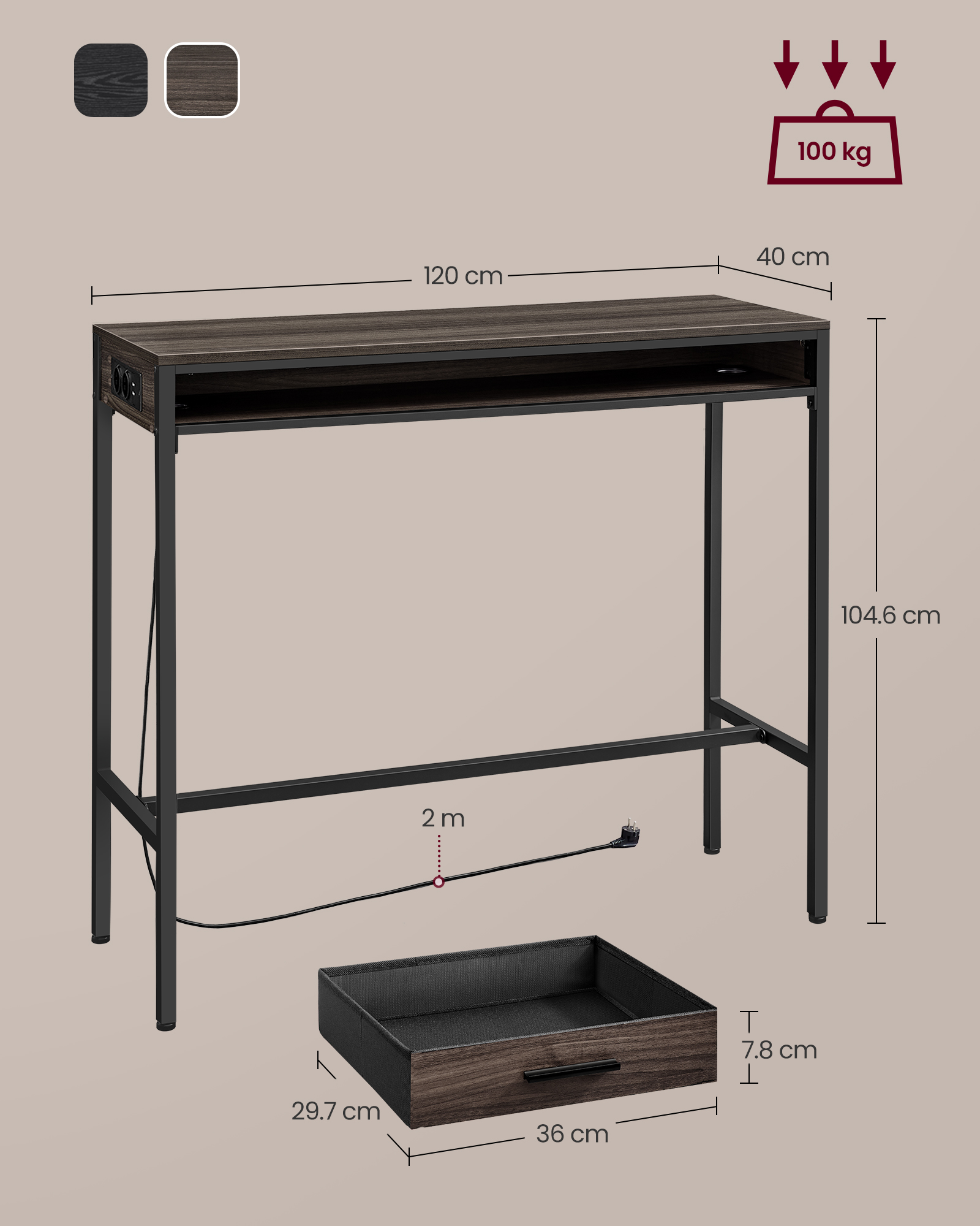 VASAGLE Bartisch, st?ende bord med opladestation og fleksibel skuffe af fleece, kroge, 40 x 99,8 x 104,6 cm, askebrun LBT019K02