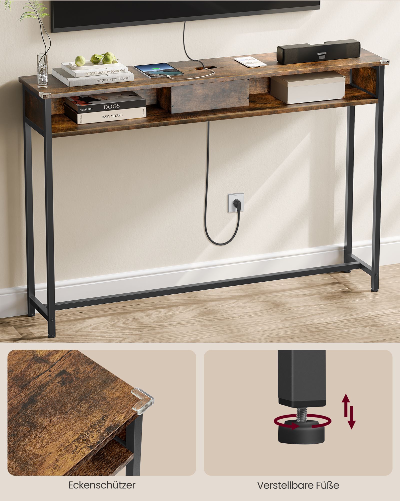 VASAGLE konsolbord med stikkontakter, sidebord med 2 rum, smalt, 25 x 120 x 81,1 cm, pladsbesparende, til entr?, stue