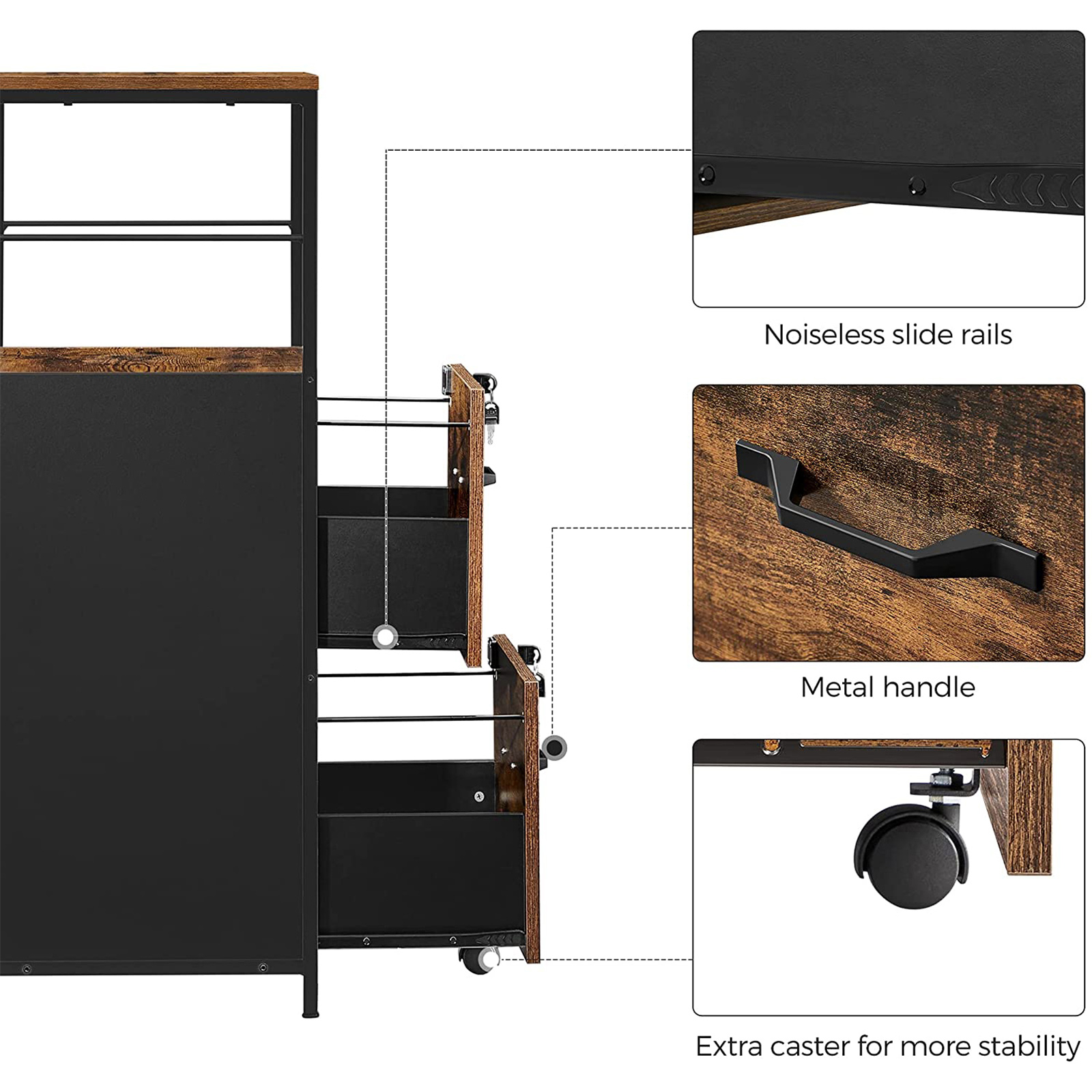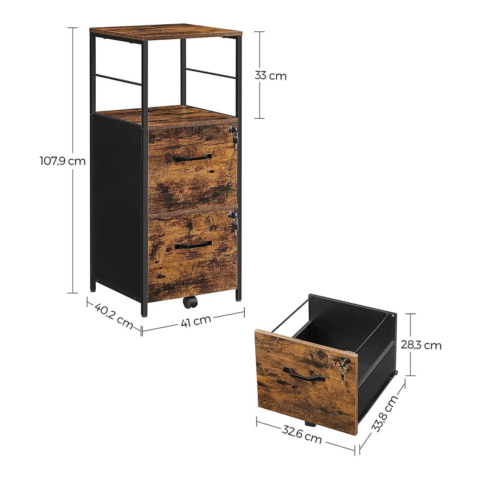 Produktdetaljer: – Farve: Vintagebrun-sort – Materiale: Sp?nplade, st?l – St?rrelse: 41 x 40,2 x 107,9 cm (L x B x H) – H?jde p? det ?bne rum: 33 cm – Indvendig st?rrelse p? skuffen: 32,6 x 33,8 x 28,3 cm (L x B x H) – V?gt: 23 kg – Maks. samlet statisk belastning: 50 kg Leveringsomfang: – 1 x arkivskab – 1 x tilbeh?rspakke – 1 x v?ltesikring – 1 x vejledning VASAGLE Bem?rkninger: – B?rn m? ikke klatre p? eller lege med produktet for at undg? skader som f?lge af v?ltning.