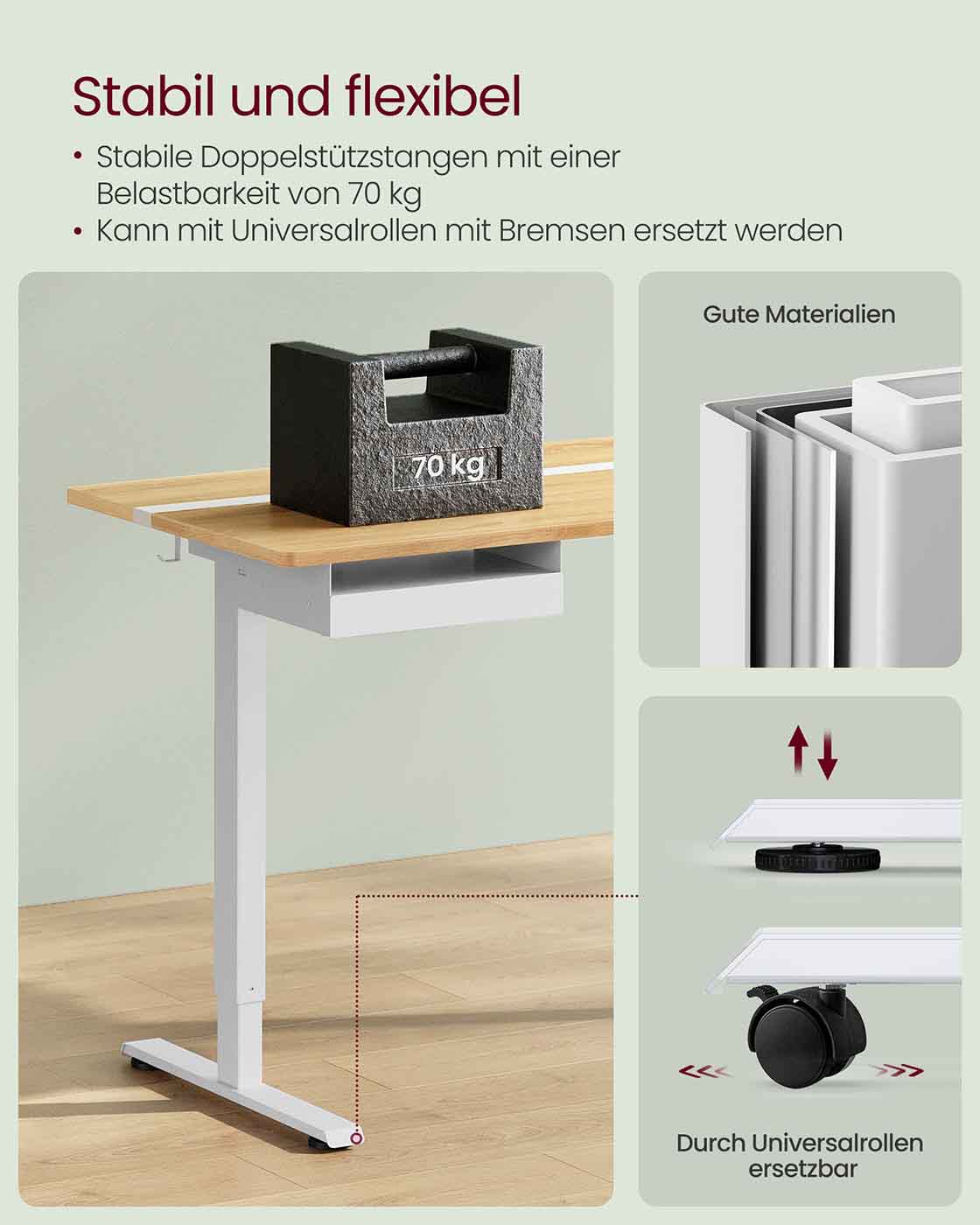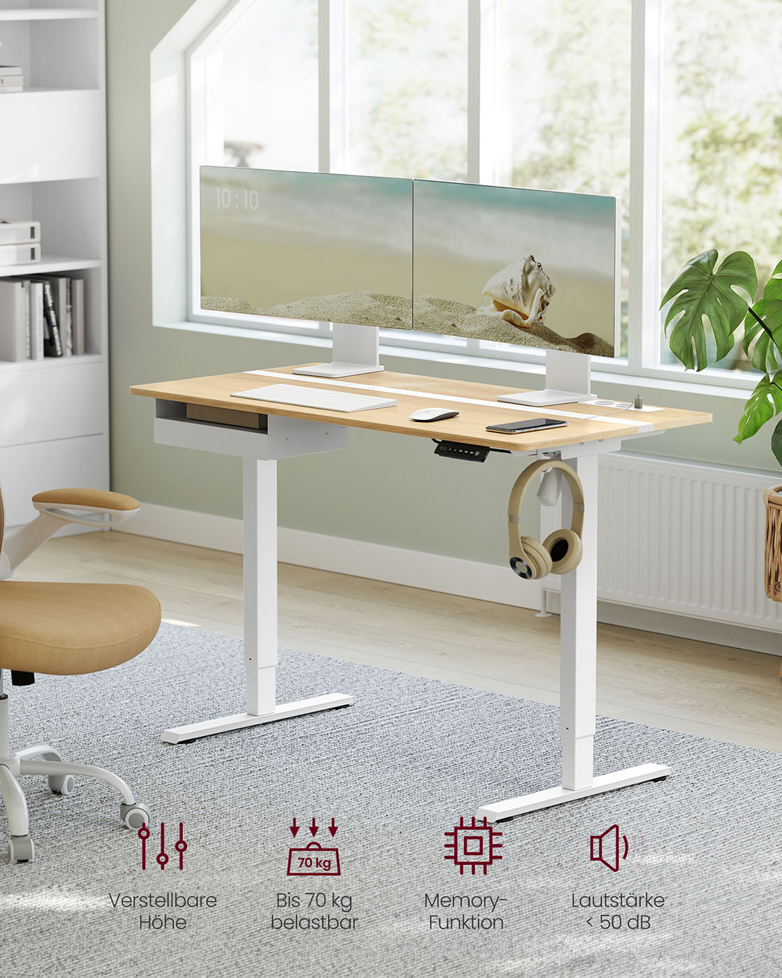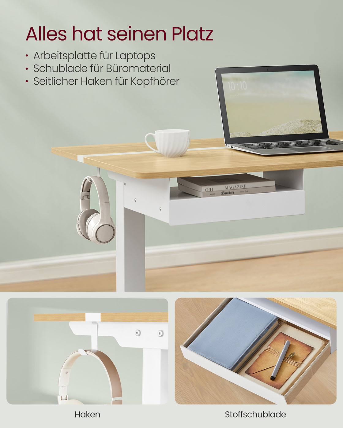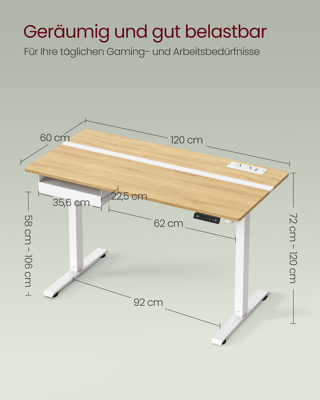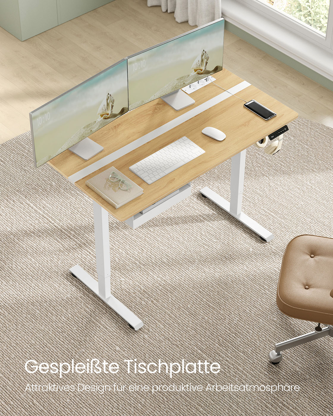 VASAGLE Elektrisk h?jdejusterbart skrivebord med stikkontakt og skuffe, 60 x 140 cm bordplade, trinl?st justerbar, hukommelsesfunktion med 4 h?jder, hvid LSD114W01
