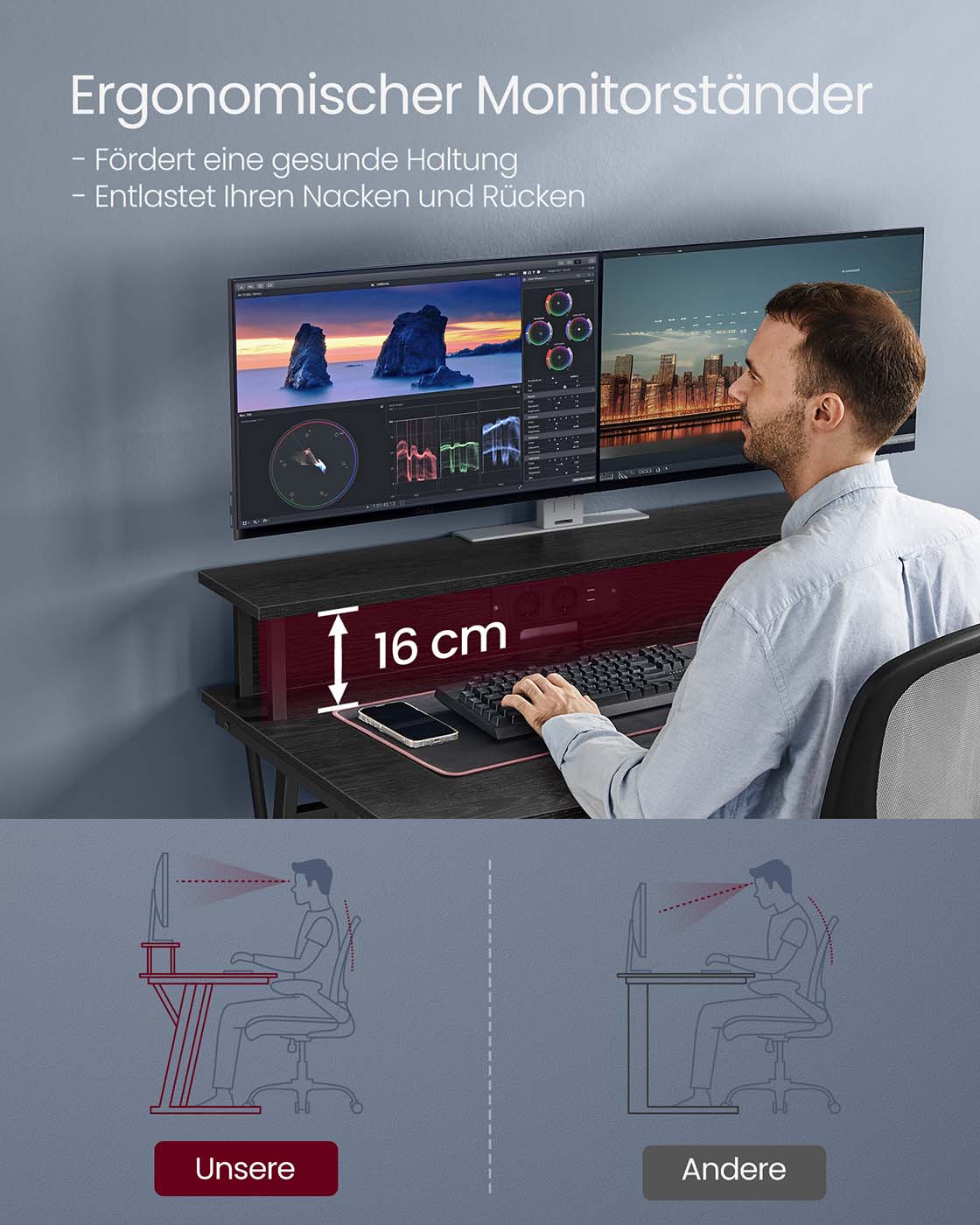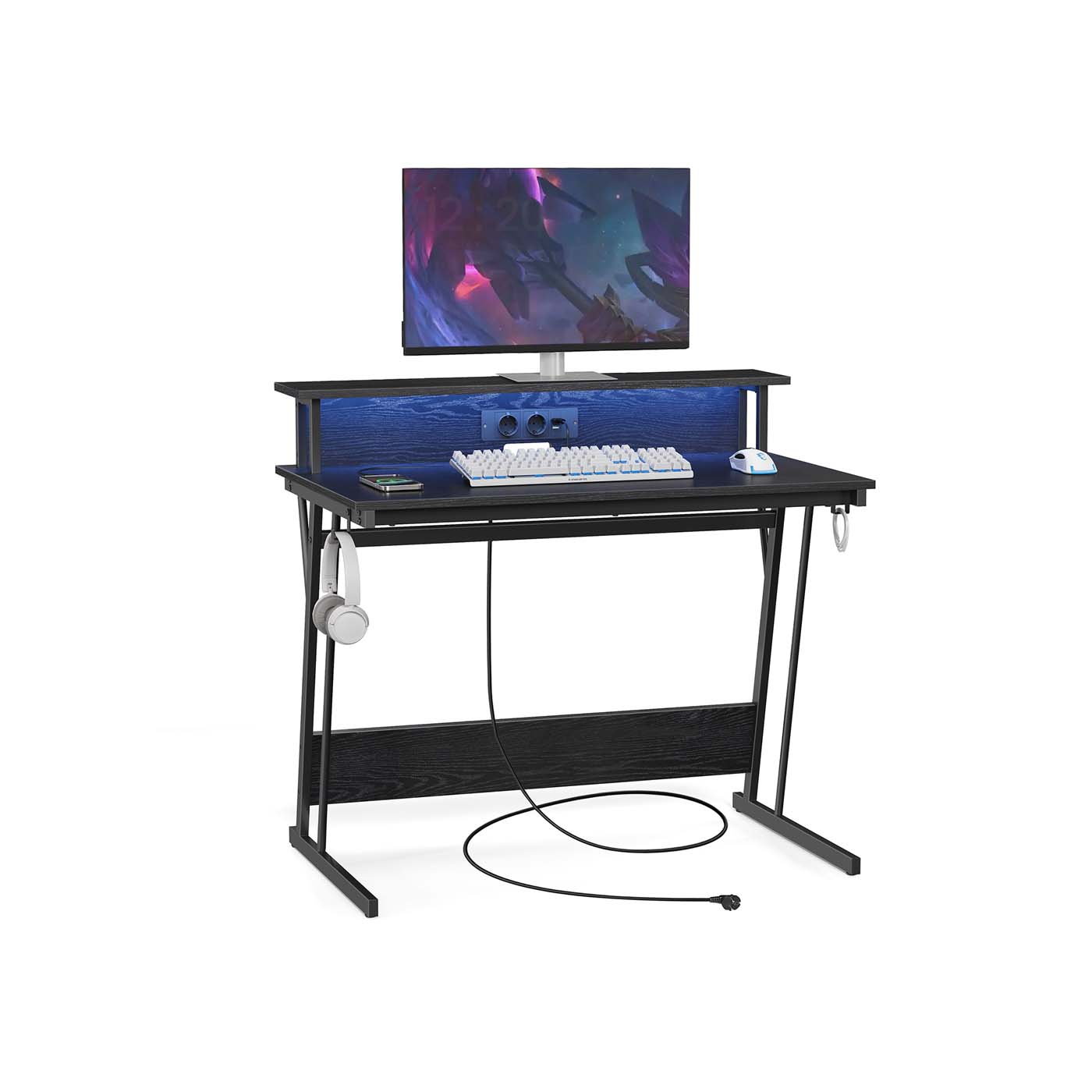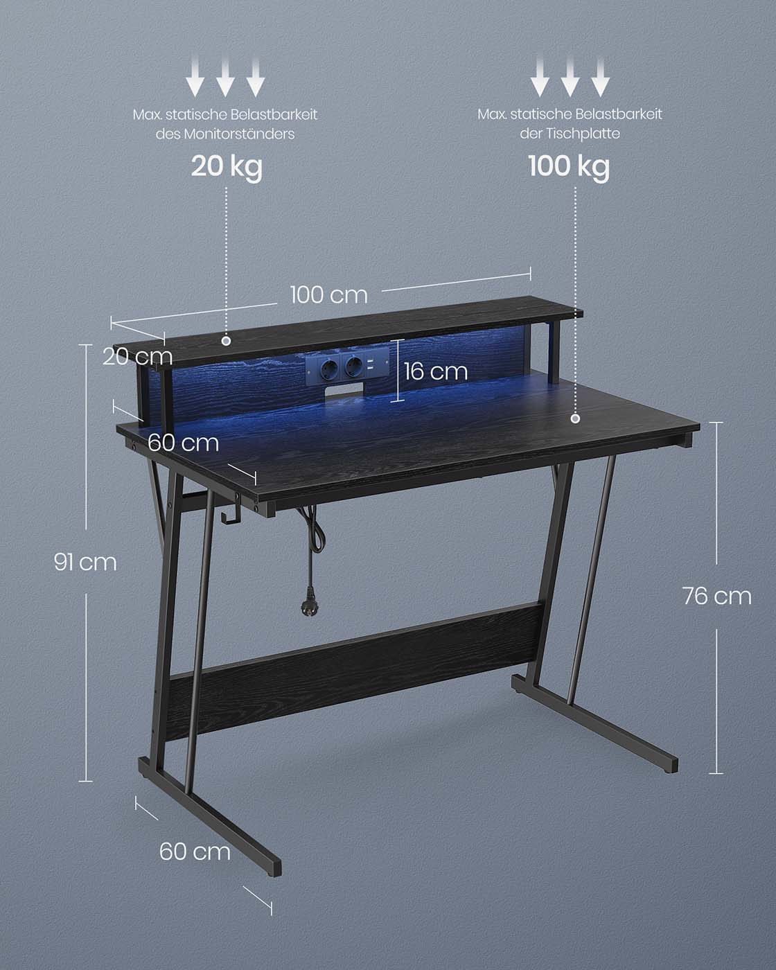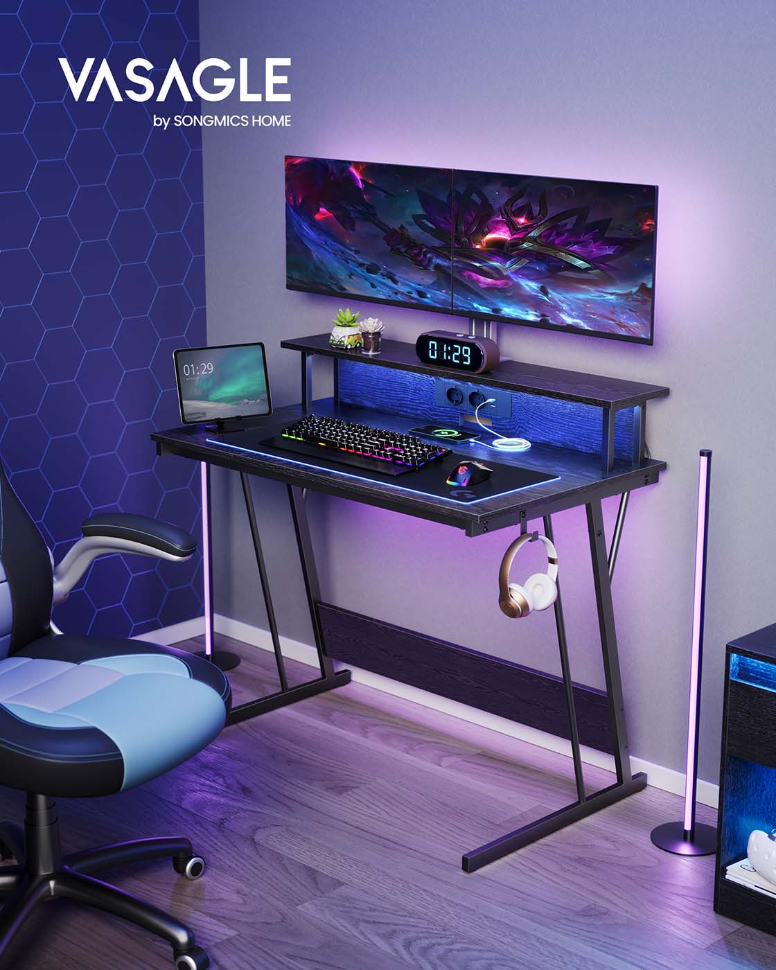 VASAGLE Gaming-bord med LED-belysning, skrivebord med indbygget stikd?se, computerbord, monitorholder til 2 sk?rme, sovev?relse
