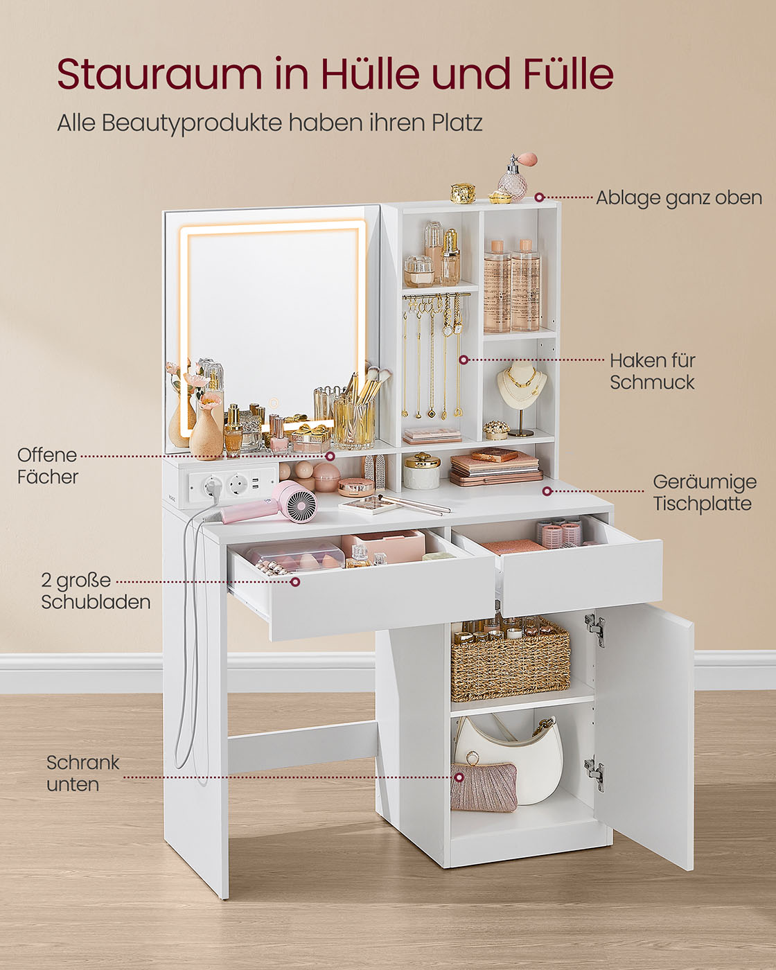 VASAGLE toiletbord med LED-belysning, stikd?se, toiletbord med skuffer, 90 cm bredt, justerbare hylder, smykkeskrin, til sovev?relset, skyhvid RDT134W01