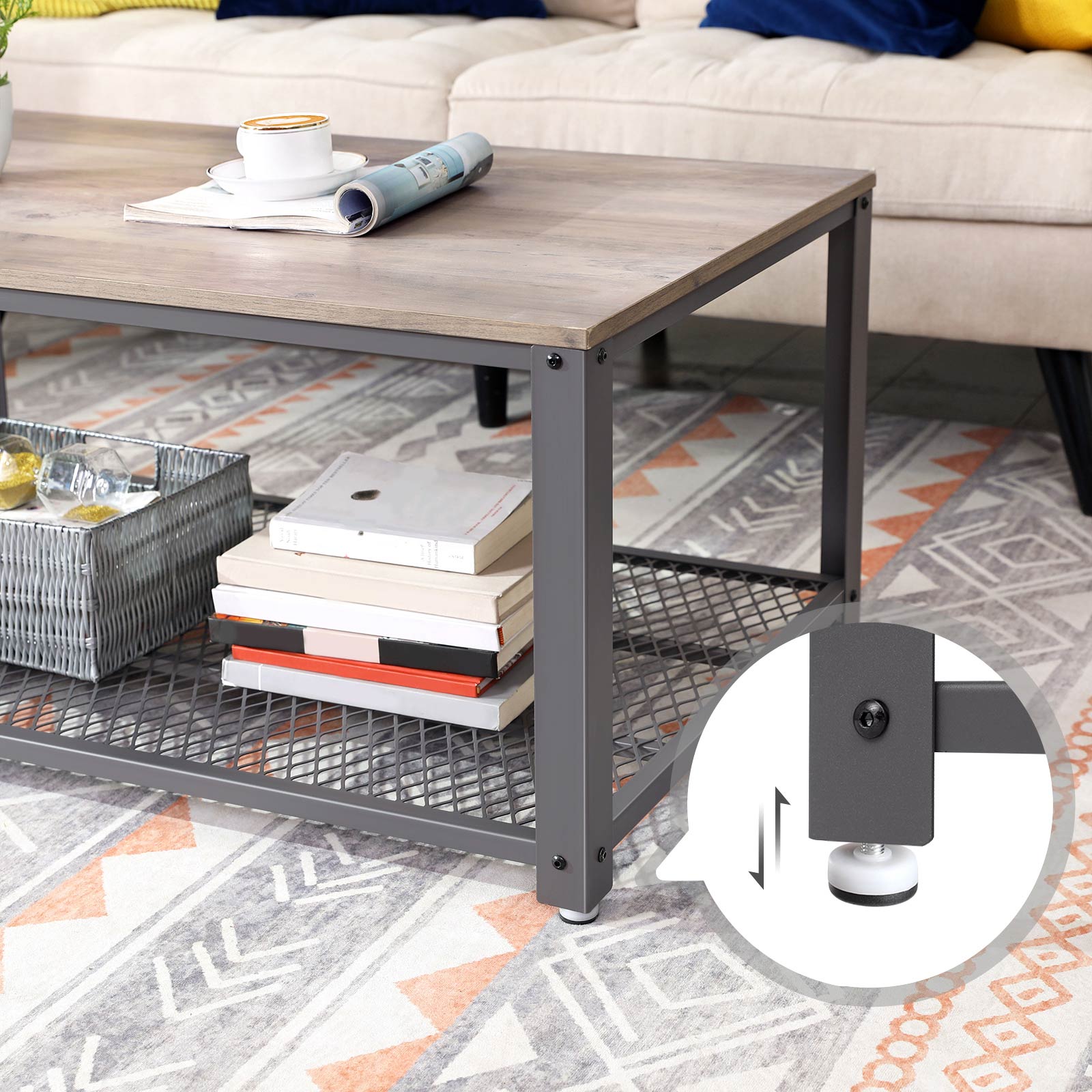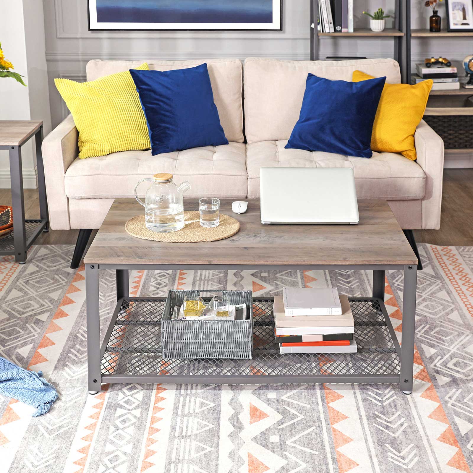 Produktdetaljer: – Farve: Greige-gr? – Materiale: Sp?nplader, jern – St?rrelse: 106,2 x 60,2 x 45 cm (L x B x H) – V?gt: 13,7 kg – Maks. statisk belastning bordplade: 120 kg – Maks. statisk belastning hylde nedenunder: 40 kg Leveringsomfang:- 1 x sofabord – 1 x tilbeh?rspose – 1 x vejledning (DE, EN, FR, IT, ES) VASAGLE Bem?rkninger: – Af sikkerhedsm?ssige ?rsager er det forbudt for b?rn at klatre p? eller lege med produktet.
