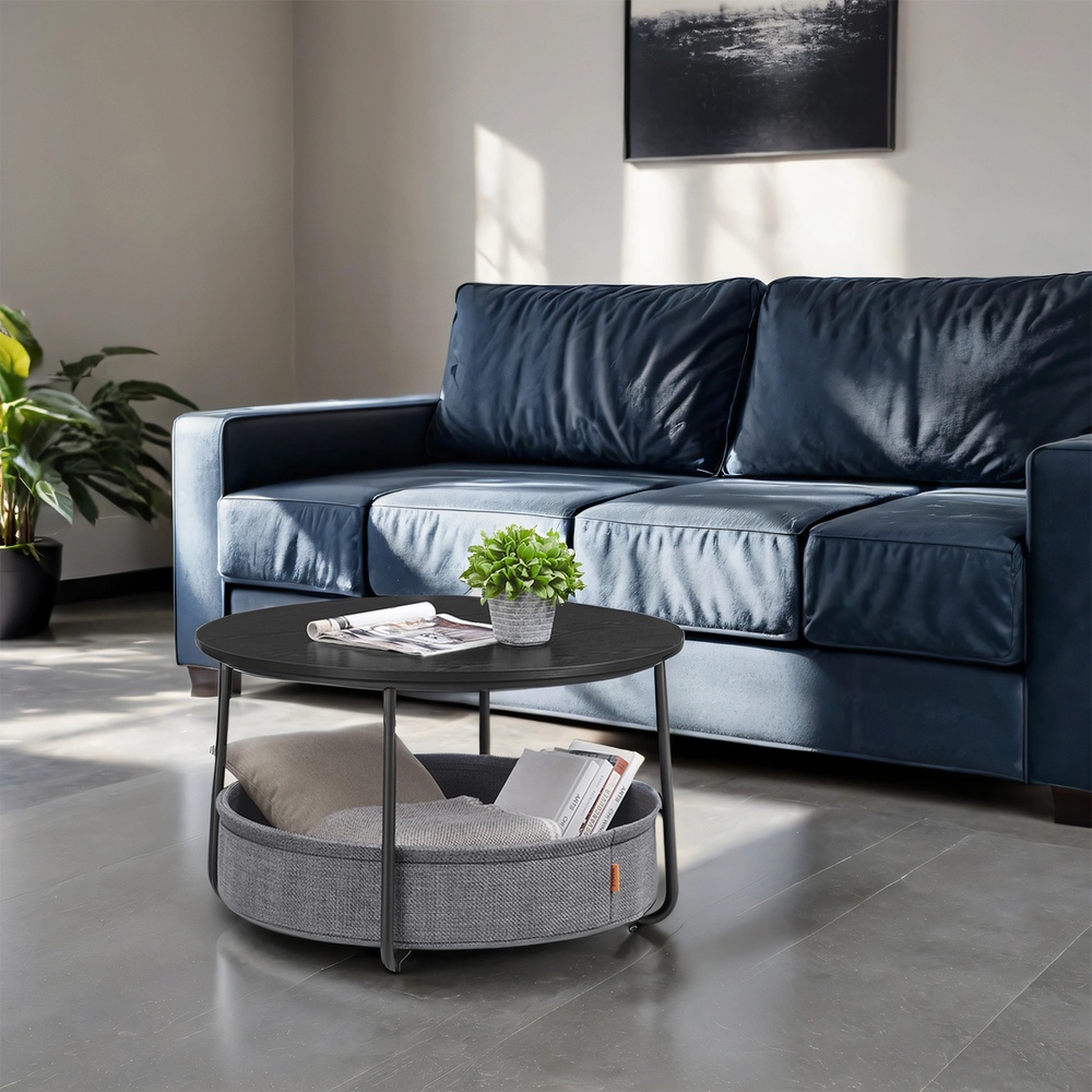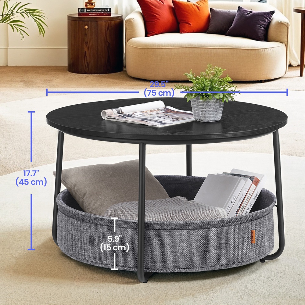 VASAGLE Rund sofabord, bord med opbevaringsplads, sidebord, stuebord med kurv i stof, moderne, metalstel, bl?ksort-skifergr? LCT244B56