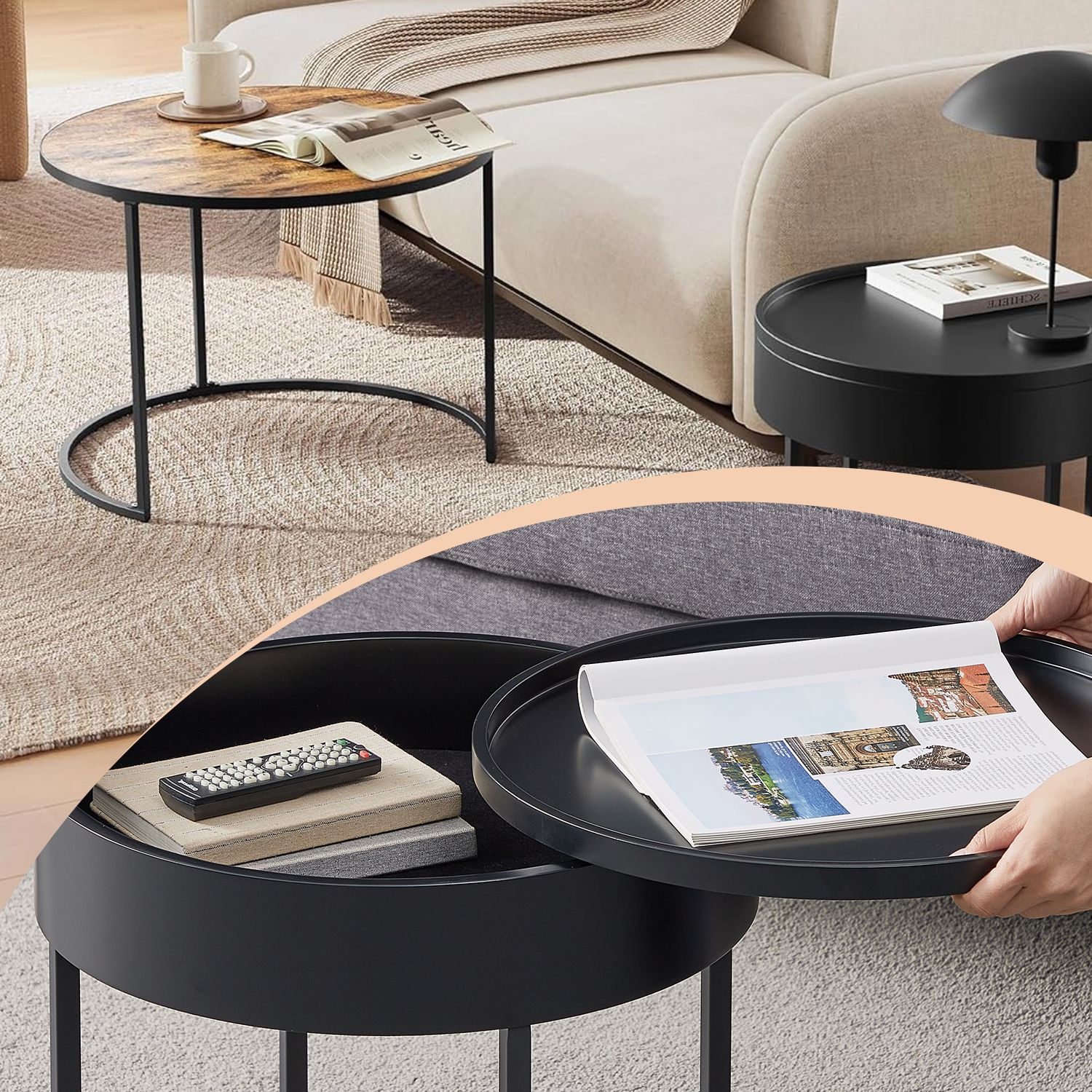 VASAGLE Sofabord, rund, 2 stk. s?t, sidebord, s?tbord, moderne, skjult opbevaringsplads, bakke, til stue, sovev?relse, altan, vintagebrun-bl?ksort LCT044K01