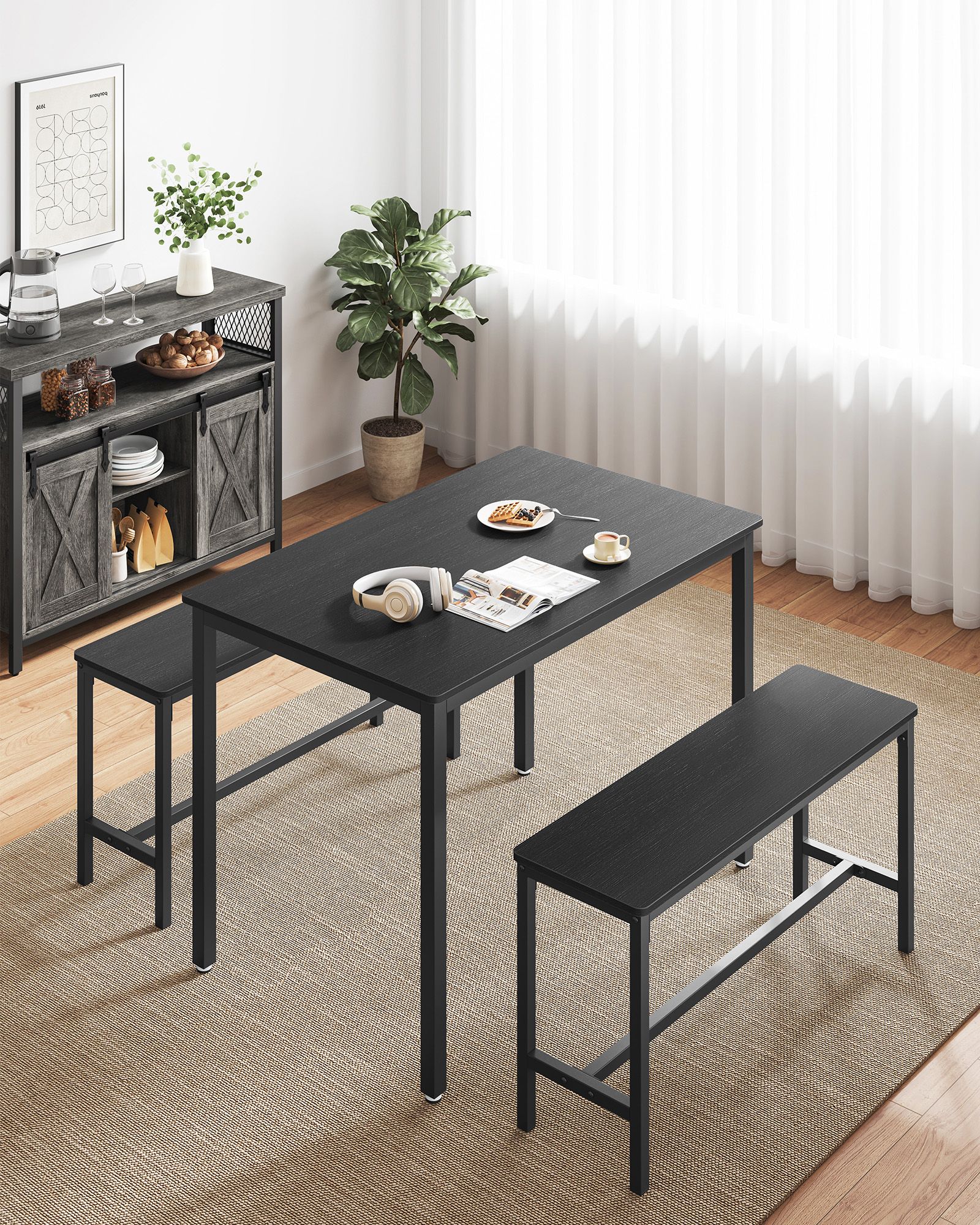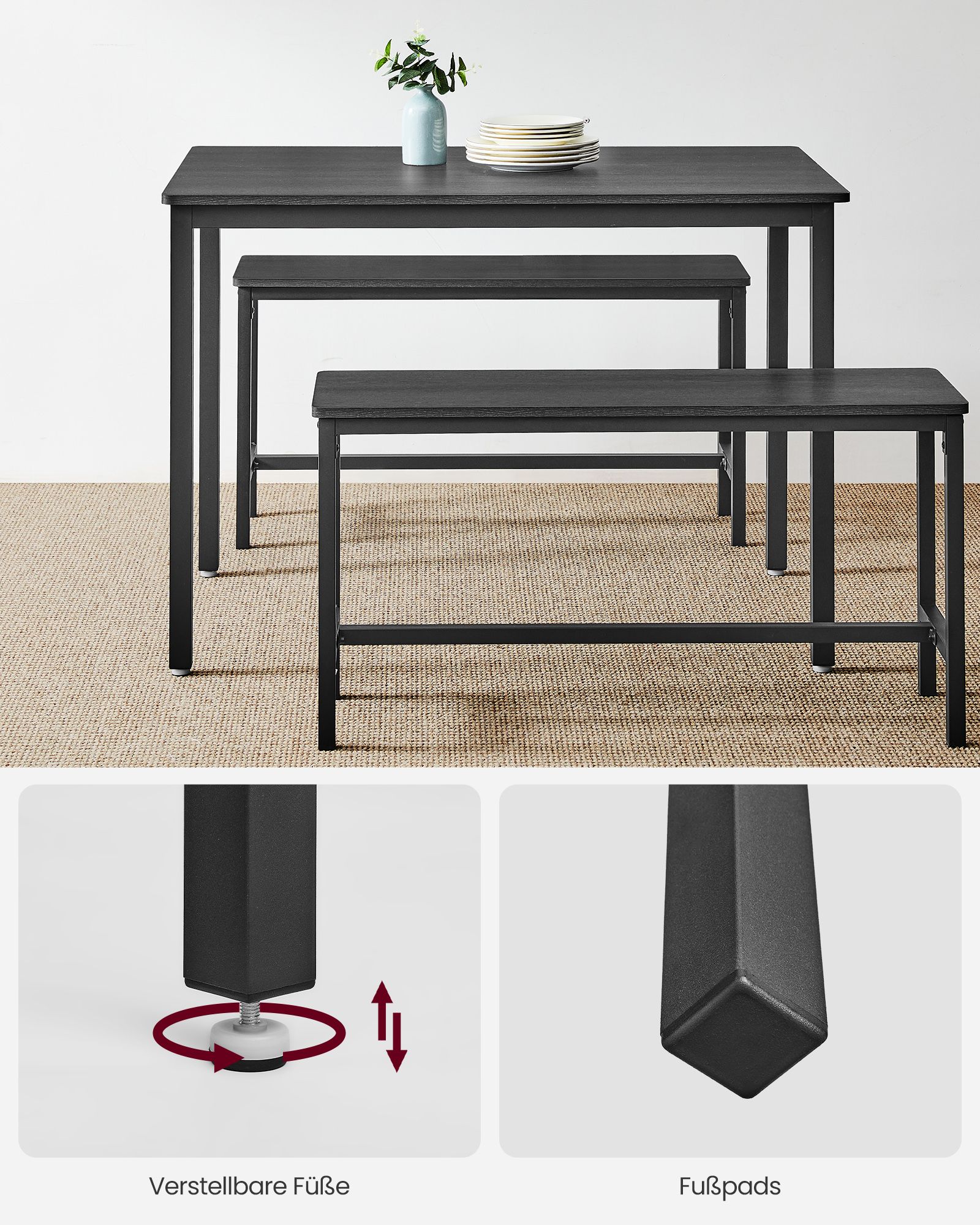 VASAGLE Spisebord, k?kkenbordss?t, 110 x 70 x 75 cm, med 2 b?nke p? hver 97 x 30 x 50 cm, metalstel, til k?kken, stue, spisestue, industrielt design, vintagebrun-sort KDT070B01