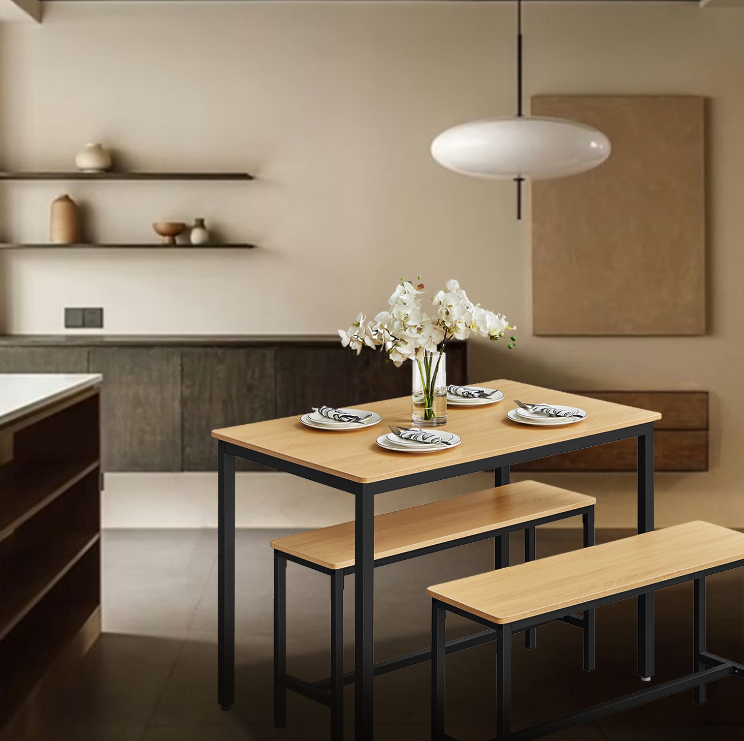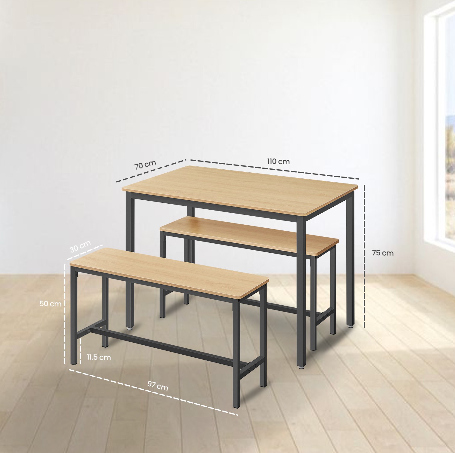 Spisebord med 2 b?nke, k?kkenbord, spisestueb?nke, st?lstel, industrielt design, vintagebrun-sort