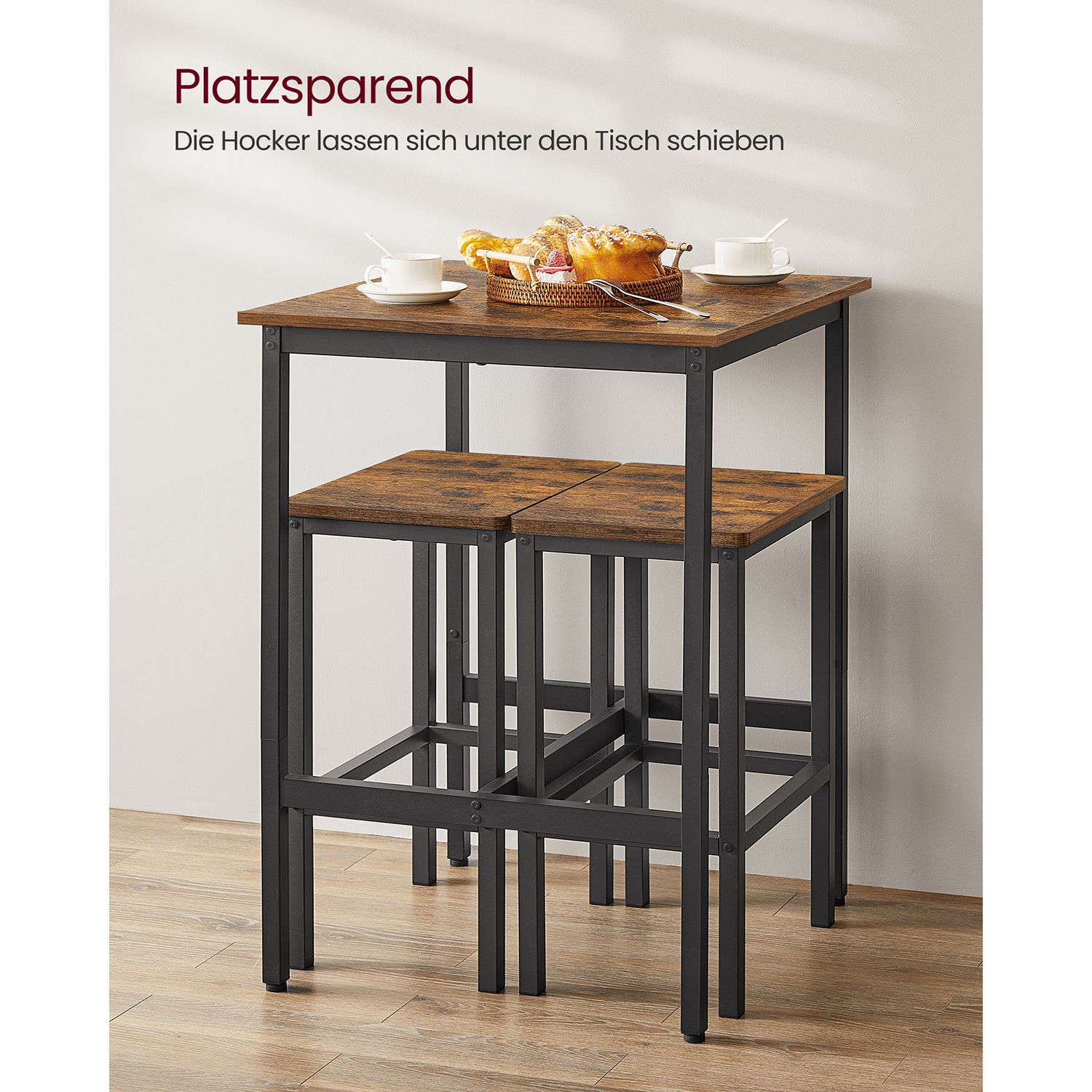 VASAGLE Bartisch med barstole-s?t, spisebord med 2 stole, k?kkenbord lille 60 x 60 x 90 cm, barstole hver 30 x 40 x 65 cm, til spisestue, k?kken, industrielt design, vintagebrun-sort LBT017B01