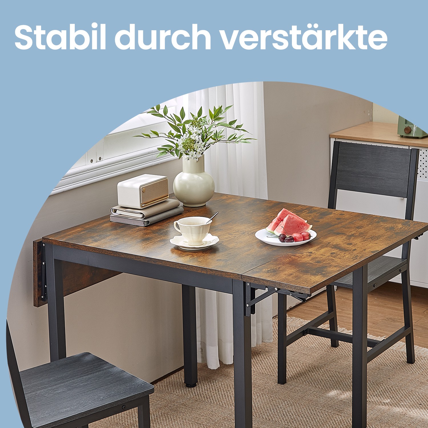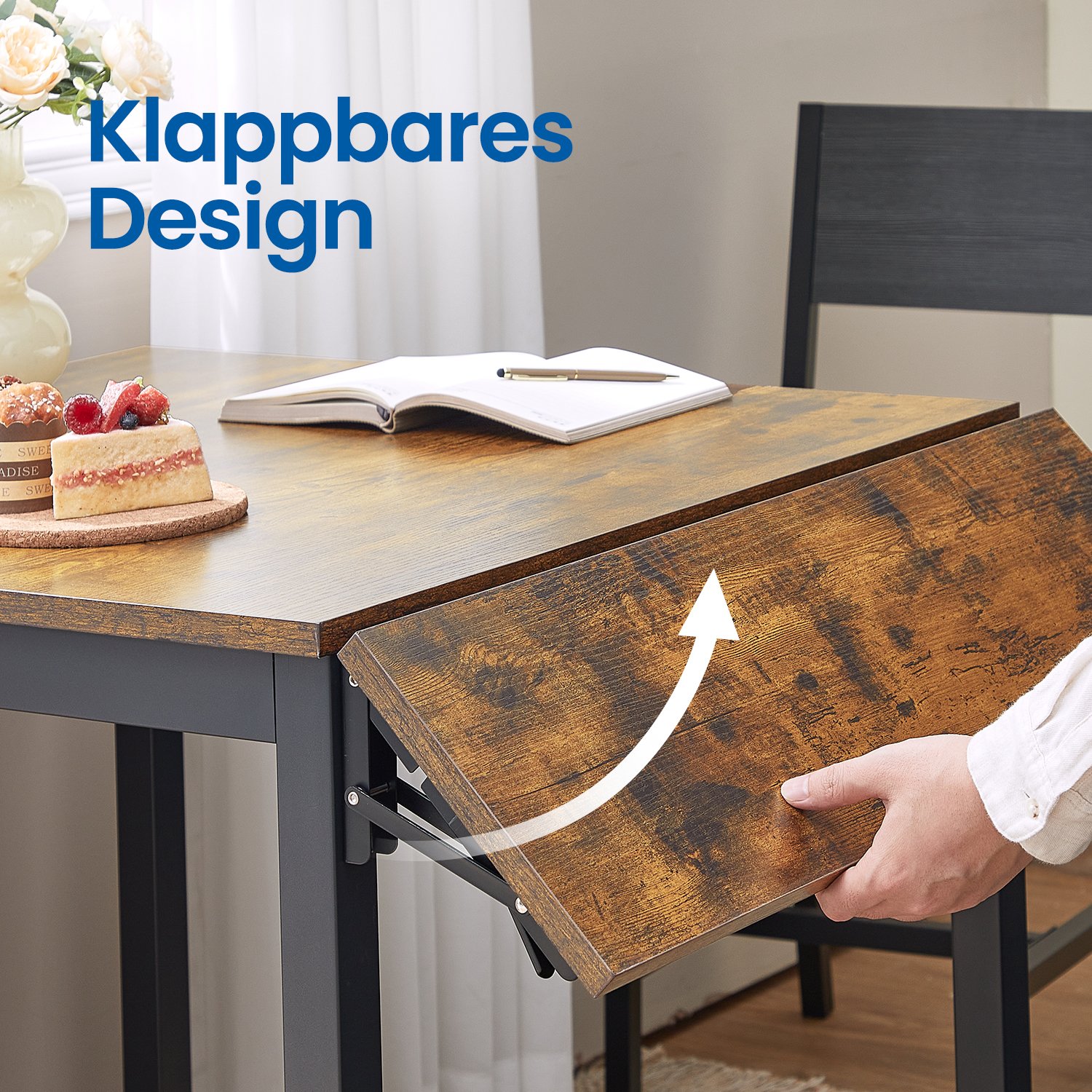 Produktdetaljer: – Farve: Vintagebrun-sort – Materiale: Sp?nplade, st?l – St?rrelse udklappet: 120 x 78 x 76,2 cm (L x B x H) – St?rrelse sammenklappet: 84,5 x 78 x 76,2 cm (L x B x H) – V?gt: 17,5 kg – Maks. statisk belastning af den midterste bordplade: 100 kg – Maks. statisk belastning af hver bordplade p? begge sider: 50 kg Leveringsomfang: – 1 x spisebord – 1 x tilbeh?rspakke – 1 x vejledning VASAGLE Bem?rkninger: – Af sikkerhedsm?ssige ?rsager er det forbudt for b?rn at klatre p? eller lege med produktet.