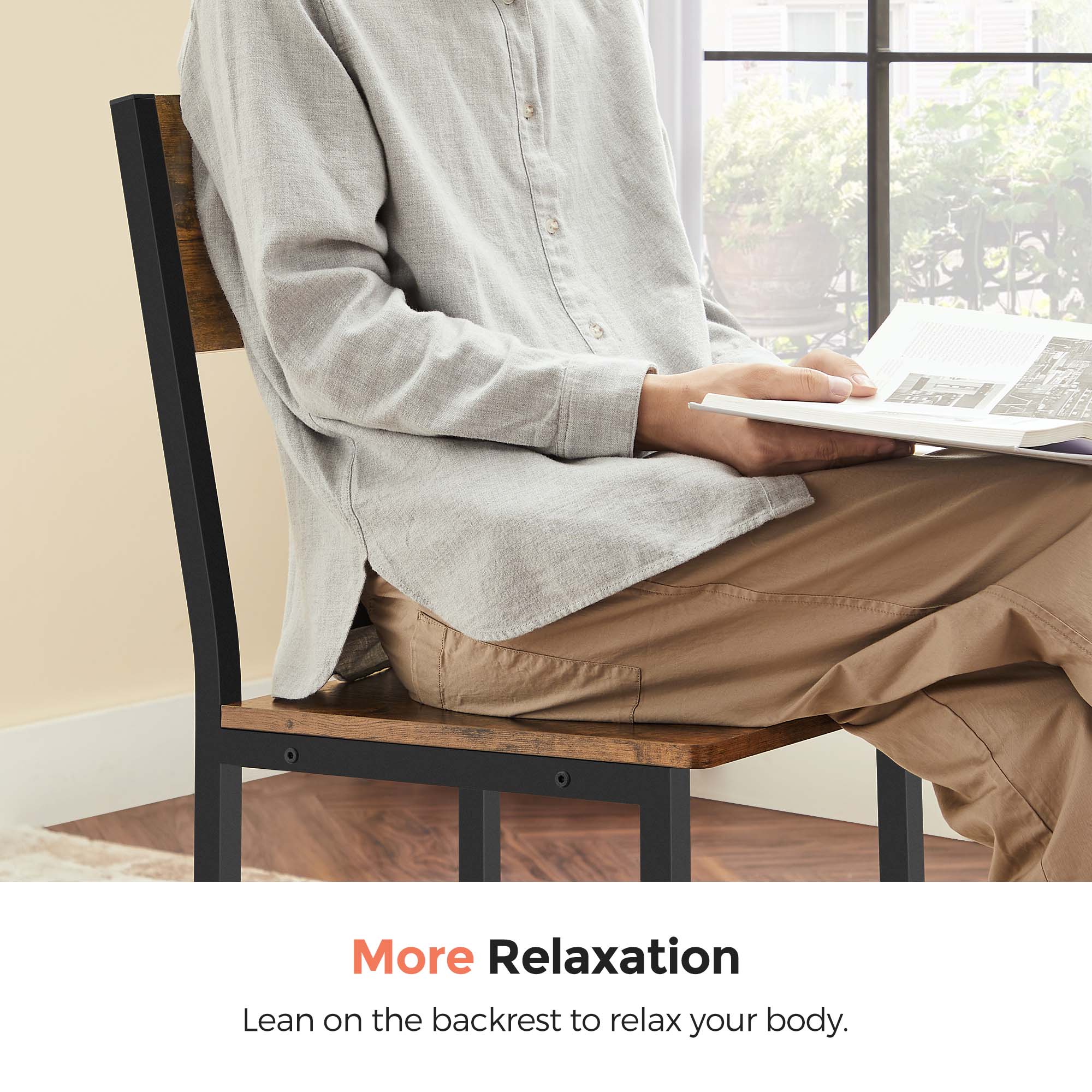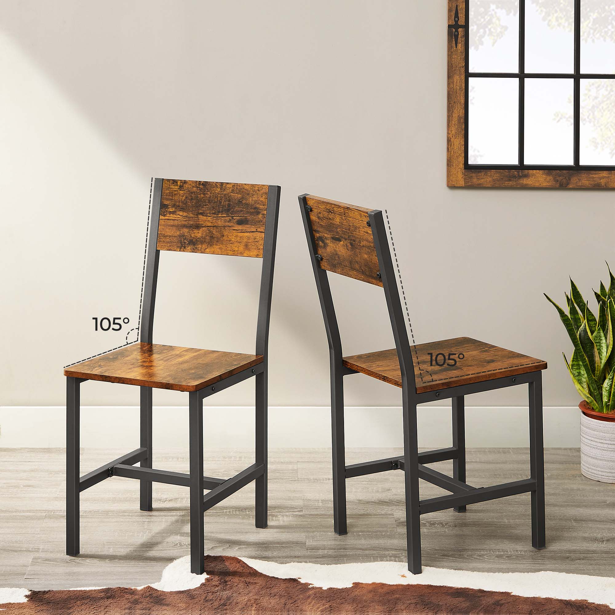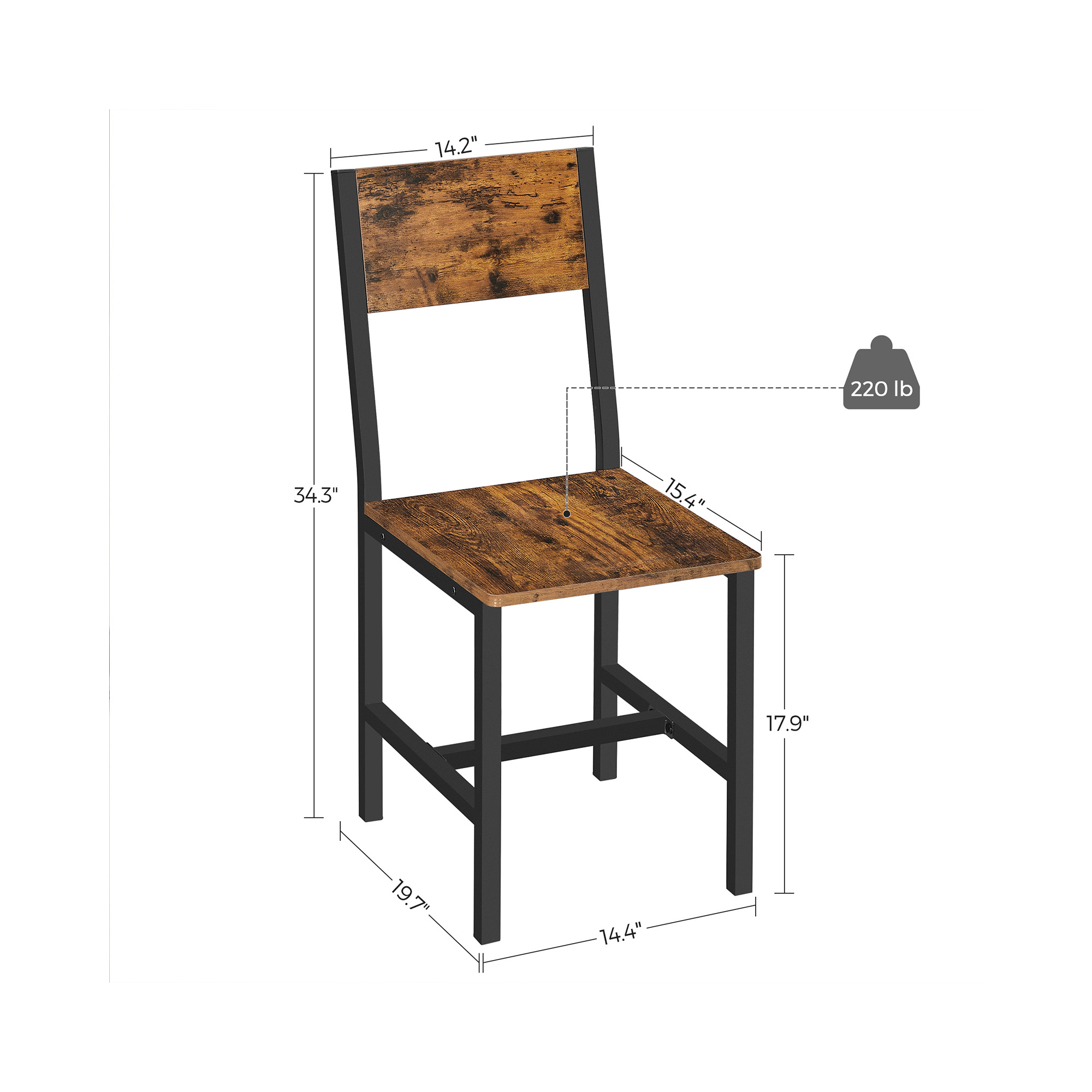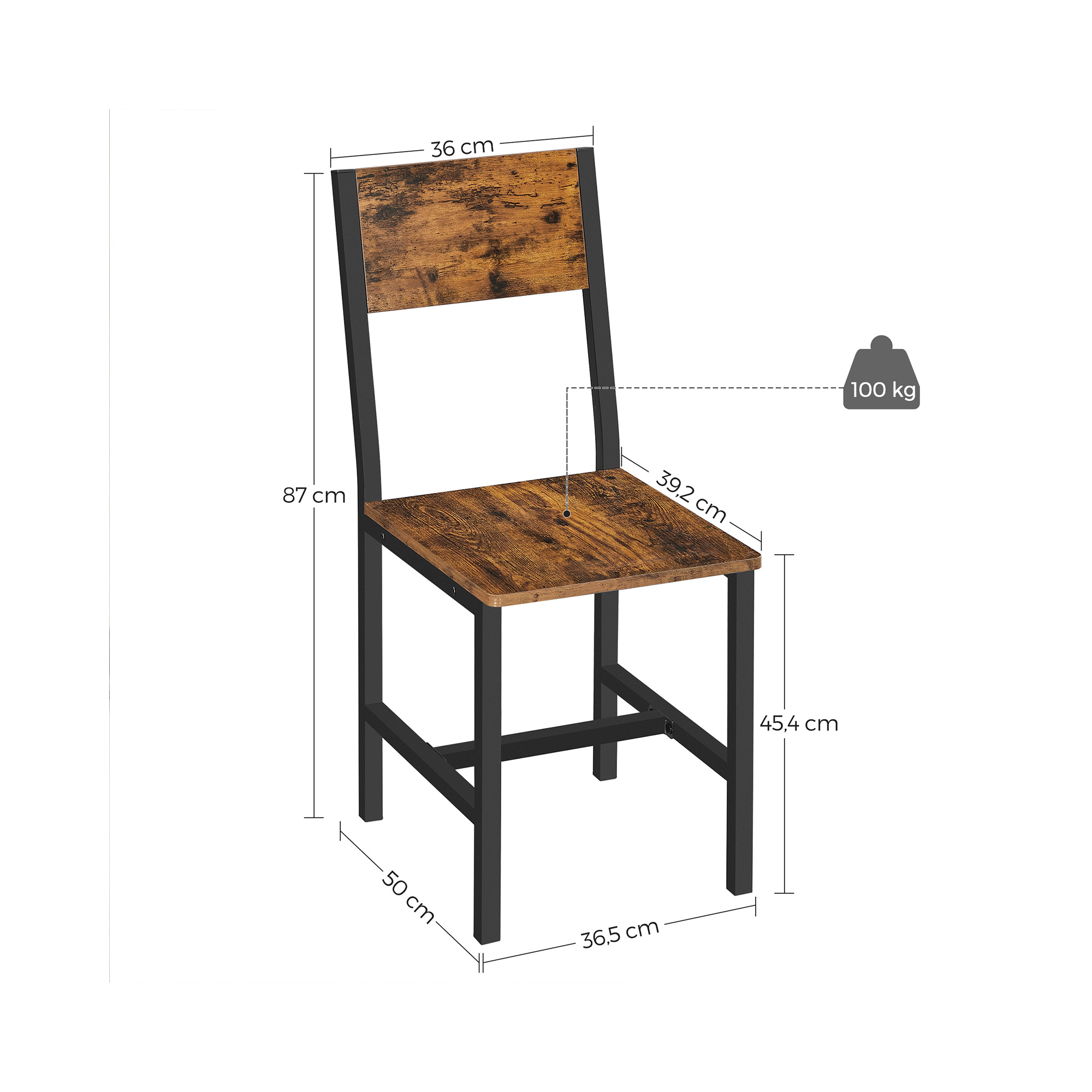 Produktdetaljer: – Farve: Vintagebrun-sort – Materiale: Sp?nplade, st?l – St?rrelse: 36,5 x 50 x 87 cm (L x B x H) – V?gt af de 2 stole: 11 kg – Maks. statisk belastning pr. stol: 100 kg Leveringsomfang:- 2 x spisestuestol – 1 x tilbeh?rspakke – 1 x vejledning (DE, EN, ES, FR, IT) VASAGLE Bem?rkninger: – Af sikkerhedsm?ssige ?rsager er det forbudt for b?rn at klatre p? eller lege med produktet. – Den maksimale statiske belastning pr. stol er 100 kg. Overskrid ikke denne maksimale v?gt.