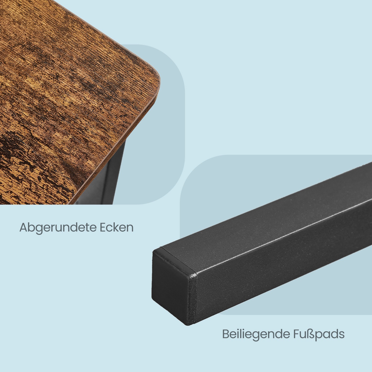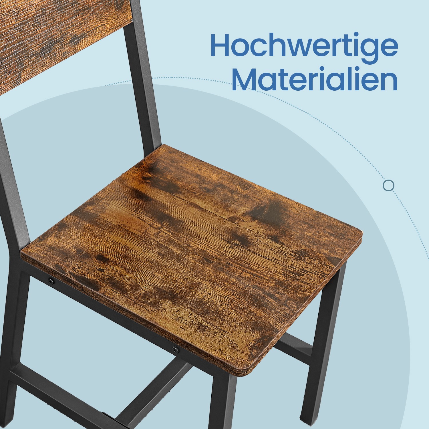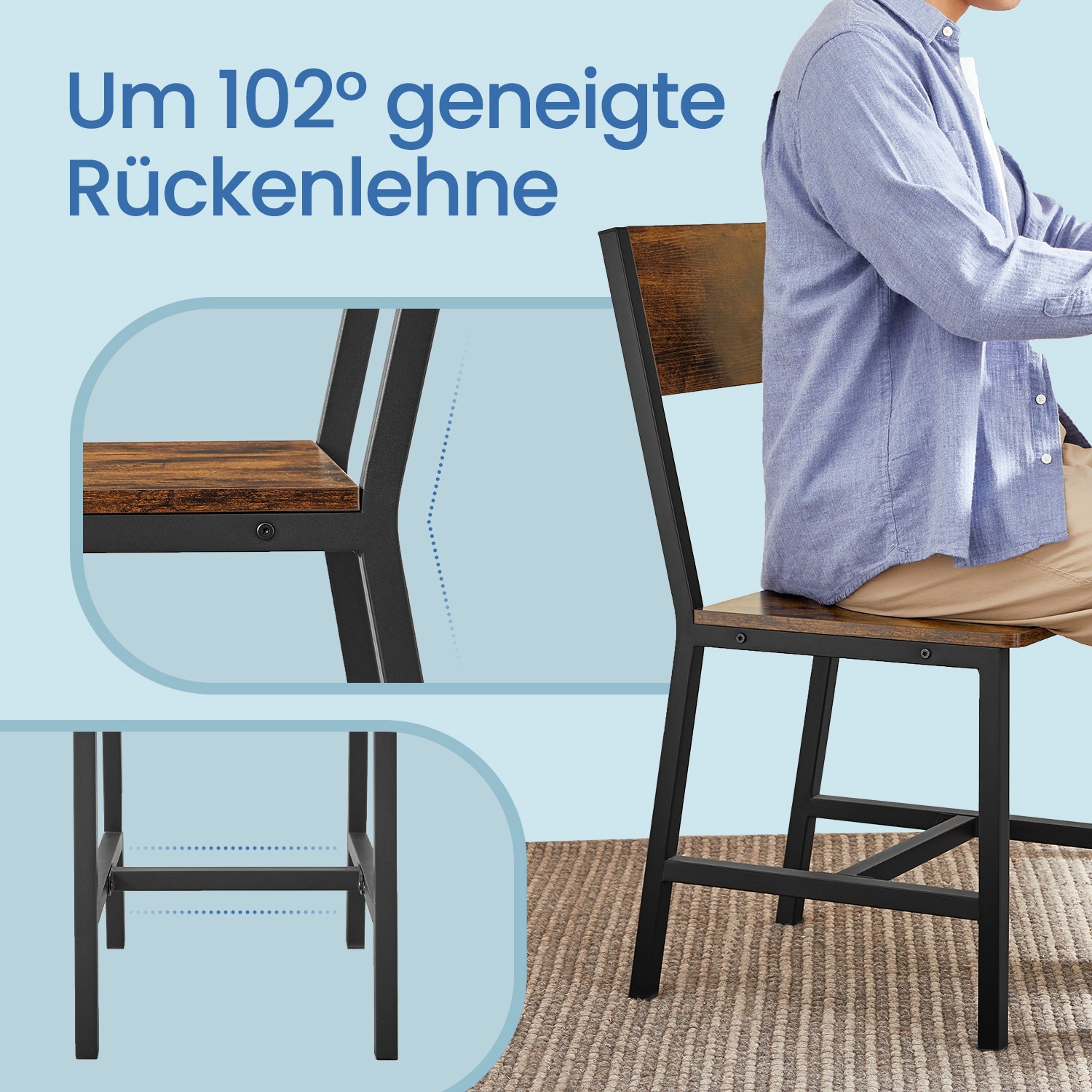 Produktdetaljer: – Farve: Vintagebrun-sort – Materiale: Sp?nplade, st?l – St?rrelse pr. stol: 36 x 46,6 x 87,1 cm (L x B x H) – St?rrelse pr. s?de: 36 x 39,2 x 1,5 cm (L x B x H) – S?deh?jde: 45,4 cm – Samlet v?gt: 12 kg – Maks. statisk belastning pr. stol: 100 kg Leveringsomfang: – 2 x spisestuestol – 1 x tilbeh?rspakke – 1 x vejledning VASAGLE Bem?rkninger: – Af sikkerhedsm?ssige ?rsager er det ikke tilladt for b?rn at klatre p? eller lege med produktet.- Den maksimale statiske belastning pr. stol er 100 kg. Overskrid ikke denne maksimale v?gt.