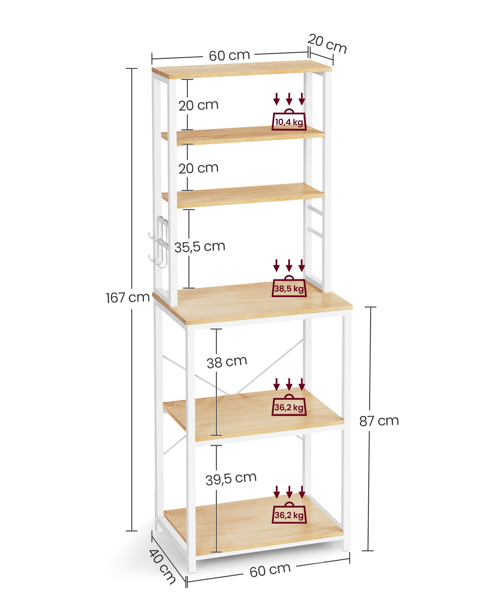 Maks. statisk belastning p? hver nederste hylde: 36,2 kg