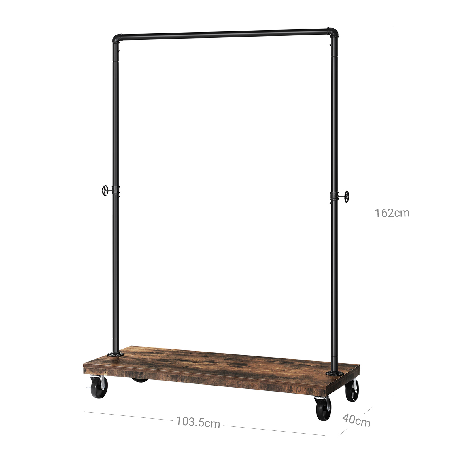 T?jstang og hylde i ?t: Denne garderobestativ kombinerer en t?jstang og en skohylde. S? kan dit t?j og dine sko opbevares samlet p? ?t sted, hvilket g?r det nemt at f? fat i det, n?r du skal v?lge et outfit. H?ng dine jakker eller skjorter p? denne t?jstang uden at kr?lle dem, s? du ikke l?ngere beh?ver at folde og stryge dem. P? hylden i den nederste del er der ogs? plads til nogle kasser, hvor du kan opbevare t?rkl?der, sokker eller mange andre accessories. En garderobestativ til alle form?l: Du kan ikke kun bruge denne garderobestativ derhjemme, men ogs? transportere den til din butik eller loppemarked for at pr?sentere dine varer der. Produktdetaljer: Farve: Vintagebrun-sort Materiale: Sp?nplade, st?l St?rrelse: 103,5 x 40 x 162 cm (L x B x H) V?gt: 9,7 kg Maks. statisk belastning af t?jstangen: 90 kg Maks. statisk belastning af hylden: 25 kg Leveringsomfang: 1 x t?jstativ 1 x beholder med tilbeh?r 1 x vejledning SONGICs bem?rkninger:Flyt produktet langsomt og med hj?lp fra andre personer, n?r det er fuldt lastet, for at sikre en l?ngere levetid.