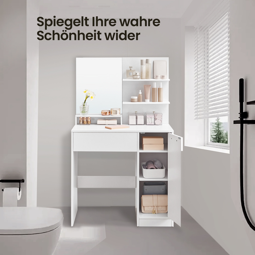 En ideel gave Hvis du stadig leder efter en gave til dine k?re, er dette makeupbord det rette valg. Den hvide farve, den enkle bordplade og det gennemt?nkte design vil helt sikkert bringe et smil frem p? dine venners eller familiens ansigter. Hemmelig kosmetikhave Fuldend din makeup og g?r din morgenrutine nemmere med dette makeupbord. Skuffen har plads nok til ?jenskygge, rouge og andre accessories. Rummet til h?jre kan bruges til toner, serum og creme. Indret din kosmetikafdeling helt efter dine ?nsker, og forlad dit hjem med perfekt styling! Produktdetaljer:- Farve: Hvid – Materiale: Sp?nplade – St?rrelse: 80 x 40 x 132 cm (L x B x H) – V?gt: 27,8 kg Leveringsomfang: – 1 x makeupbord – 1 x tilbeh?rspakke – 1 x vejledning VASAGLE Bem?rkninger: – Dette produkt er udelukkende beregnet til indend?rs brug.