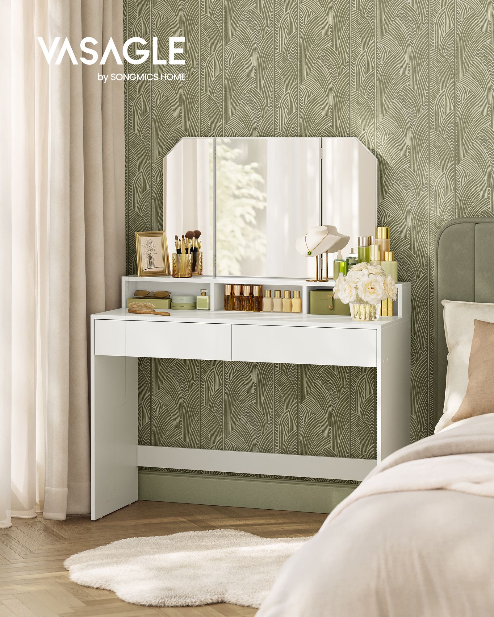 Hvis dette er din nuv?rende situation: Du v?gner om morgenen og l?ber i en fart fra v?relse til v?relse, fordi din ansigtscreme ligger p? stuebordet, din foundation p? natbordet, din ?jenskygge i badev?relset og din h?rb?rste et eller andet sted! M?ske er den faldet ned bag din seng… S? kan du gl?de dig til dette scenario: Du v?gner om morgenen og s?tter dig behageligt ved dette toiletbord med klapspejl. Cremer, foundation, ?jenskygge, pensler og andre sk?nhedsprodukter ligger lige ved h?nden i de 2 store skuffer, 3 ?bne rum, p? den forh?jede hylde og p? den store bordplade… S? bliver din daglige makeup-rutine en leg, og du kan sove 10 minutter l?ngere.Produktdetaljer: Farve: Hvid Materiale: Sp?nplade med melaminbel?gning St?rrelse: 100 x 40 x 142 cm (L x B x H) V?gt: 27,5 kg Leveringsomfang: 1 x makeupbord 1 x tilbeh?rspakke 1 x vippesikring 1 x vejledning (DE, EN, FR, ES, IT) VASAGLE Bem?rkninger:Af sikkerhedsm?ssige ?rsager m? b?rn ikke klatre p? eller lege med produktet. Monter produktet n?jagtigt efter vejledningen. Hold produktet v?k fra vand. Fastg?r produktet til v?ggen med det medf?lgende v?ltesikringsudstyr. L?ft produktet, hvis du vil placere det et andet sted. Tr?k det ikke hen over gulvet.