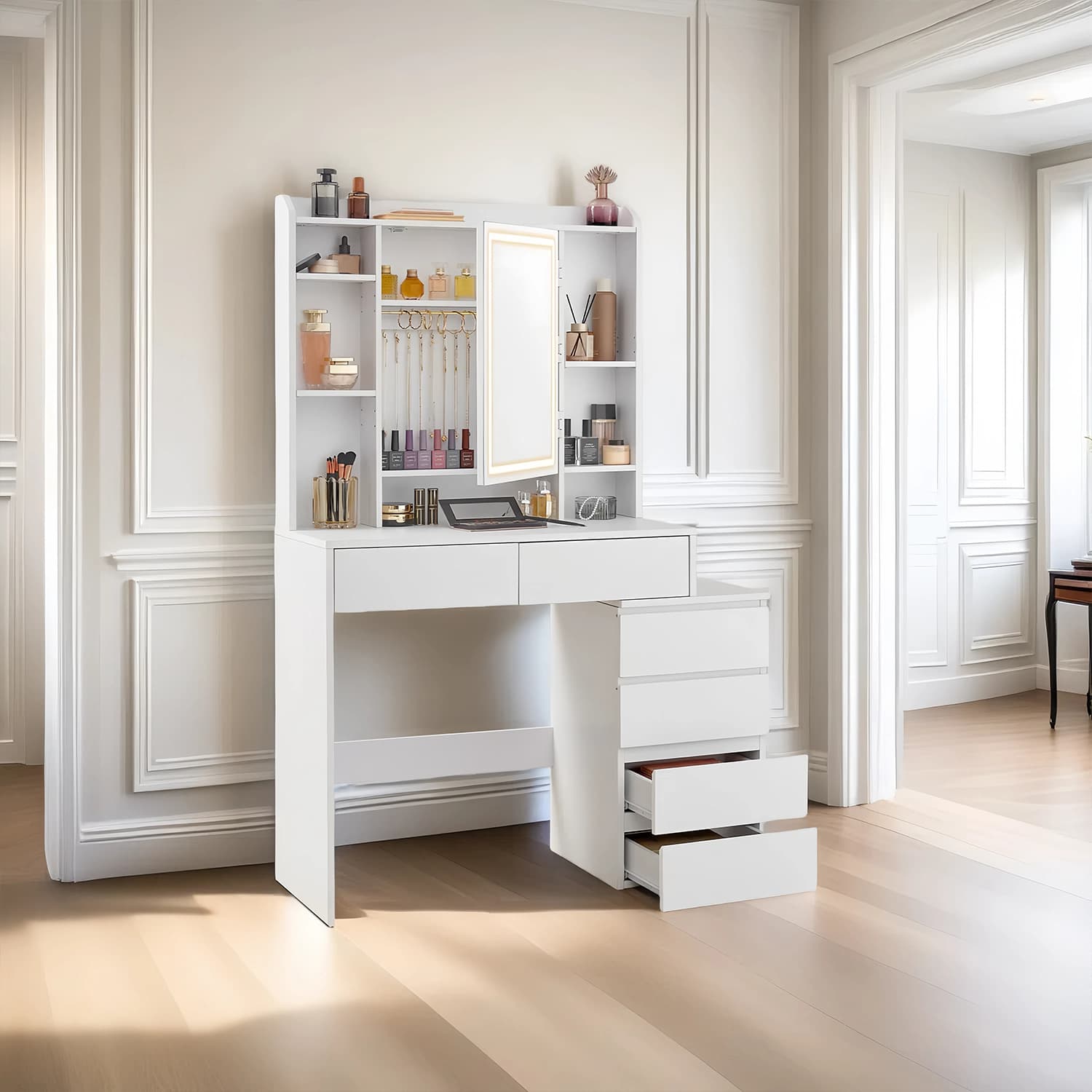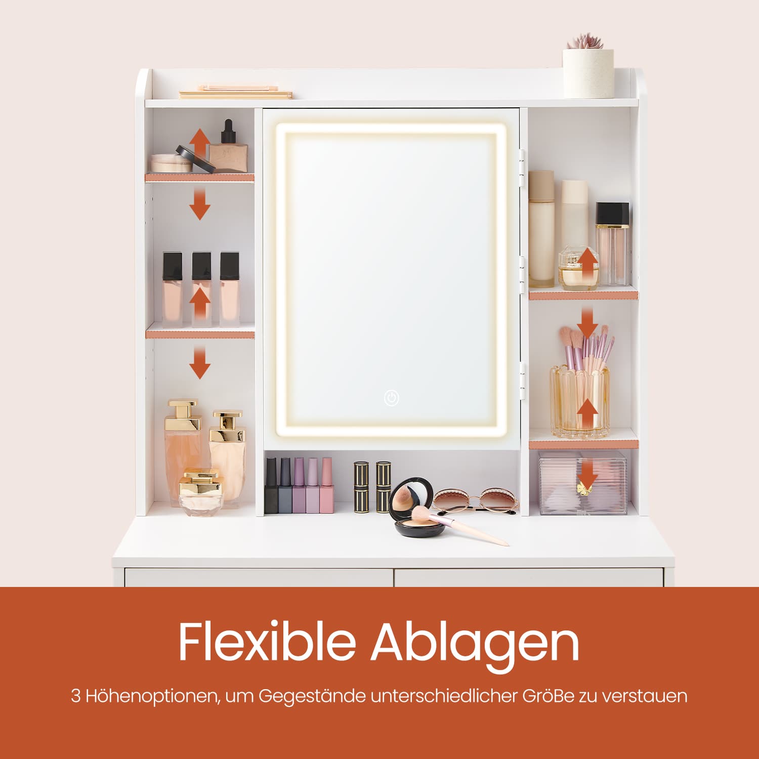 Sminkebord med LED-belysning, justerbare lysfarver og lysstyrke, toiletbord med spejl, justerbare hylder, 40 x 97,5 x 145 cm, kosmetikbord, skyhvid