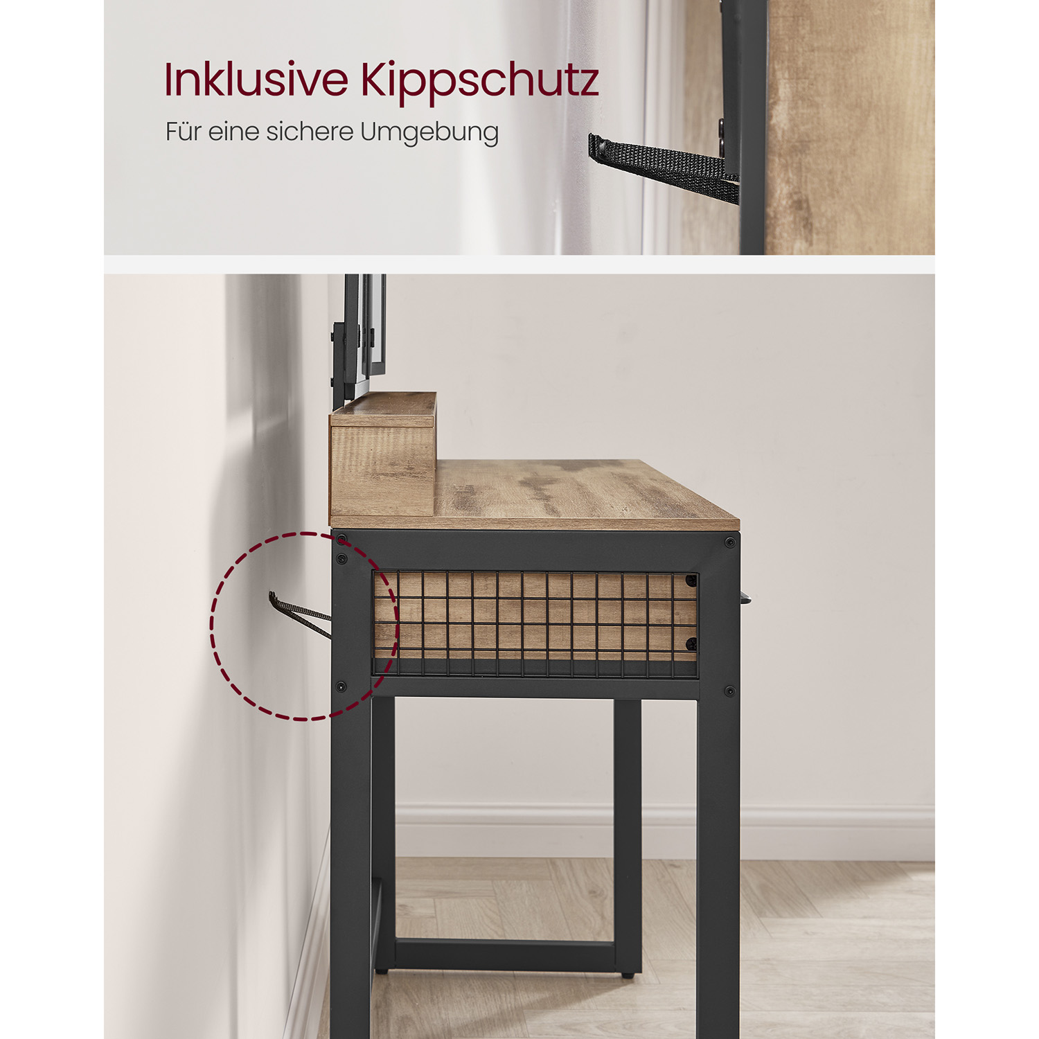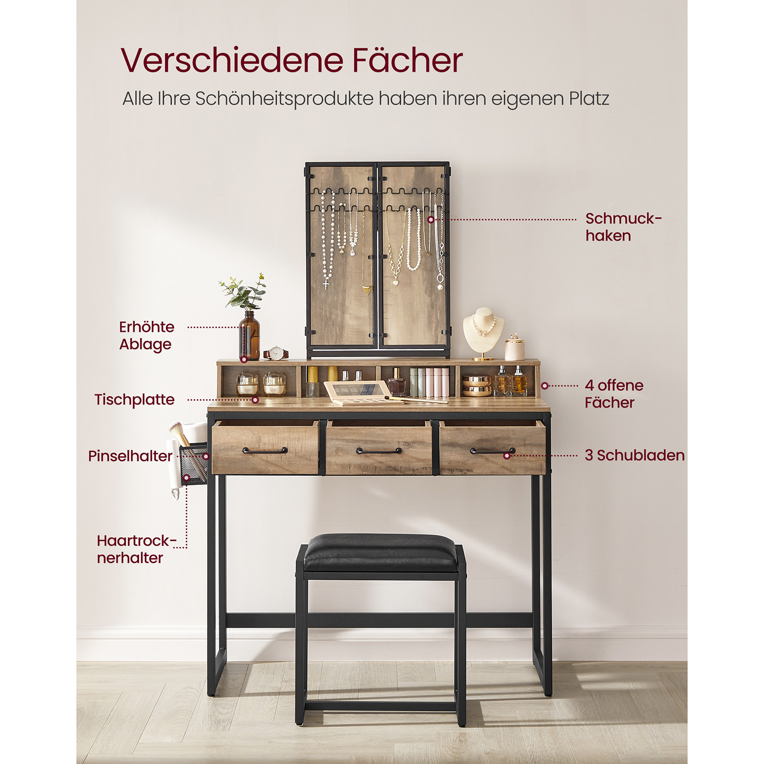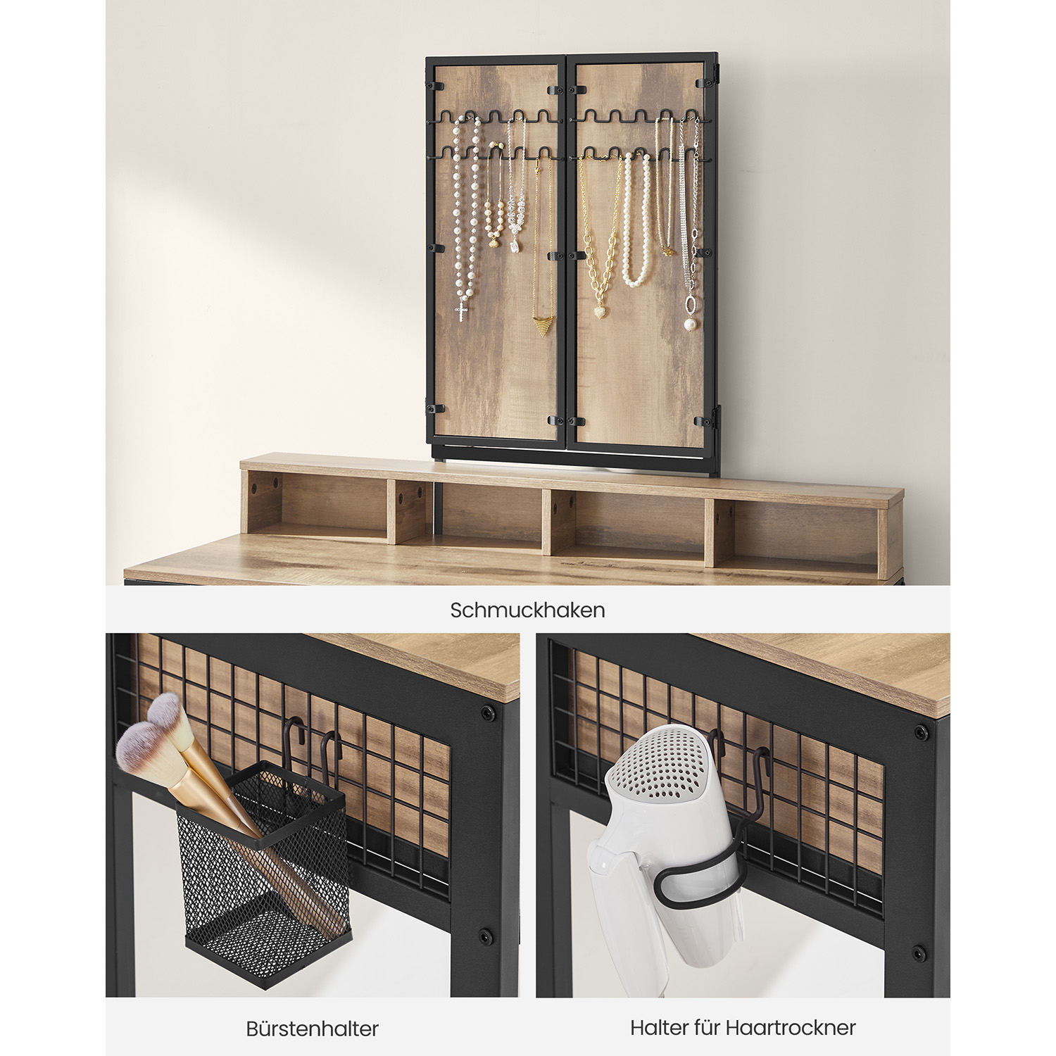 VASAGLE toiletbord, fris?rbord med 3-delt klapspejl, h?rt?rrerholder, kosmetikbord med polstret skammel, 3 skuffer, industrielt design, vintagebrun-sort RVT004B01