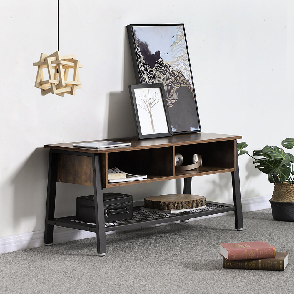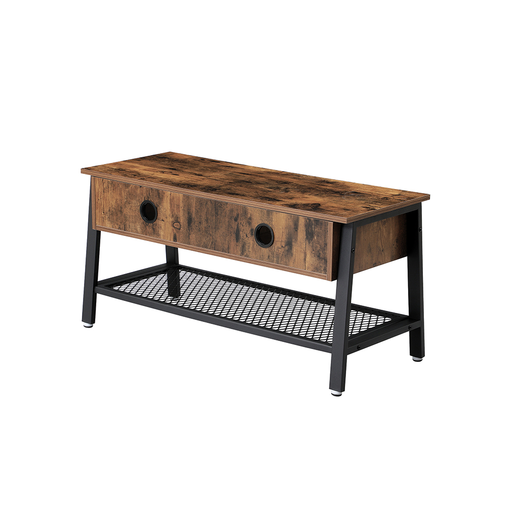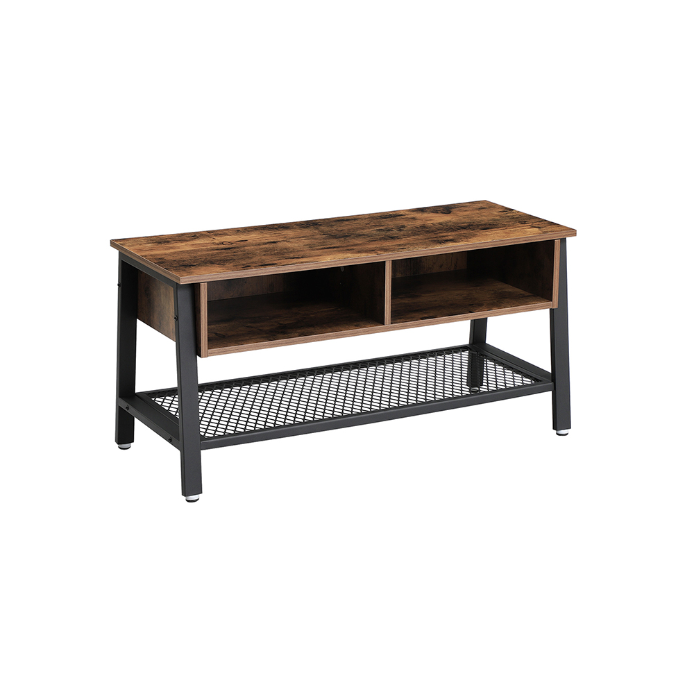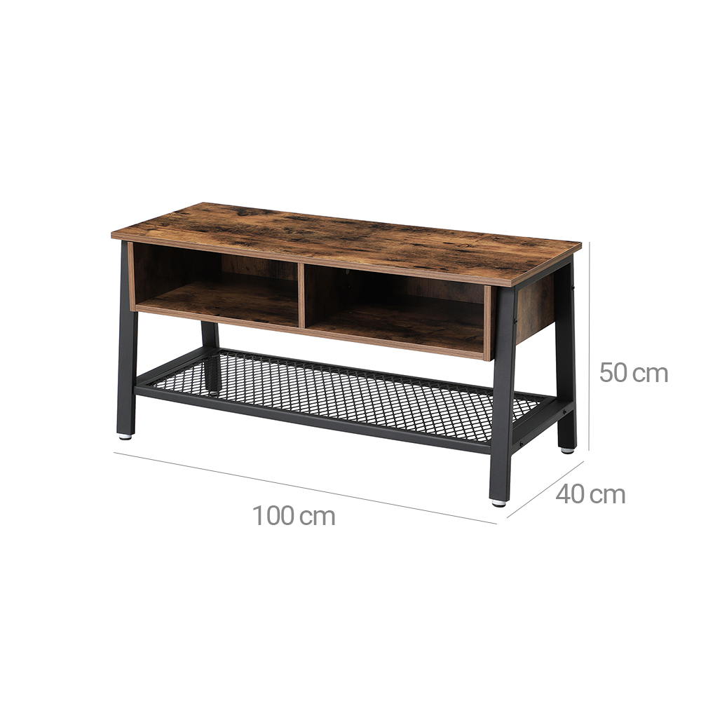 Produktdetaljer: – Farve: Vintagebrun-sort – Materiale: Sp?nplade, st?l – M?l: 100 x 50 x 40 cm (B x H x D) – V?gt: 17,8 kg – Maks. belastbarhed af bordpladen: 30 kg – Maks. belastbarhed for gitterhylden: 10 kg Leveringsomfang: – 1 x TV-lavbord – 1 x tilbeh?rspose – 1 x vejledning (DE, EN, FR, ES, IT) VASAGLE Bem?rkninger: – Produktet er udelukkende beregnet til indend?rs brug. Stil det i et t?rt milj?. – Den maksimale v?gt p? bordpladen er 30 kg, og den maksimale v?gt p? gitterhylden er 10 kg. Placer ikke tungere genstande p? disse.