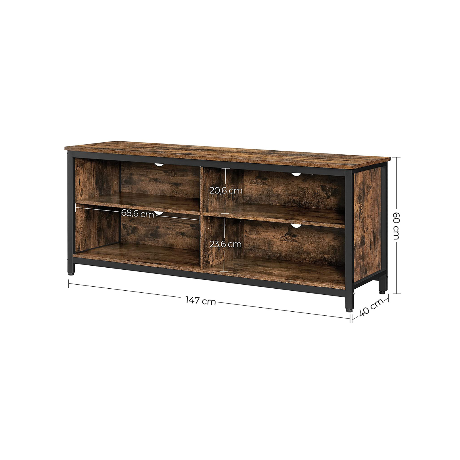 Produktdetaljer: – Farve: Vintagebrun-sort – Materiale: Sp?nplade, st?l – St?rrelse: 147 x 40 x 60 cm (L x B x H) – V?gt: 25 kg – Maks. statisk belastning: 65 kg Leveringsomfang: – 1 x tv-reol – 1 x tilbeh?rspakke – 1 x vejledning VASAGLE Bem?rkninger: – Af sikkerhedsm?ssige ?rsager er det ikke tilladt for b?rn at klatre p? eller lege med produktet.