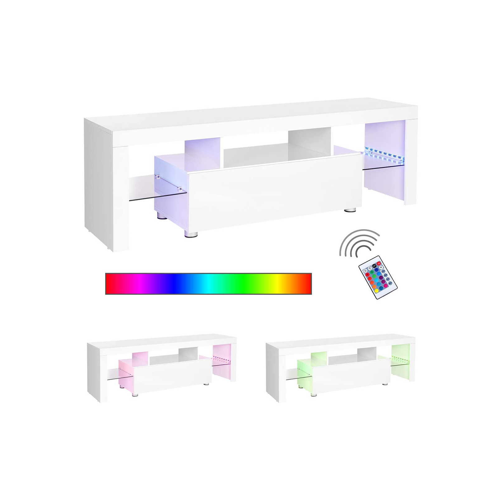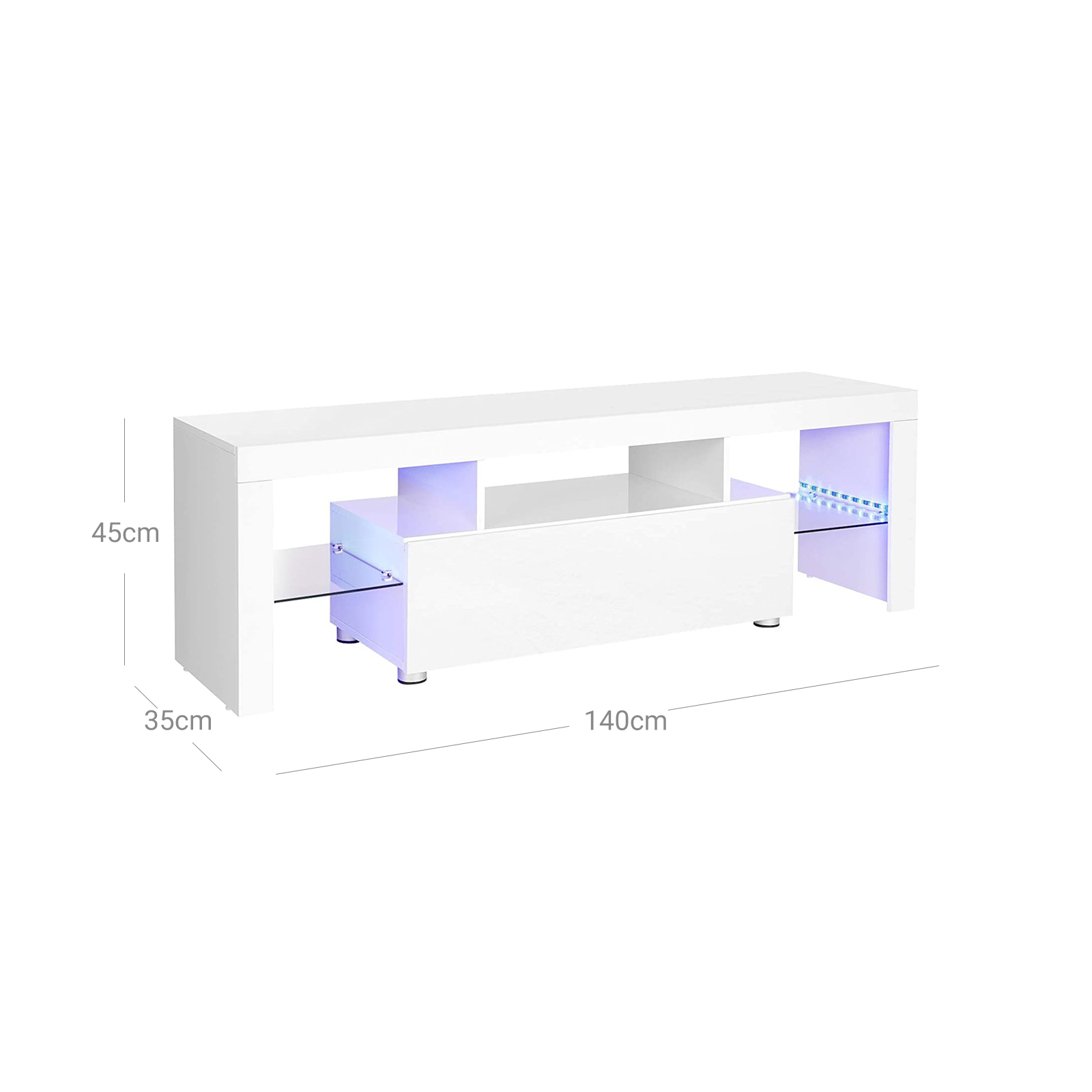TV-hj?rne 2.0 Mens vi alle venter p? 5G og overkommelige elbiler, er fjernsynet allerede kommet ind i det nye ?rtusinde. Derfor m? vores tv-m?bler naturligvis f?lge med: Dette lavbord er udstyret med en moderne hvid h?jglansfinish. Glasoverfladerne og lysb?ndene med USB-tilslutning understreger ogs? dette moderne touch og katapulterer dit tv-hj?rne ind i fremtiden. H?jdepunkterne i tv-skabet p? et blik: – 140 x 35 cm stor overflade til tv’er op til 60 tommer – Blankt hvidt; s?rligt velegnet til moderne indrettede stuer – 2 lysstrimler med USB-tilslutning, der kan tilsluttes dit tv eller andre str?mkilder. Strimlerne lyser i forskellige farver og kan afkortes efter behov. – ?bne hylder, et stort klaprum med softclose-l?ge samt 2 glasplader – H?jdejusterbare f?dder i midten – Filtpuder p? siderne; beskytter dit gulv mod ridser Produktdetaljer: – Farve: Blank hvid – Materiale: Sp?nplade, h?rdet glas – St?rrelse: 140 x 35 x 45 cm (L x B x H) – V?gt: 21,4 kg – Maks. statisk belastning: 30 kg Leveringsomfang: – 1 x tv-skab – 1 x beholder med tilbeh?r – 1 x vejledning (DE, EN, FR, ES, IT) VASAGLE Bem?rkninger: – B?rn m? ikke klatre op p? produktet. S?rg desuden for, at dine b?rn ikke st?der sig p? de skarpe hj?rner af dette skab. Fare for personskade! – Af sikkerhedsm?ssige ?rsager skal b?rn holdes v?k fra lysstrimlerne. – S?rg for, at glaspladerne p? dette produkt ikke er l?se, inden du flytter det til et andet sted. L?ft det altid, n?r du flytter det. Tr?k det ikke hen over gulvet. – Dette produkt er udelukkende beregnet til indend?rs brug. Beskyt det mod fugt.