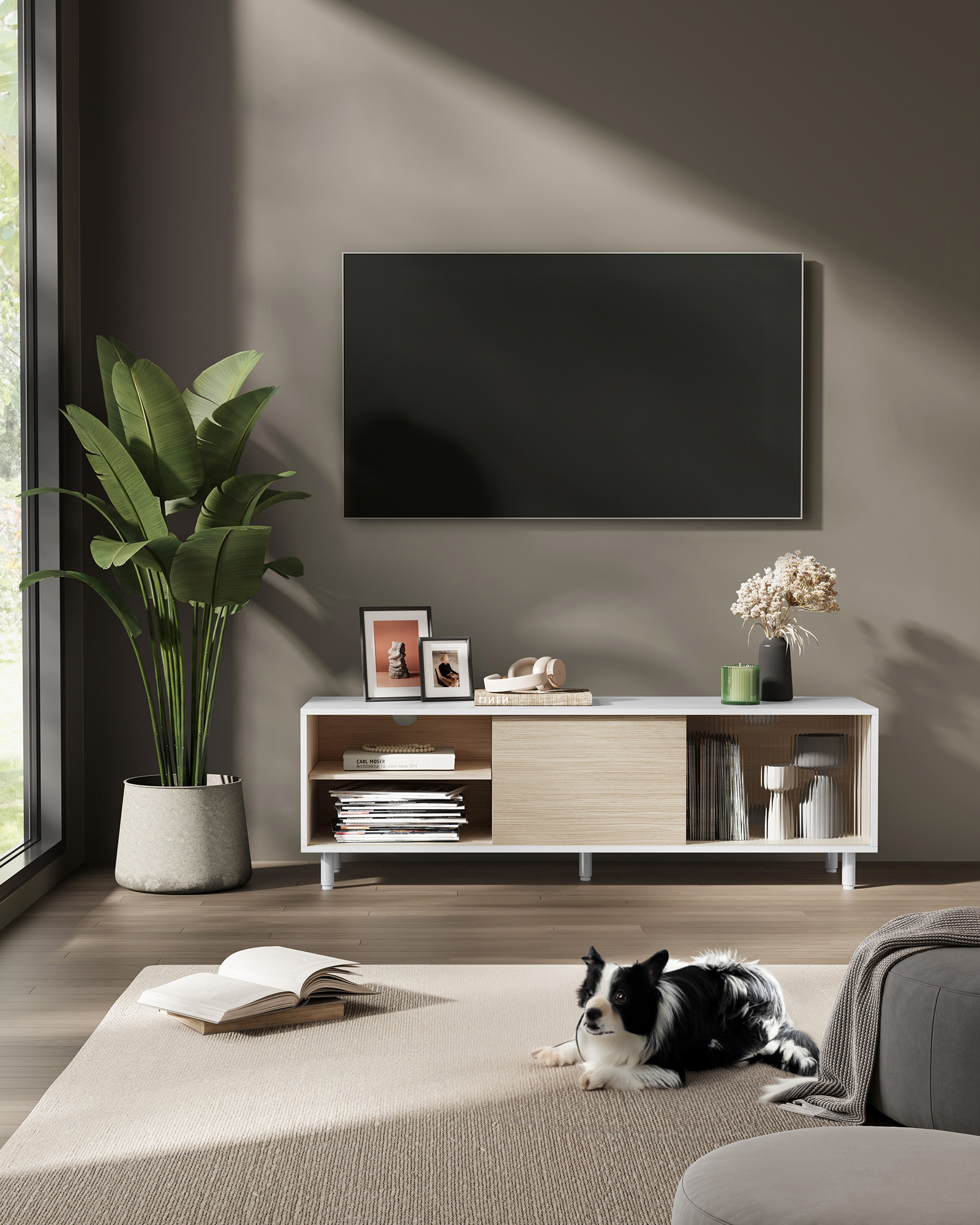 VASAGLE TV-skab til tv op til 60 tommer, superhurtig montering, v?rkt?jsfri teknologi, tv-bord til stuen, riflet glas, moderne, 140 x 39 x 45 cm, askebrun-bl?ksort LTV466K02
