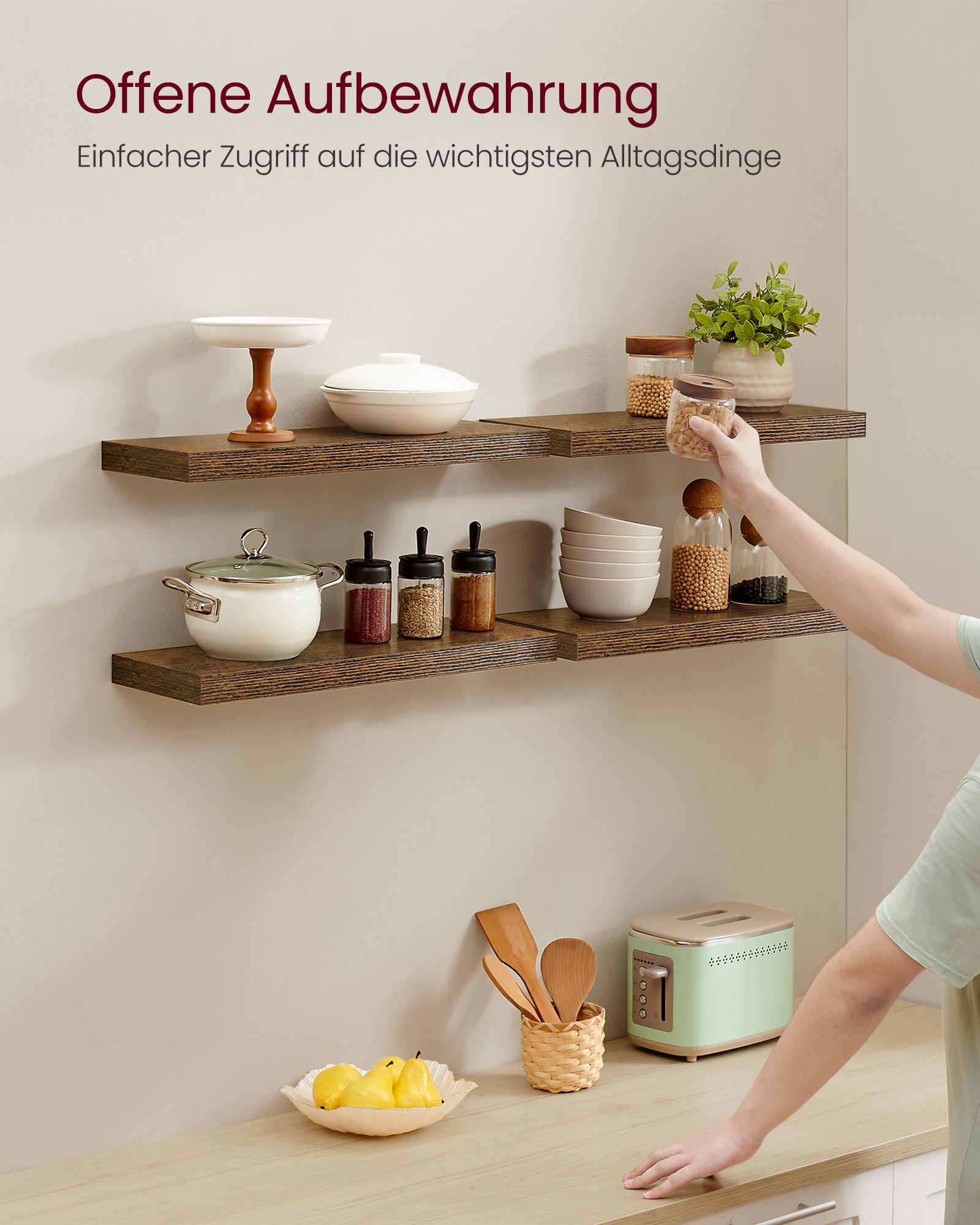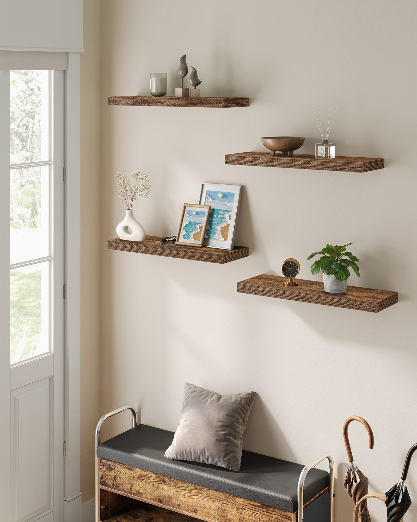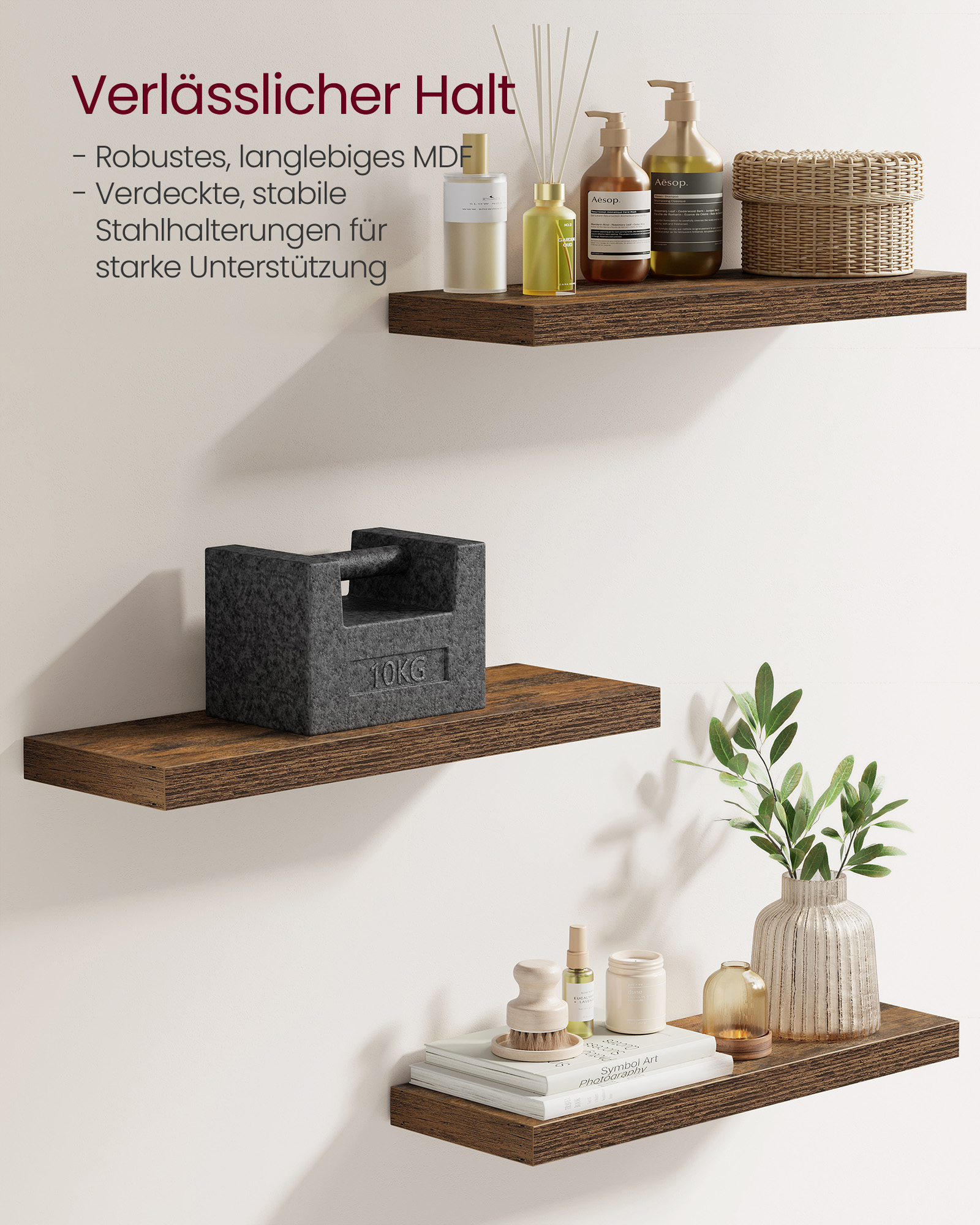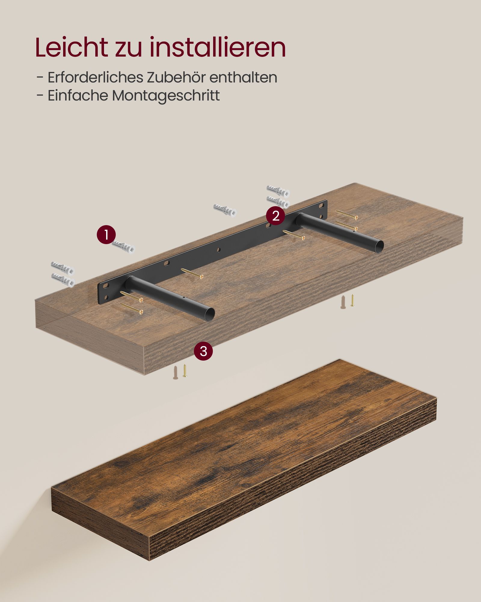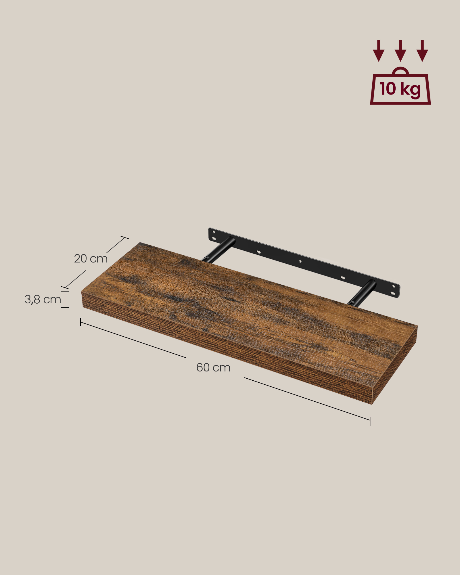 VASAGLE v?ghylde, v?gplade 60 x 20 x 3,8 cm, sv?vende hylde, h?ngende hylde til billeder, dekoration, MDF-tr?, rustik, brun LWS26BX