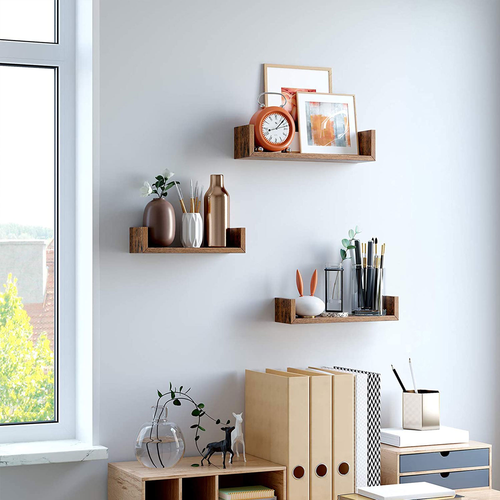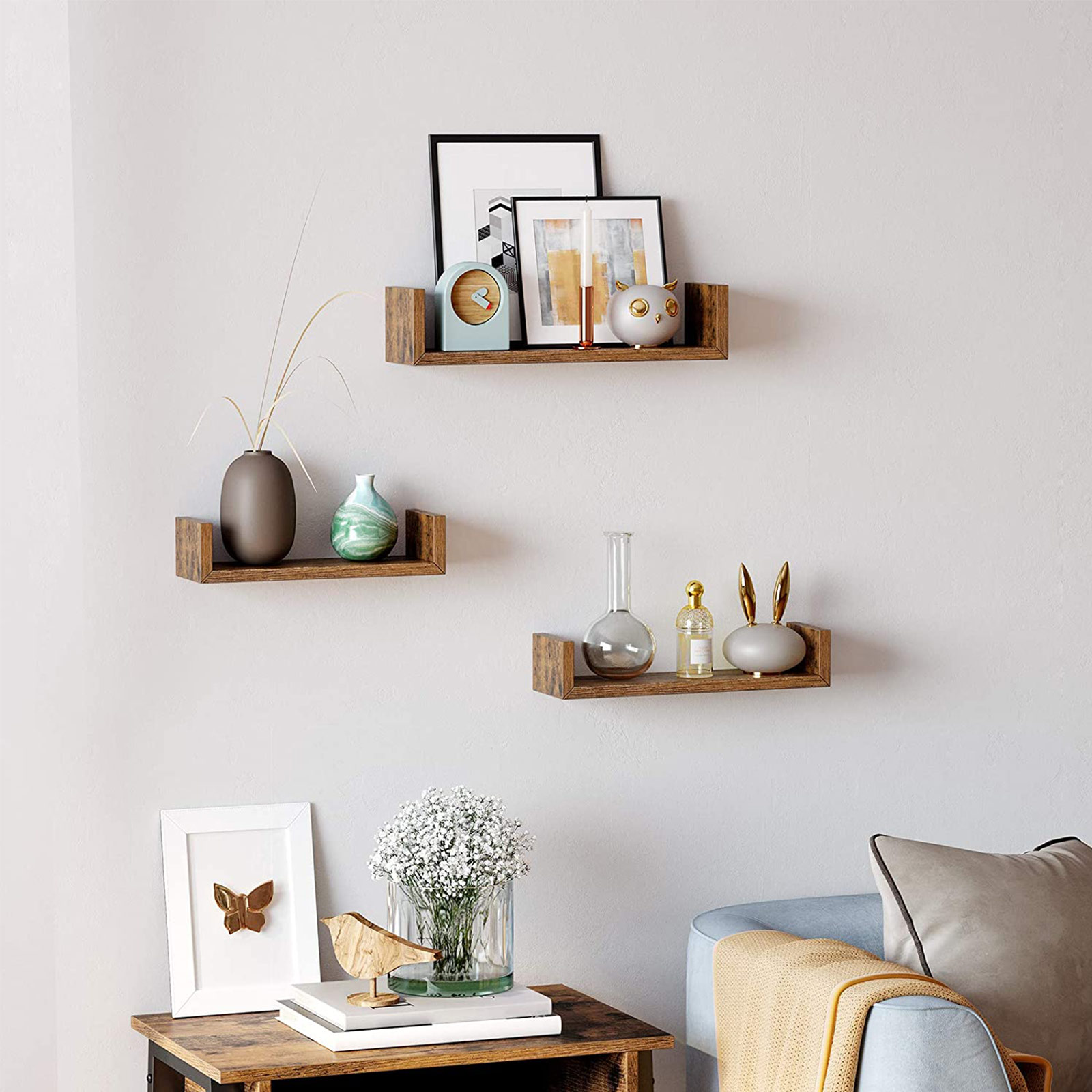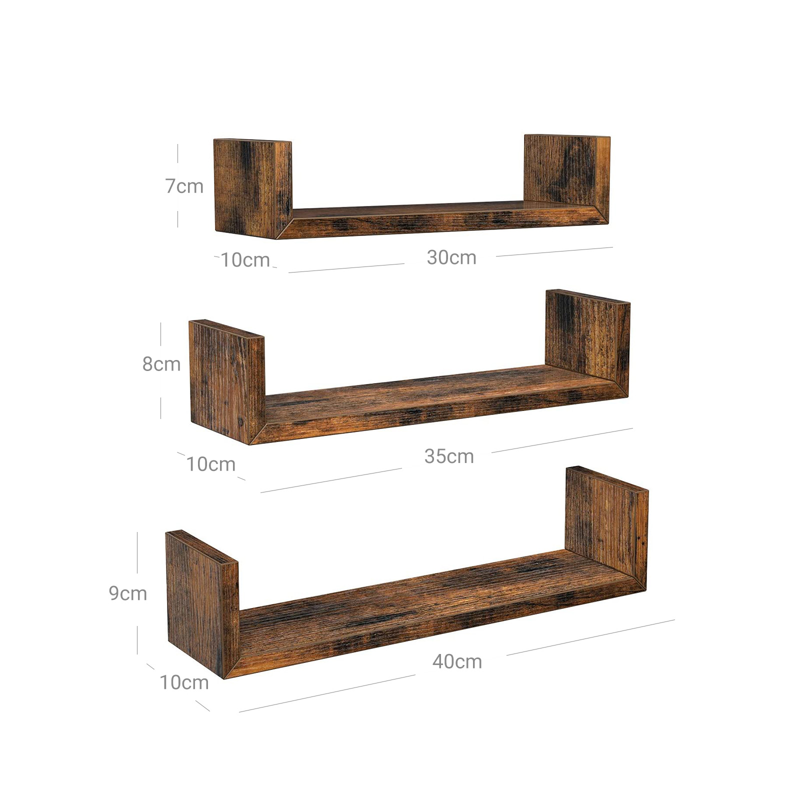 G?r dit hjem unikt Disse sv?vende hylder ser unikke og charmerende ud takket v?re deres U-form og vintage tr?look. Mangler du stadig et blikfang i dit v?relse? S? er disse produkter lige det, du leder efter! Du kan h?nge disse hylder op i et rum eller bruge dem separat i forskellige rum ? det er helt op til dig! Forskellige st?rrelser til forskellige genstande Dette s?t best?r af 3 v?ghylder med en l?ngde p? 30 cm, 35 cm og 40 cm. K?b disse produkter og giv dine billedrammer, dekorationsartikler, b?ger osv. et stilfuldt opbevaringssted. Disse hylder kan hver b?re op til 3 kg (lille), 4 kg (mellemstor) og 5 kg (stor). Produktdetaljer:- Farve: Vintagebrun – Materiale: Sp?nplade – St?rrelse p? den lille hylde: 30 x 10 x 7 cm (L x B x H) – St?rrelse p? den mellemstore hylde: 35 x 10 x 8 cm (L x B x H) – St?rrelse p? den store hylde: 40 x 10 x 9 cm (L x B x H) – Samlet v?gt: 1,7 kg – Maks. statisk belastning pr. v?ghylde: 3 kg, 4 kg, 5 kg (lille, mellemstor, stor) Leveringsomfang:- 3 x v?ghylde – 1 x tilbeh?rspakke – 1 x vejledning (DE, EN, FR, ES, IT) VASAGLE Bem?rkninger: – Det anbefales at montere disse hylder p? en massiv v?g. – Placer ikke for tunge genstande p? disse hylder.