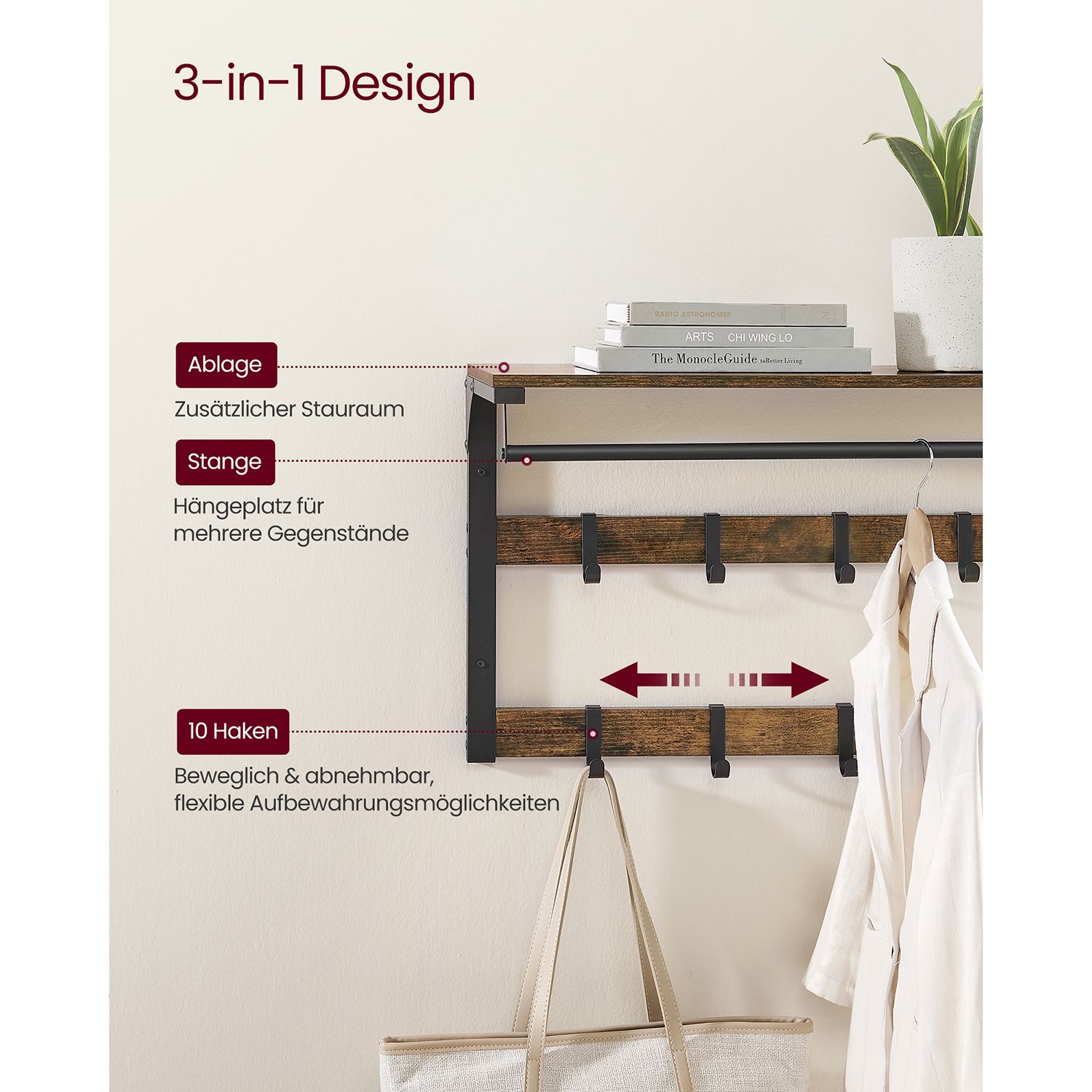 VASAGLE v?ggarderobe, med hylde, v?ghylde med 10 aftagelige kroge, h?ngende hylde, v?gmontering, 2 garderobest?nger, t?jstang, til entre, sovev?relse, badev?relse, vintagebrun-sort LCR101B01