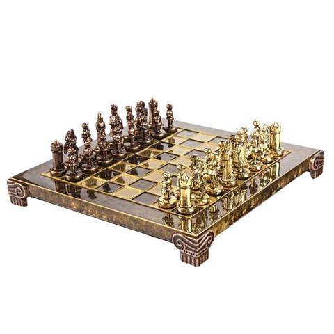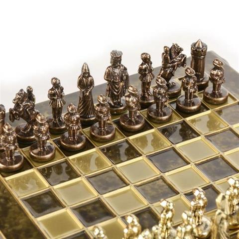 Ainutlaatuiset metalliset shakkipelit Byzantium – S1CBRO Shakkipelimme perustuu Bysantin valtakunnan perinteisiin, joka hallitsi Kaakkois-Eurooppaa ja Vähä-Aasiaa lähes 1000 vuoden ajan. Shakkipalat ovat saaneet inspiraationsa kuuluisasta Makedonian dynastiasta, jonka jäsenet istuivat keisarillisella valtaistuimella vuosina 867–1056. Makedonian dynastian aikana Bysantti astui kehityksen ja kukoistuksen vaiheeseen, jota kutsutaan Bysantin renessanssiksi. Bysanttilaiset kunnioittivat klassista kautta ja laajensivat sitä kristillisillä elementeillä, jotka inspiroivat myöhempien aikakausien taidetta. Se oli imperiumin vaurauden, arvovallan ja sotilaallisen voiman aikaa. Mitat: Shakkilauta 20 x 20 cmKuningaskorkeus 4 cmSarjan paino: 2 kg Shakkipalat: Metalliset shakkipalat ja sotilaat on valmistettu sinkkiseoksesta.Värit: ruskea / kultainen Shakkilauta: Valmistettu messingistä Värit: kelta-ruskea; Käsinmaalattu Pakkaus: Shakkipalat on pakattu kauniiseen, ylelliseen puulaatikkoon. Laatikon sisällä on huolellisesti valmistettu muotti nappuloiden järjestelyä ja turvallista säilyttämistä varten.