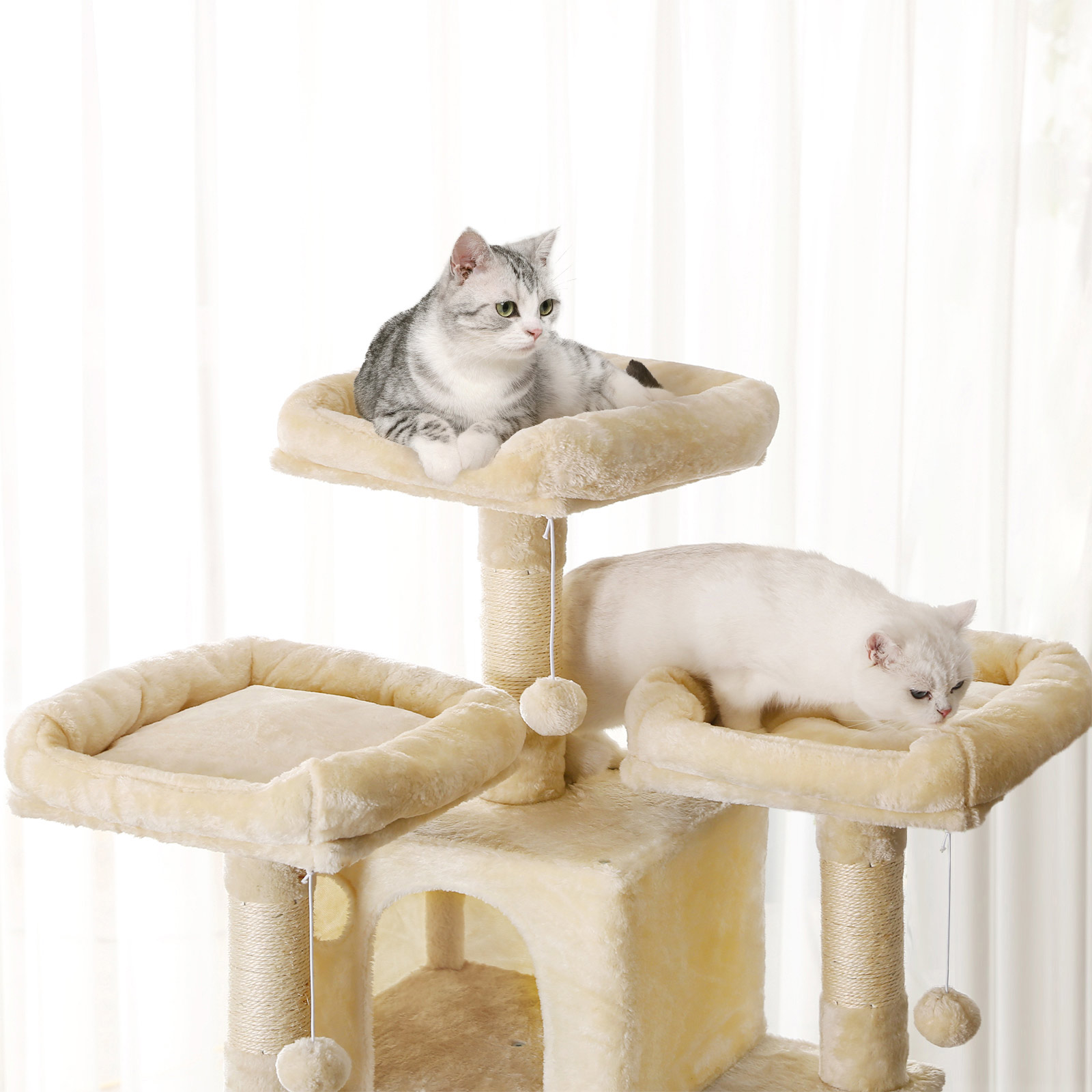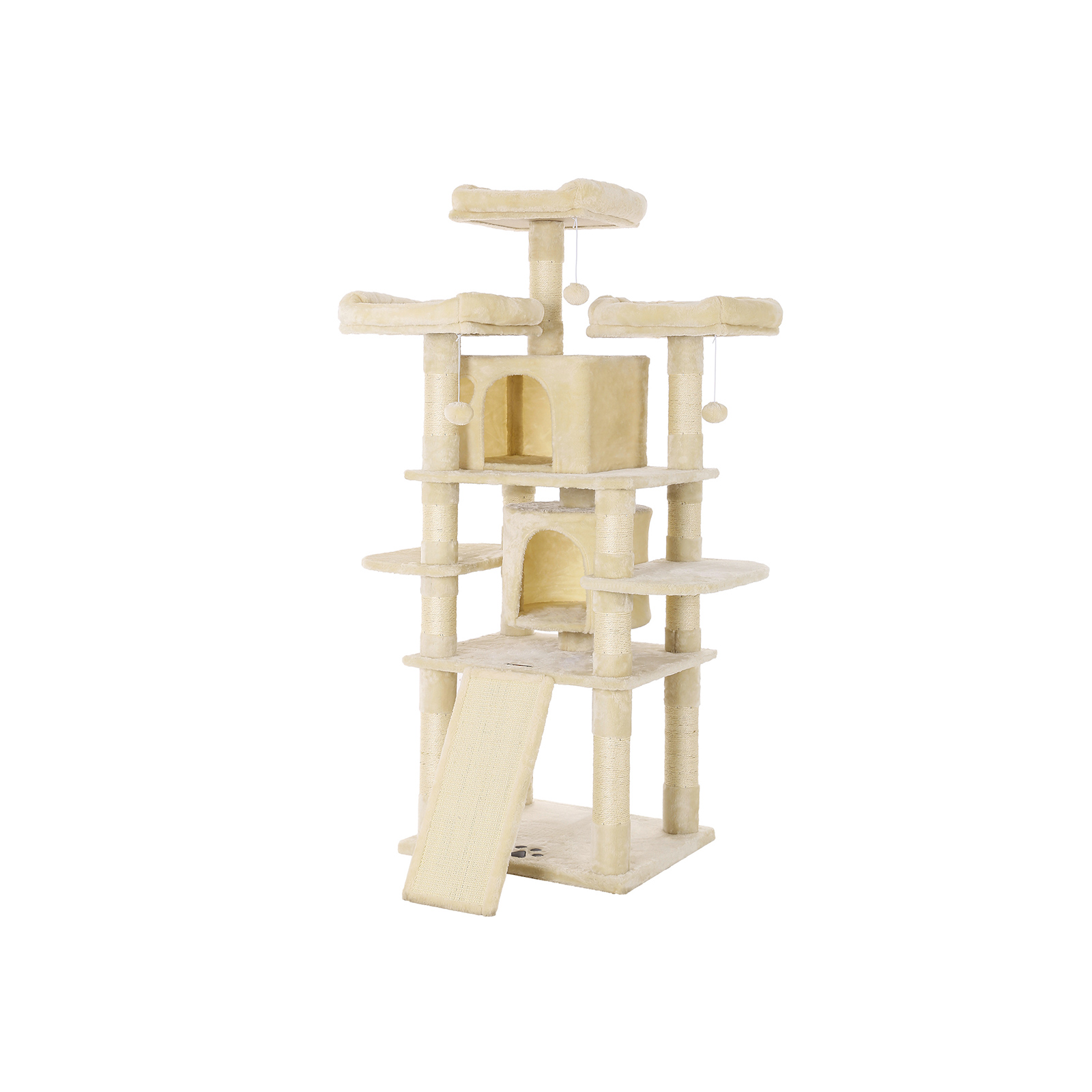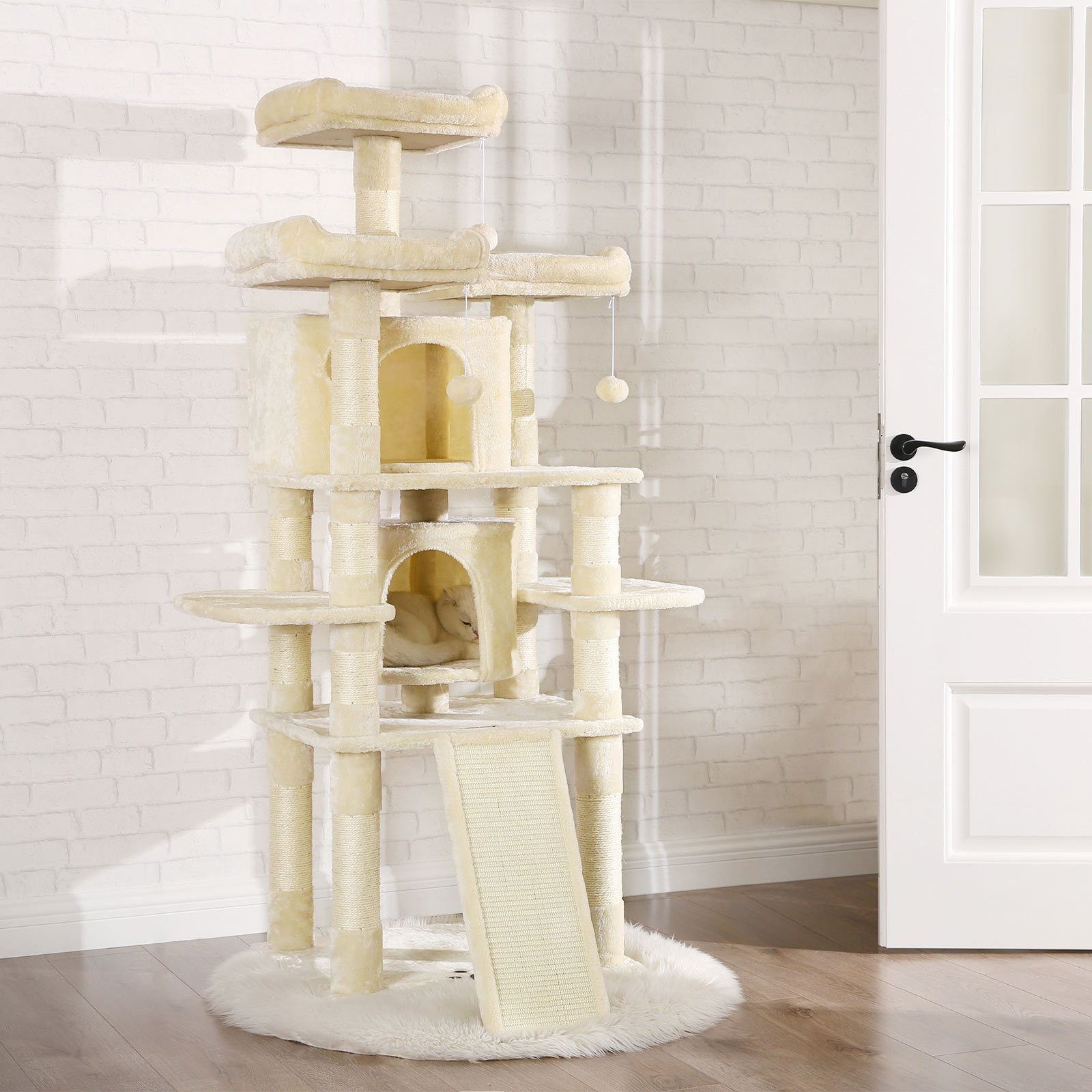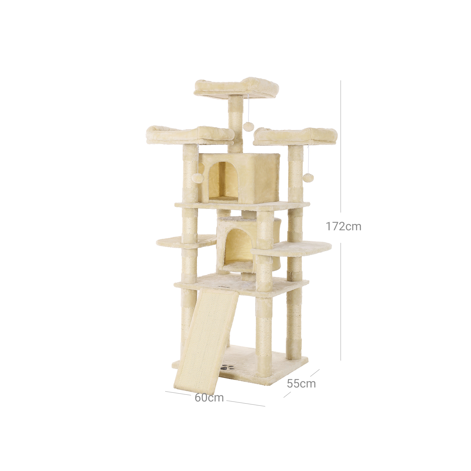 FEANDREAn luovissa työpajoissa kaksi suloista kissanpentua hyppii ympäriinsä, tutkii kaikki raapimispuut henkilökohtaisesti ja antaa eläimellisen palautteensa niistä. Näin FEANDREAn suunnittelijat saavat ensikäden, tai pikemminkin ensikäpälän, tietoa siitä, täyttävätkö tuotteet hemmoteltujen viiksekkäiden vaatimukset. Kissapuu, jolla on monia etuja Yllä oleva kiipeilytorni on läpäissyt kissatestin. Erityisesti kissat pitivät kahdesta suuresta pehmopesästä ja kolmesta pörröisestä näköalatasanteesta. Mutta myös kissan lelun alaosassa oleva raapimislauta oli erittäin suosittu. Lisäksi molemmat testaajat tunsivat olonsa turvalliseksi ja hyppivät pelotta tasanteelta toiselle. Tämän raapimispuun korkean vakauden takaavat ennen kaikkea paksut sisalpuut ja vahvistettu pohjalevy. Mukana toimitetaan myös kaatumissuoja. Tuotetiedot: – Väri: beige – Materiaali: lastulevy, pehmolelu, sisal – Koko: 60 x 55 x 172 cm (P x L x K) – Paino: 29,1 kg Toimitus sisältää:- 1 x raapimispuu – 1 x ohjeet (DE, EN, FR, ES, IT) FEANDREA-ohjeet: – Aseta raapimispuu tasaiselle alustalle huoneesi nurkkaan. – Älä aseta tuotetta kosteaan ympäristöön. – Pidä lapset poissa tämän tuotteen läheltä. He eivät saa kiivetä raapimispuuhun tai leikkiä sillä.- Jos kissasi yrittää syödä turkispalloja tai joustavaa nauhaa, poista lelut välittömästi. – Kiinnitä tuote seinään kaatumissuojan avulla. – Jos pehmoputka on vaurioitunut, ota meihin välittömästi yhteyttä, jotta voimme korvata tämän raapimispuun osan tai löytää toisen ratkaisun. Vaurioituneet osat voivat aiheuttaa loukkaantumisia, joten vaihda ne välittömästi. Tuotekuvaus