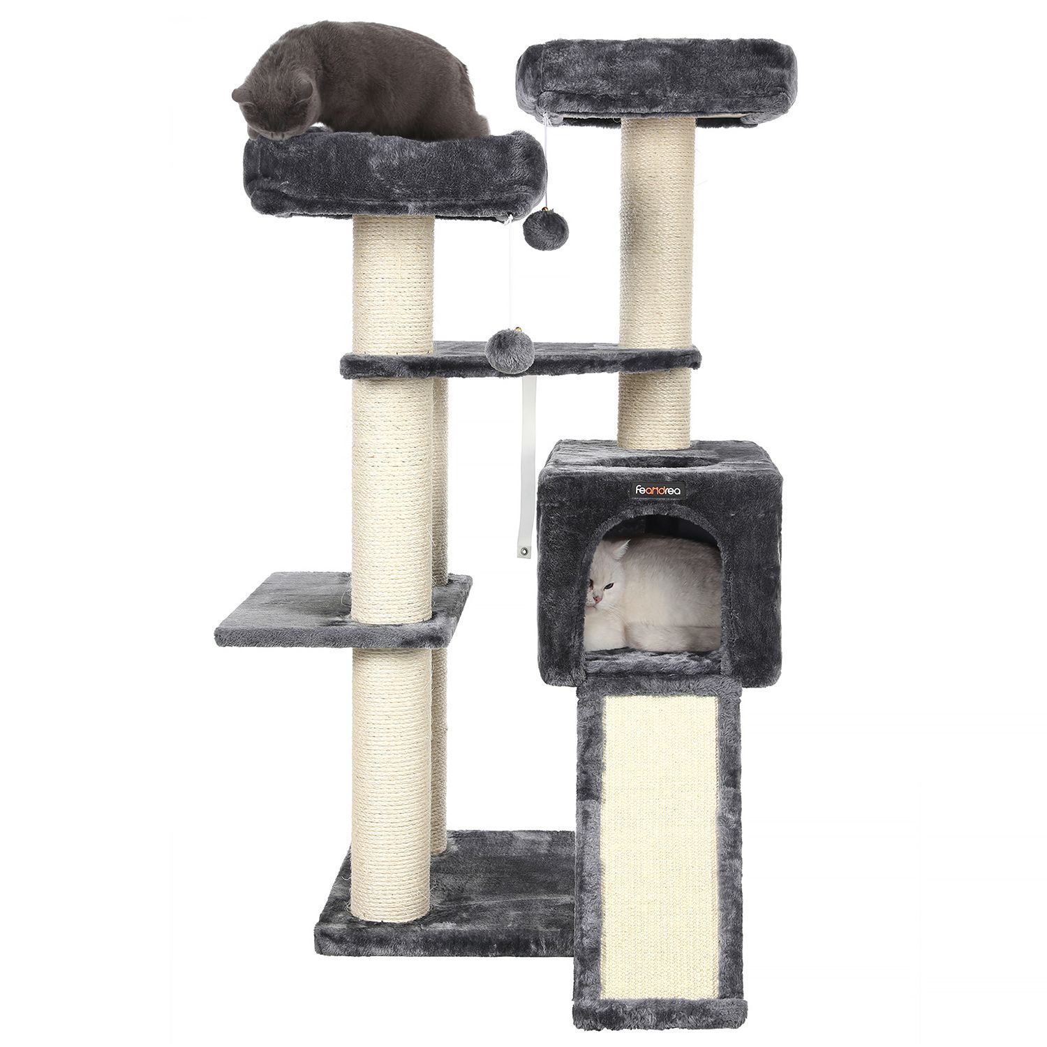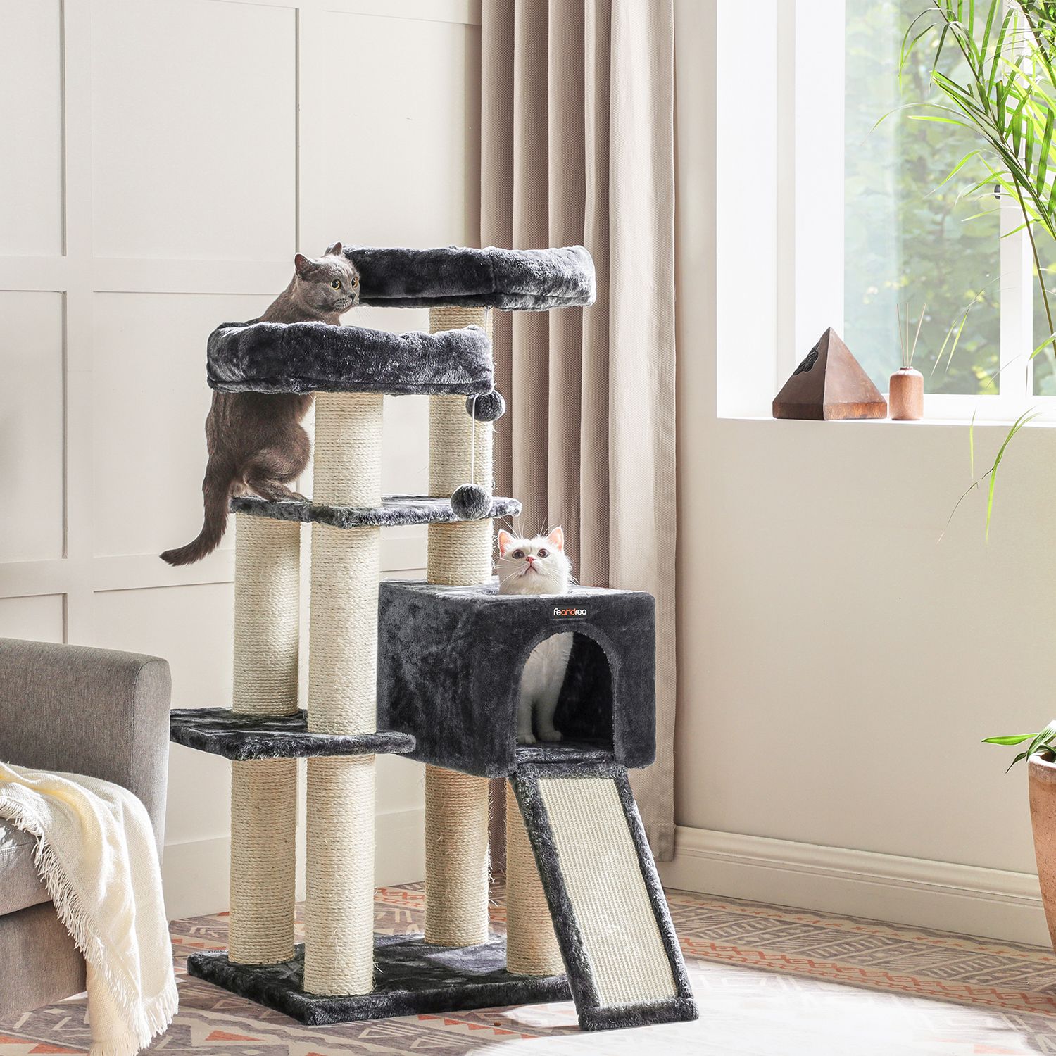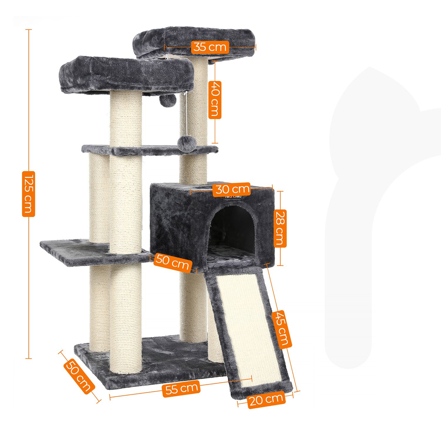 FEANDREAn luovissa työpajoissa kaksi suloista kissanpentua hyppii ympäriinsä, tutkii kaikki raapimispuut henkilökohtaisesti ja antaa eläimellisen palautteensa niistä. Näin FEANDREAn suunnittelijat saavat ensikäden, tai pikemminkin ensikäpälän, tietoa siitä, täyttävätkö tuotteet hemmoteltujen viiksekkäiden vaatimukset.Tämän raapimispuun kohokohdat yhdellä silmäyksellä: 2 hyvin pehmustettua näköalatasannetta tarkkailuun 1 mukava kätköpaikka piiloutumiseen ja torkkumiseen 1 raapimislauta kynsien teroittamiseen sohvan sijaan 1 turkispallo ylimääräistä hauskaa varten Pehmeä pehmustettu päällinen, yhtä pehmeä kuin halaus Tuotetiedot:Väri: savuharmaa Materiaali: lastulevy, pehmolelu, sisali Koko: 55 x 50 x 125 cm (P x L x K) Paino: 19,7 kg Toimitus sisältää: 1 x raapimispuu 1 x kaatumissuoja 1 x lisävarustepaketti 1 x ohjeet (DE, EN, FR, ES, IT) FEANDREA Huomautukset:Jos kissasi pureskelee turkispalloa tai kuminauhaa, poista lelu välittömästi ja säilytä sitä kissasi ulottumattomissa. Jos kissanpesä vaurioituu, korjaa tai vaihda se ajoissa, jotta vältät vaurioituneiden osien aiheuttamat loukkaantumiset.