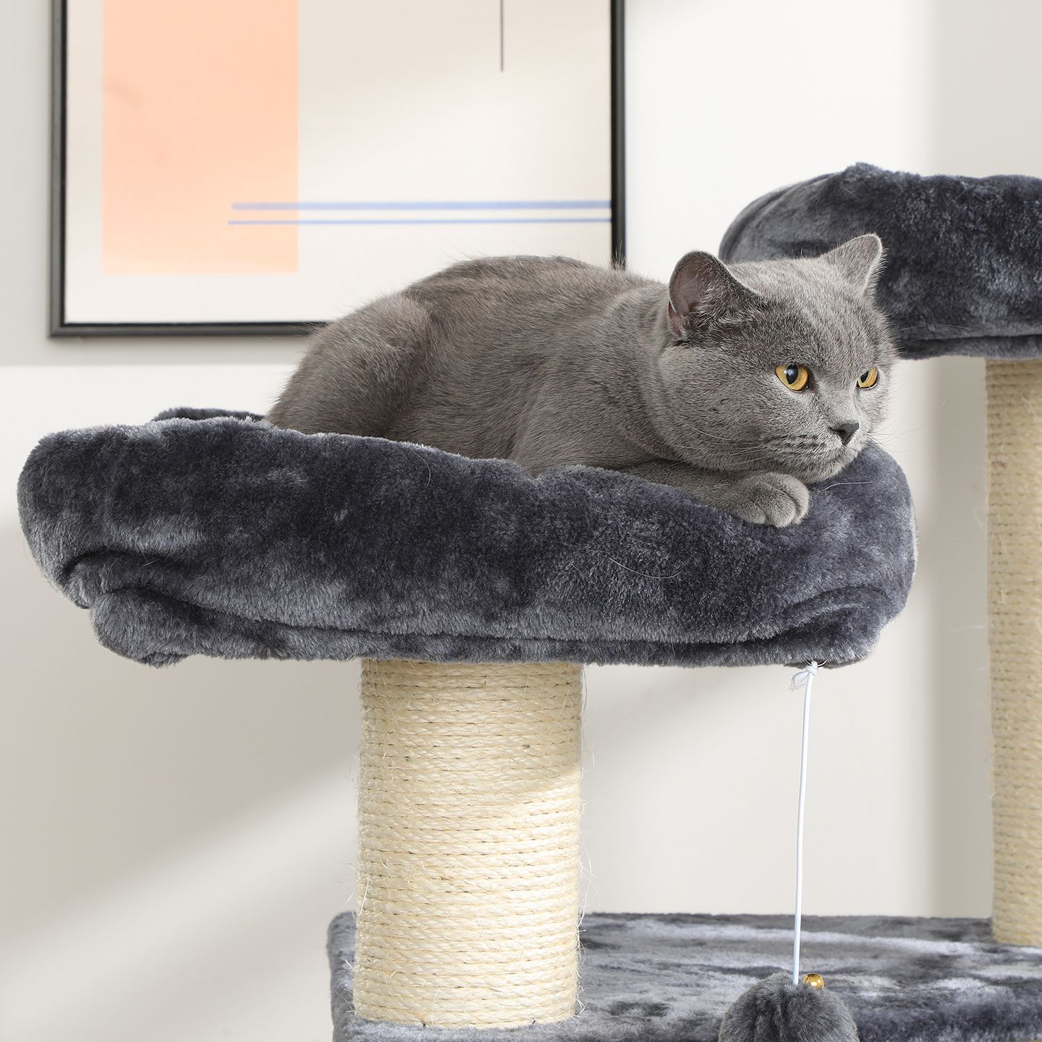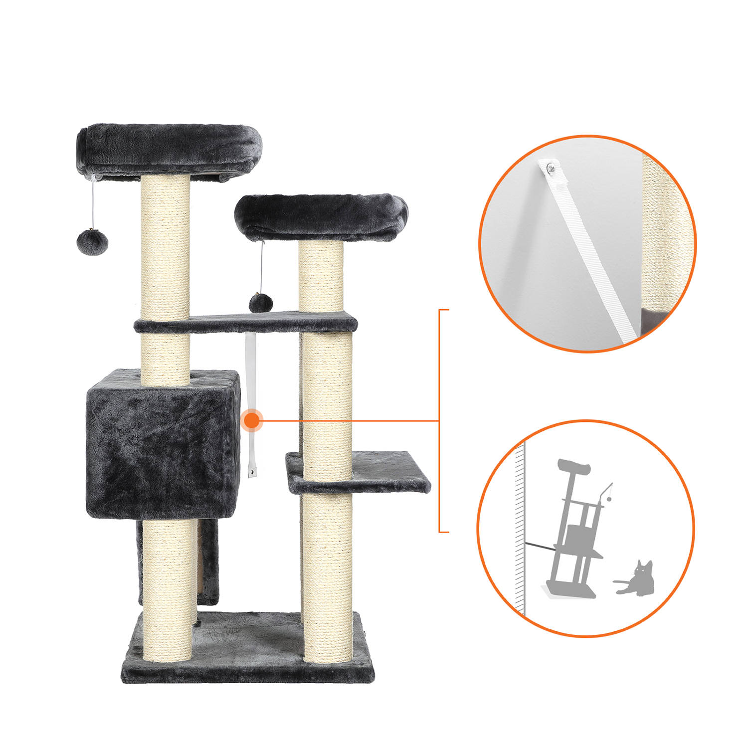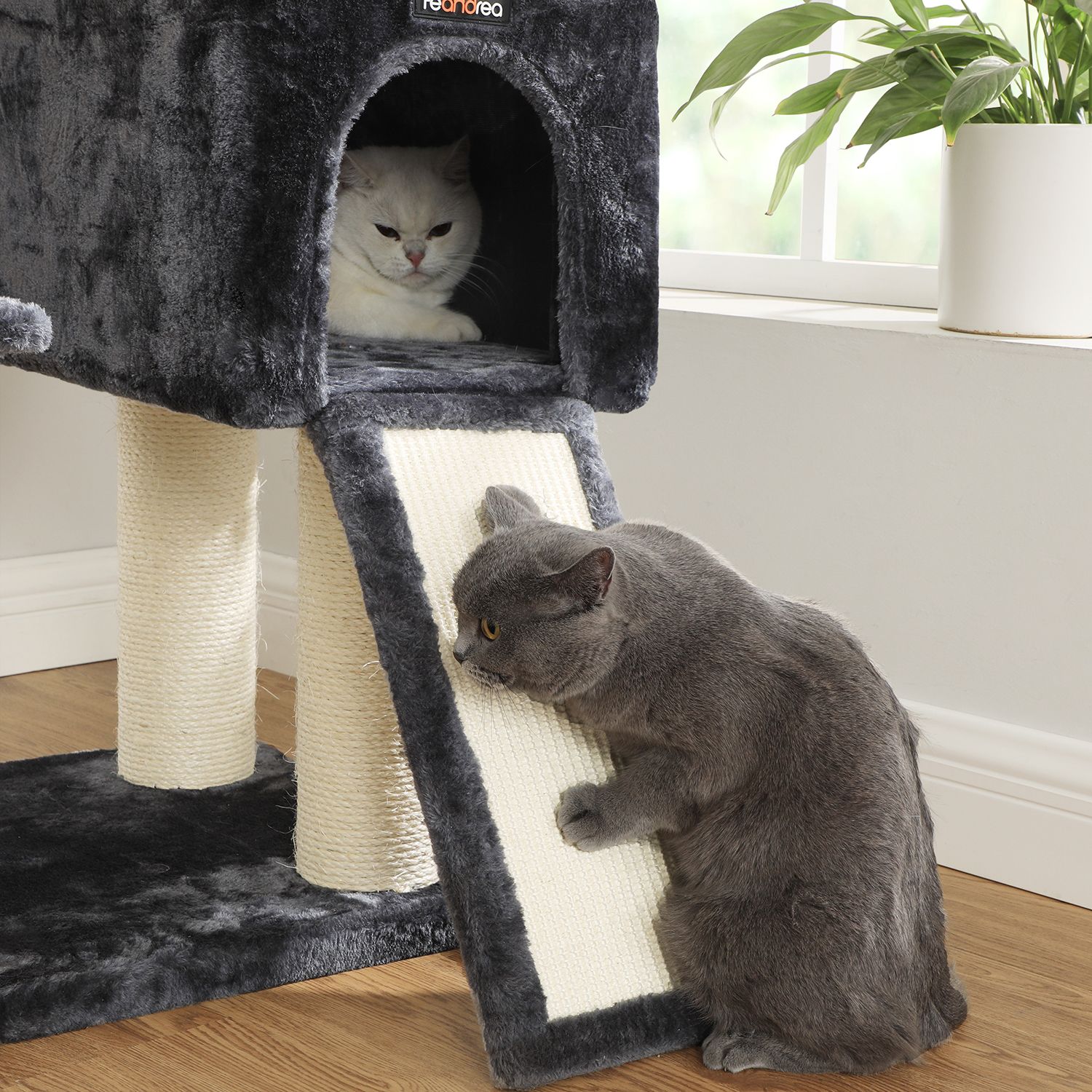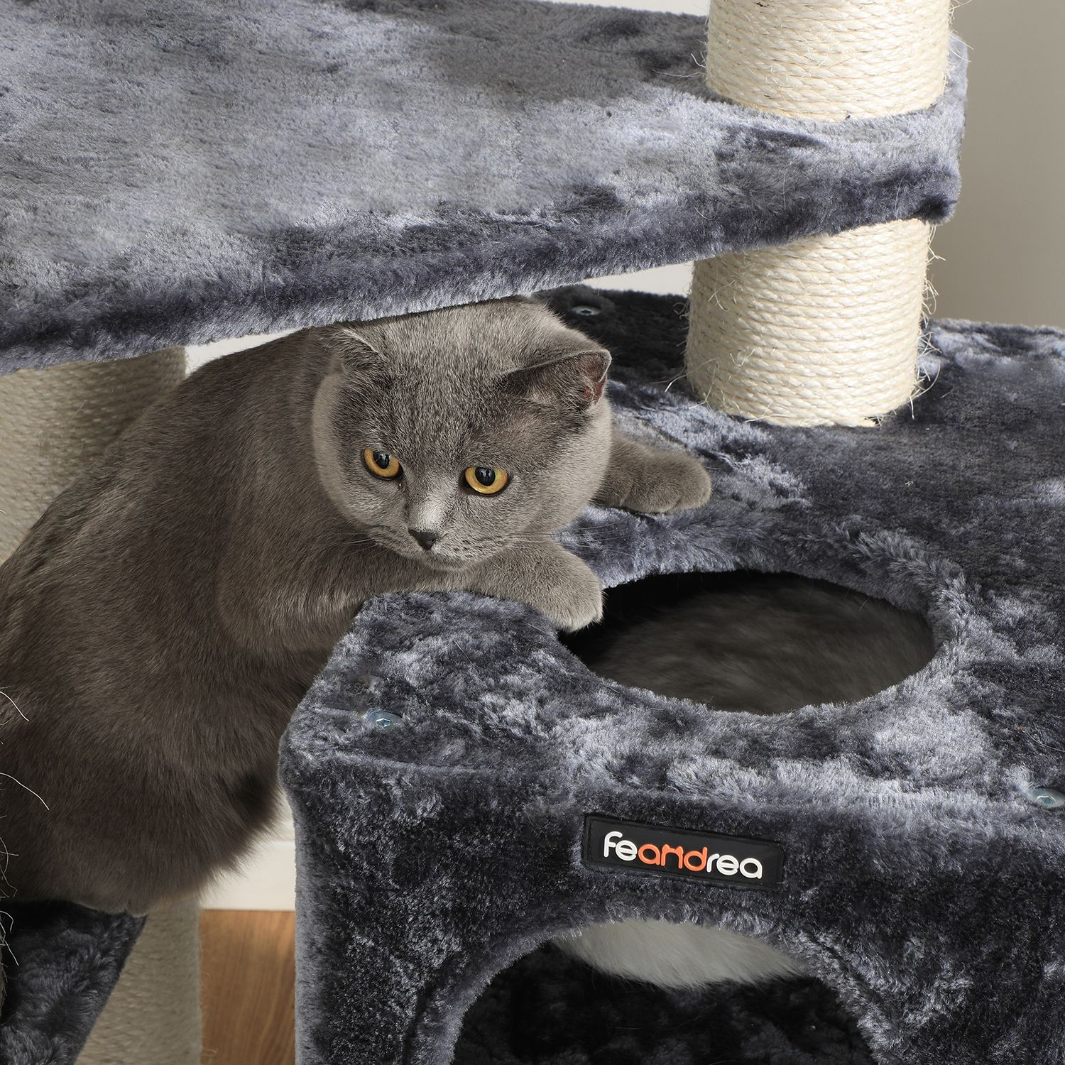 FEANDREAn luovissa työpajoissa kaksi suloista kissanpentua hyppii ympäriinsä, tutkii kaikki raapimispuut henkilökohtaisesti ja antaa eläimellisen palautteensa niistä. Näin FEANDREAn suunnittelijat saavat ensikäden, tai pikemminkin ensikäpälän, tietoa siitä, täyttävätkö tuotteet hemmoteltujen viiksekkäiden vaatimukset.Tämän raapimispuun kohokohdat yhdellä silmäyksellä: 2 hyvin pehmustettua näköalatasannetta tarkkailuun 1 mukava kätköpaikka piiloutumiseen ja torkkumiseen 1 raapimislauta kynsien teroittamiseen sohvan sijaan 1 turkispallo ylimääräistä hauskaa varten Pehmeä pehmustettu päällinen, yhtä pehmeä kuin halaus Tuotetiedot:Väri: savuharmaa Materiaali: lastulevy, pehmolelu, sisali Koko: 55 x 50 x 125 cm (P x L x K) Paino: 19,7 kg Toimitus sisältää: 1 x raapimispuu 1 x kaatumissuoja 1 x lisävarustepaketti 1 x ohjeet (DE, EN, FR, ES, IT) FEANDREA Huomautukset:Jos kissasi pureskelee turkispalloa tai kuminauhaa, poista lelu välittömästi ja säilytä sitä kissasi ulottumattomissa. Jos kissanpesä vaurioituu, korjaa tai vaihda se ajoissa, jotta vältät vaurioituneiden osien aiheuttamat loukkaantumiset.