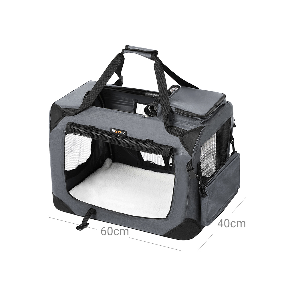 Näin varmistat, että kuljetuslaatikko sopii koirallesi Mittaa ensin etäisyys koirasi pään ja etujalkojen välillä. Kuljetuslaukun tulisi olla 3–5 cm mittaamaasi arvoa pidempi. Mittaa sitten etäisyys koirasi nenän kärjestä takapäähän. Kotelon tulisi olla 10–13 cm pidempi, jotta koirallasi on tarpeeksi tilaa kääntyä tai nousta seisomaan. Voit myös tilata vielä suuremman kotelon, jos haluat. Tuotetiedot:- Väri: harmaa – Materiaali: 600D Oxford-kangas, teräs – Koko: 60 x 40 x 40 cm (P x L x K) – Paino: 3,2 kg Toimitus sisältää: – 1 x koiran kuljetuslaukku FEANDREA Huomautukset: – Mittaa lemmikkisi ennen tämän tuotteen tilaamista varmistaaksesi, että se mahtuu laukkuun.