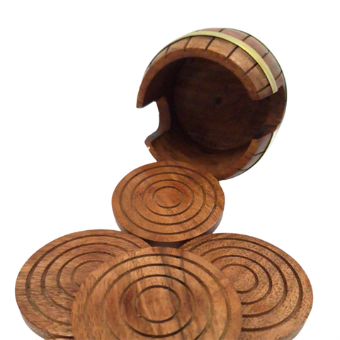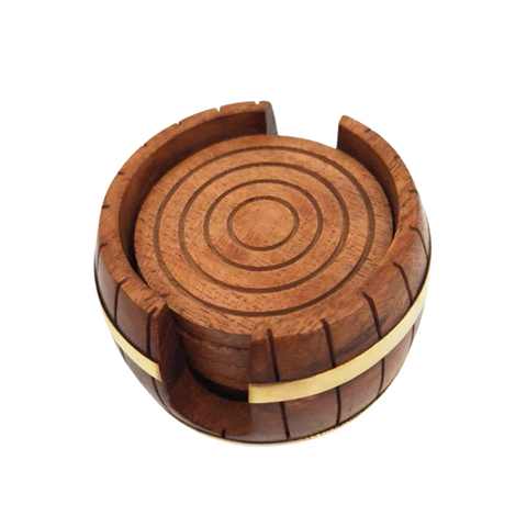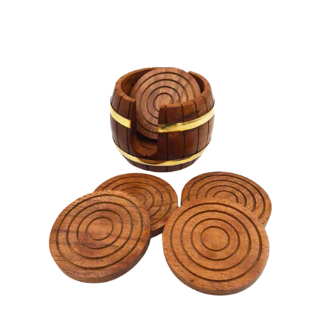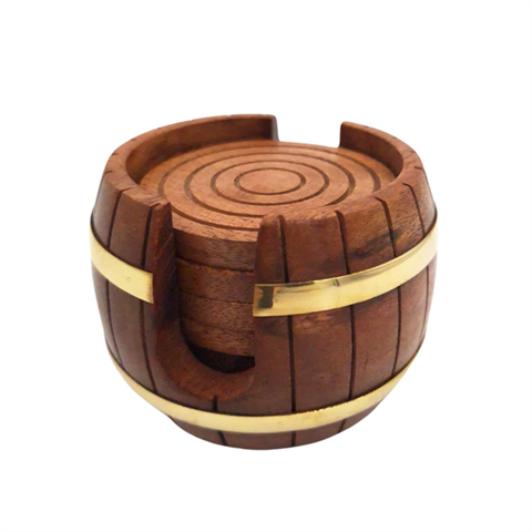 Puinen mukinlasinaluset – tynnyrisetti – DNU-019 Mukinlasinaluset ja muut kuumat astiat mahdollistavat lämpimän juoman nauttimisen ilman riskiä puisen työtason vahingoittumisesta. Tämä 6 puisen lasinalusen sarja tynnyrissä lasinalusten säilyttämistä varten on viehättävä lahja tee- ja kahvin ystäville. Tynnyrin muotoinen säilytysastia, jossa on reikä toisella puolella lasinalusten helpon ottamisen mahdollistamiseksi. Alustat ovat uritettuja, jotta kupit eivät liu’u. Tuotetiedot: Setti sisältää: 6 x mukialusta ja tynnyrimäinen säilytysastia.Materiaali: puuKoristelu: messinki Säilytysastian mitat: 10 x 6,5 cmVärit: ruskea, kulta