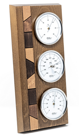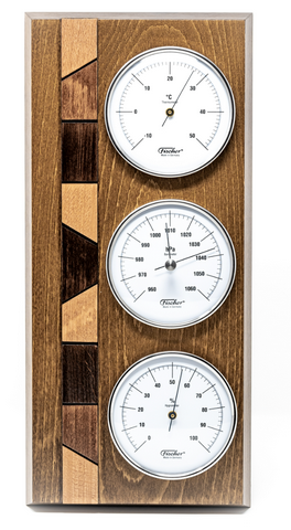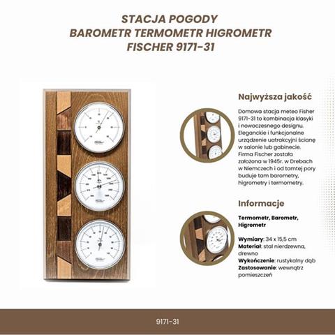 Sääasema Fischer 9171-31 Saksalaisen Fischer-yhtiön valmistama tyylikäs ja erittäin tarkka sääasema. Sääasema sisältää barometrin, kosteusmittarin ja lämpömittarin.Fisherin sääaseman ansiosta voit hallita kotisi mikroilmastoa. Barometrin avulla voit seurata paineen laskuja ja nousuja. Kosteusmittari näyttää kodin ilmankosteuden, ja lämpömittarista voit lukea lämpötilan. Kaikki tämä erittäin klassisessa, tyylikkäässä muodossa. Hopeakehyksiset mittarit on sijoitettu tummalle puualustalle. Mittareiden valkoiset asteikot kontrastoivat tumman fontin ja kultaisten kehysten kanssa. Vasemmalla puolella olevassa kotelossa on erittäin mielenkiintoiset, geometriset koristeet. Tämä kotisääasema sopii erinomaisesti englantilaistyylisiin, toimistotyylisiin ja kolonialistiseen tyyliin sisustettuihin huoneisiin. Tuotetiedot: Mitat: 34 x 15,5 cm Materiaali: puu, ruostumaton teräs Barometrin mittaustarkkuus: ± 3 hPa Kosteusmittarin mittaustarkkuus: ± 5 % r.h. (20 … 100 %), +1 asteikko Lämpömittarin mittaustarkkuus: ± 1 K Huomio! Barometrin, lämpömittarin ja kosteusmittarin asteikko on asetettu tehtaalla. Voimakkaiden iskujen vuoksi uusi säätö voi kuitenkin olla tarpeen. Tätä varten barometrin ja kosteusmittarin tapauksessa käytä ruuvimeisseliä ja säädä laitteen takana olevaa ruuvia mukana toimitetun käyttöohjeen ohjeiden mukaisesti. Lämpömittarin tapauksessa, kun elohopeapylväs on repeytynyt, se voidaan korjata nykäisemällä pylvästä useita kertoja voimakkaasti.