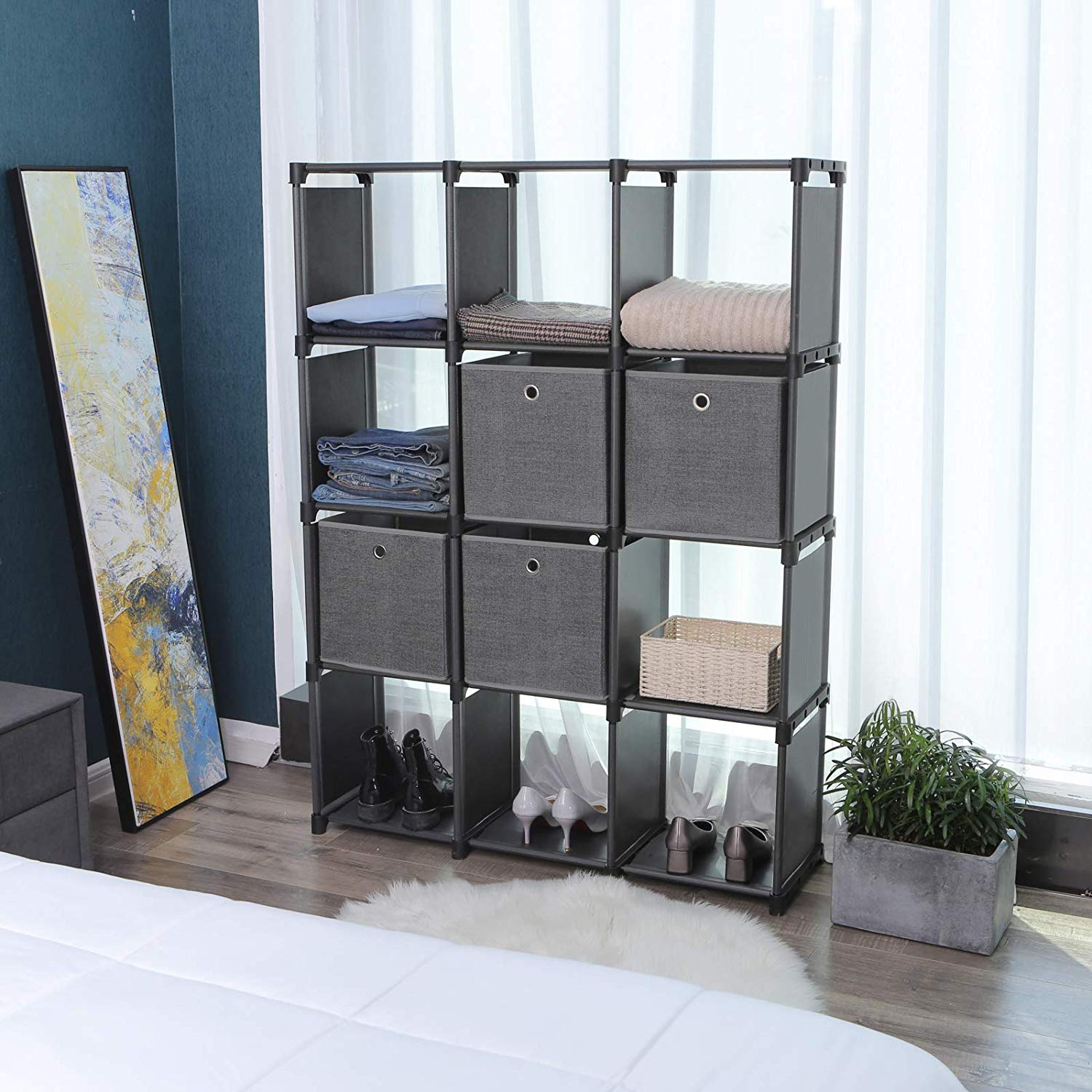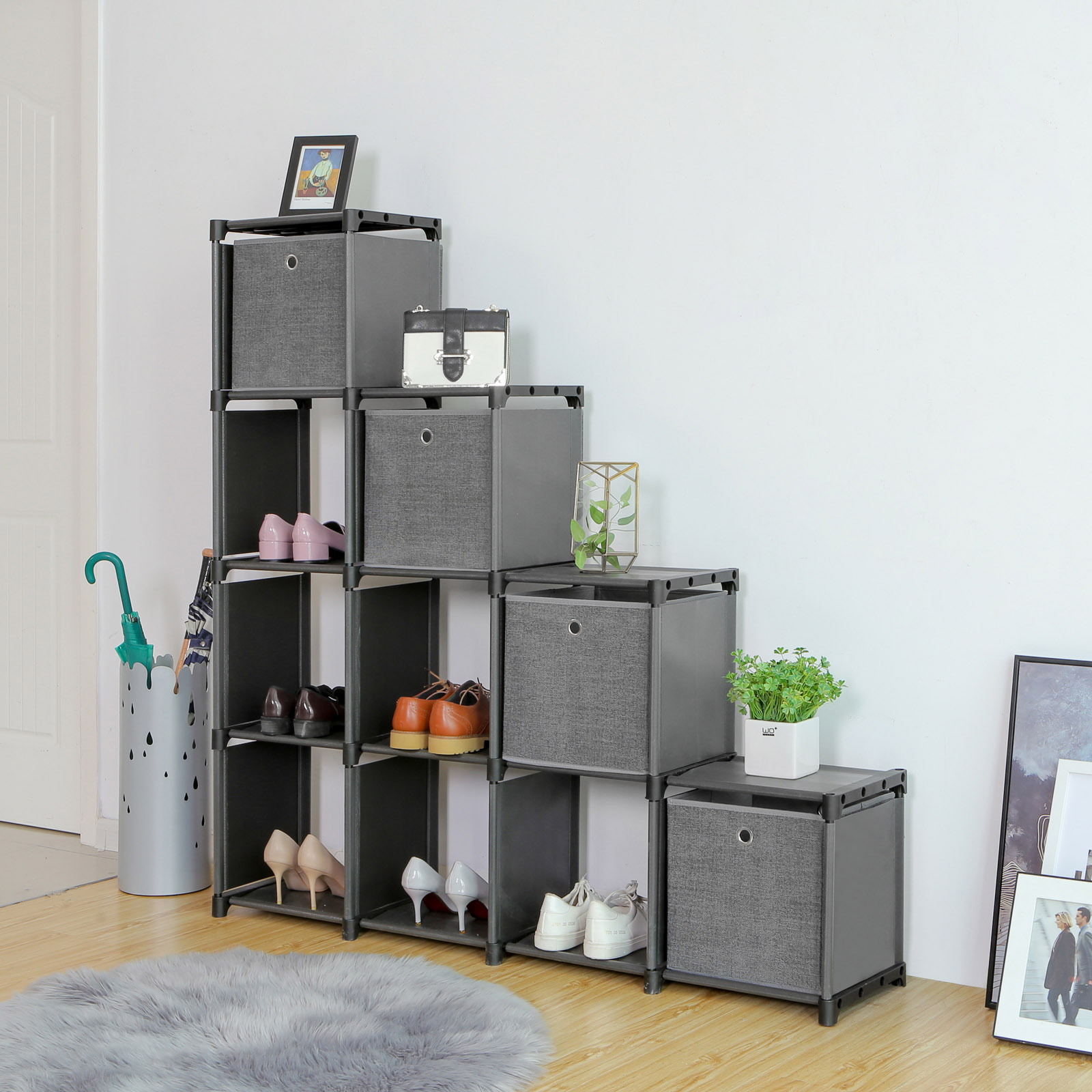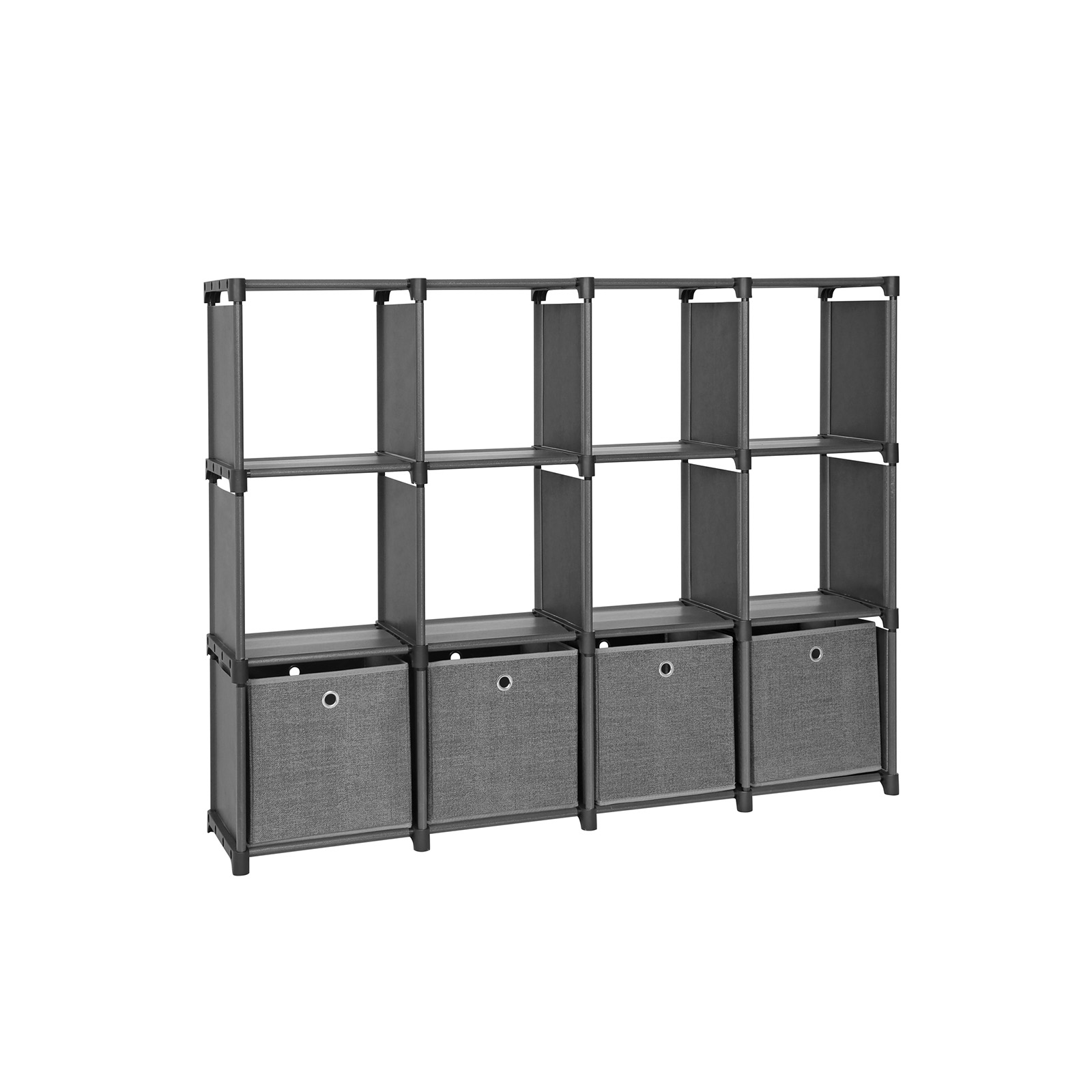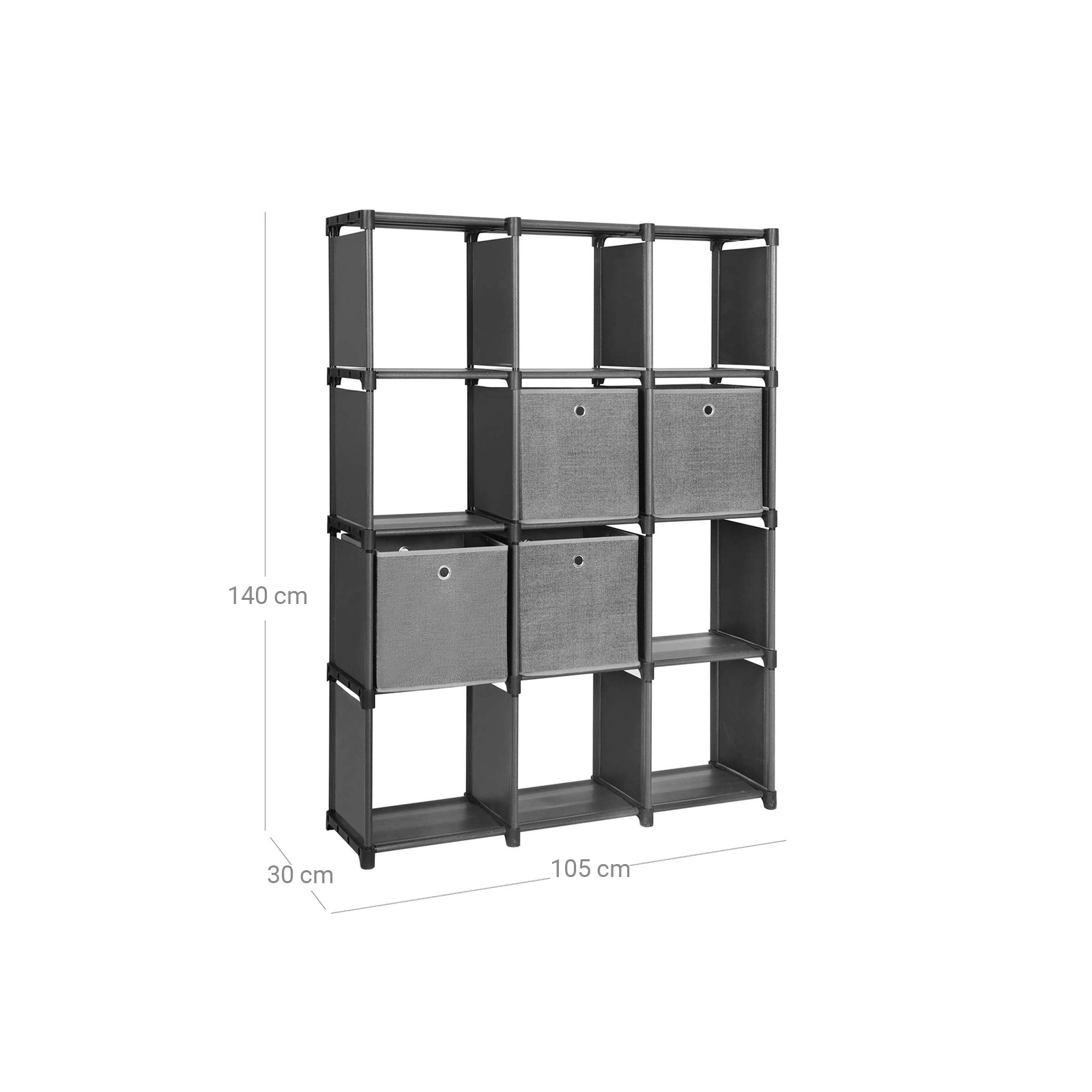 Tuotetiedot: Väri: musta Materiaali: rautaputket, muoviliitokset, kuitukangas Mitat: 105 x 140 x 30 cm (L x K x S) Paino: 7,2 kg Maks. kantavuus: 100 kg Maks. kuormituskyky kuutiota kohti: 8 kg Toimitus sisältää: 1 x säilytyshylly 4 x kuitukankaista laatikkoa 1 x kumivasara 2 x kaatumissuoja 1 x ohjeet (DE, EN, FR, ES, IT) SONGMICS Huomautukset: Kiinnitä tuote seinään mukana toimitetulla kaatumissuojalla turvallisuuden takaamiseksi.