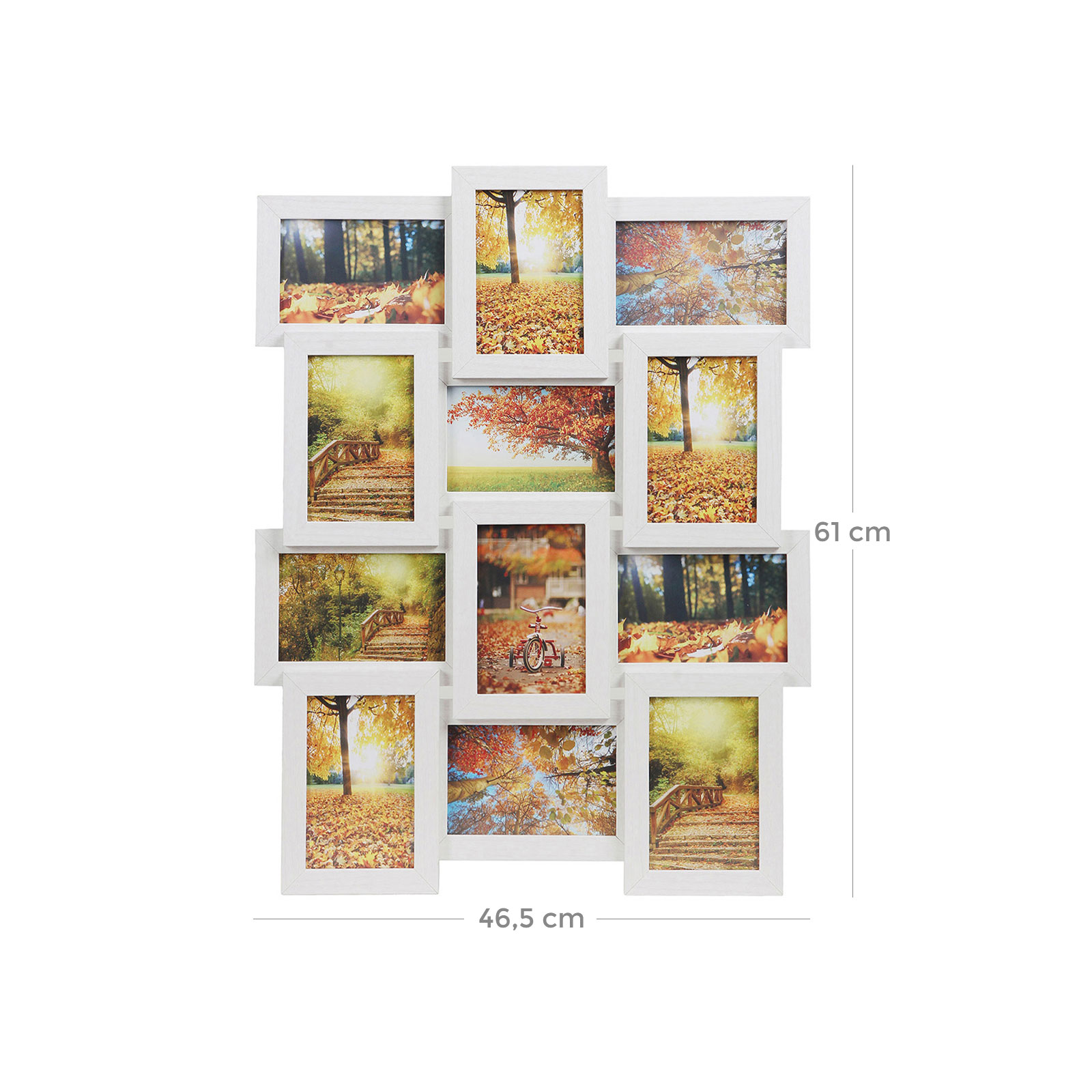 SONGMICS Kuvakehyskollaasi 12 valokuvalle, kukin 10 x 15 cm (4 x 6), 1 yksittäinen valokuvakehys, 13 valokuvagalleria kollaaseja varten, MDF-levystä, asennus vaaditaan, valkoinen, puukuviolla RPF112W