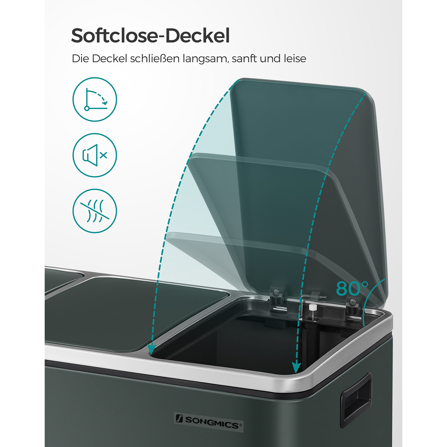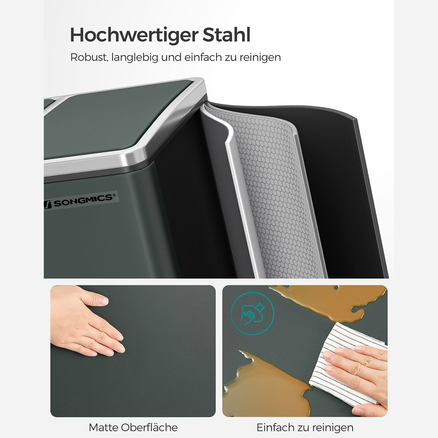 Kierrättäminen voi olla helppoa: tämän 3 erillisen lokeron poljinkorin avulla voit lajitella jätteesi, kuten kiinteän jätteen ja biojätteen, helposti. Sinun tarvitsee vain painaa poljinta ja heittää jäte sisäkorin sisään. Sinun ei tarvitse edes koskettaa roskakoria käsin, mikä takaa hygienian.”Koiranpentu- ja lapsiturvallinen” roskakori: Kaiveleeko koirasi usein roskakoria? Kurottavatko lapsesi usein avoimeen roskakoriin? Jos näin on, haluat varmasti lopettaa tämän. Tässä tulee poljettava roskakori! Kansi avautuu vasta, kun painat poljinta. Tuotetiedot: Väri: savuharmaa Materiaali: teräs, PP-muovi (sisäastia), ABS-muovi (kansi) Kokonaismitat: 61,5 x 31,5 x 56 cm (P x L x K) Sisäastian mitat: 18 x 26,5 x 49 cm (P x L x K) Kokonaiskorkeus (kansi auki): 84,5 cm Paino: 9,1 kg Toimitus sisältää: 1 x roskakori 1 x käyttöohje (DE, EN, FR, ES, IT) SONGMICS-ohjeet: Puhdista tuote kostealla liinalla ja kuivaa se sen jälkeen.