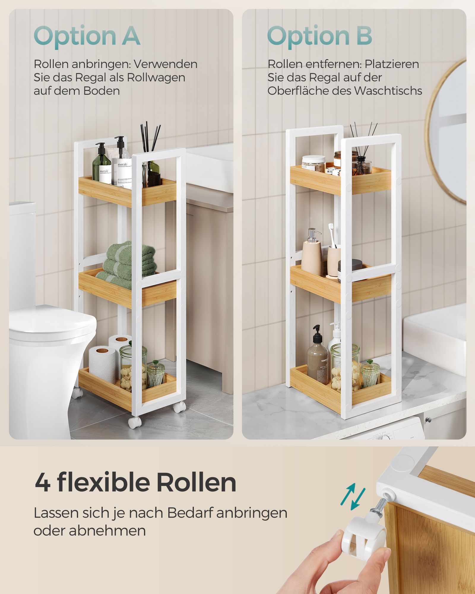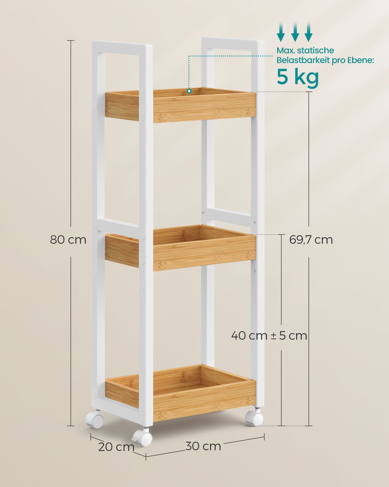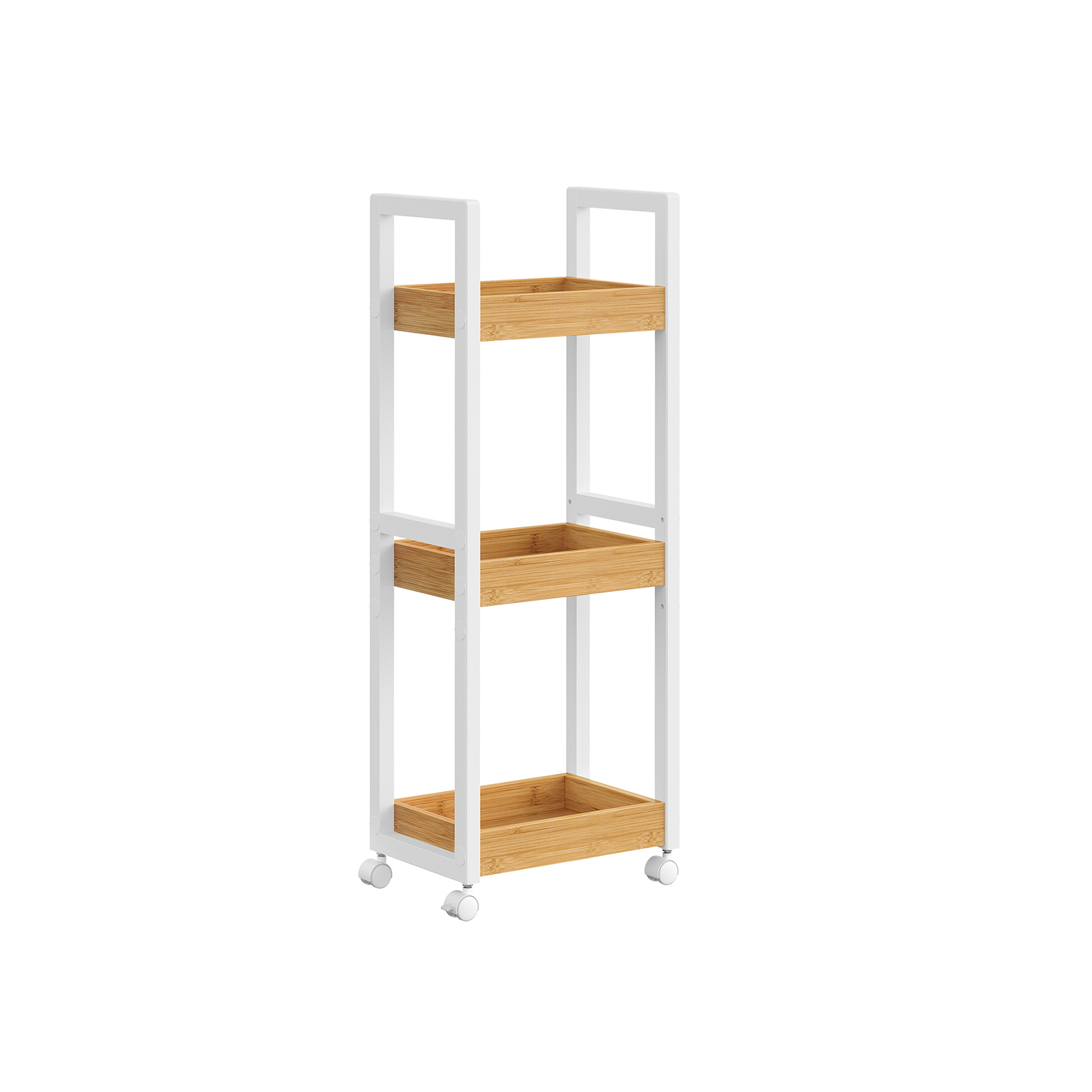 SONGMICS rullavaunu, kylpyhuonehylly, 3-tasoinen kylpyhuonehylly, bambusta valmistettu kapea hylly, kapea hylly, rullilla varustettu kapea vaunu, tilaa säästävä