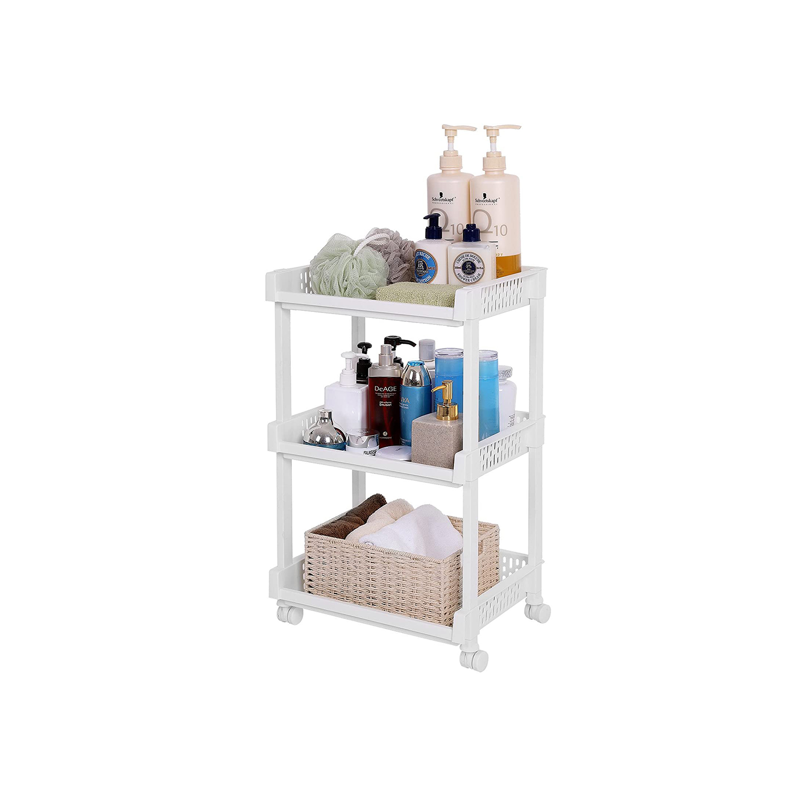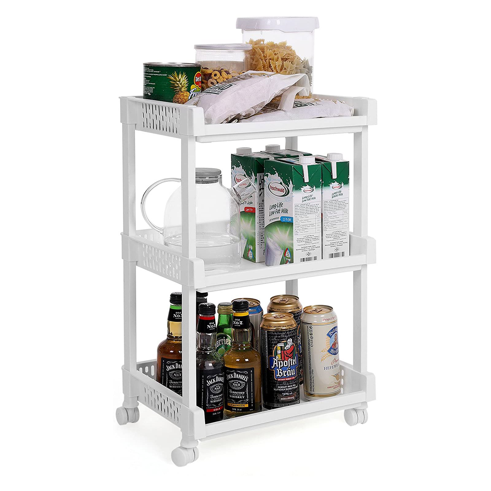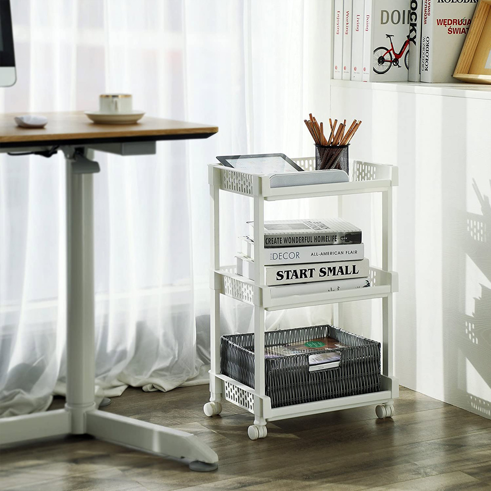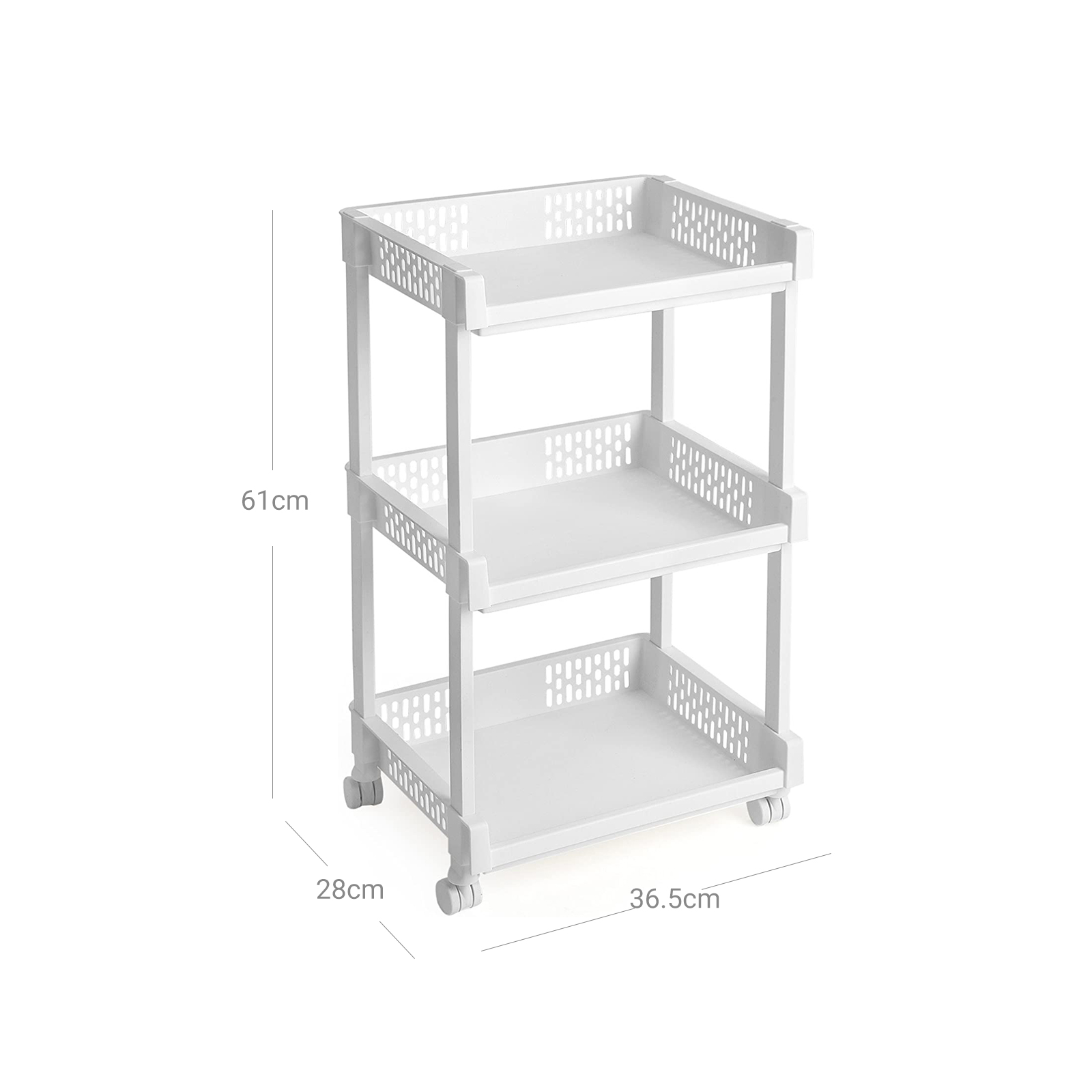 Paljon säilytystilaa pienessä tilassa: Mitat 36,5 x 28 x 61 cm, rullavaunussa on 3 säilytyslokeroa, jotka on sijoitettu tasaisesti hyllylle. Näin erilaiset keittiötarvikkeet, elintarvikkeet, kosmetiikka, lelut tai toimiston säilytystarvikkeet löytävät paikkansa. Säilytyslokeroiden sivuseinissä olevat urat antavat hyllylle leikkisän ilmeen. Kestävä ja helppokäyttöinen: Valkoisesta PP-muovista valmistettu hylly on erittäin helppokäyttöinen, mutta silti erittäin vakaa ja kestävä. Sitä on helppo työntää ja vetää neljän yleispyörän ansiosta. Sen kantavuus on 15 kiloa. Helppo puhdistaa ja koota: Kuvitetut ohjeet selittävät hyvin, miten hylly kootaan. Yksittäiset osat asetetaan helposti toisiinsa, mikä onnistuu vaivattomasti ilman työkaluja ja muutamassa minuutissa. Muuttaessa tai kun hyllyä ei käytetä, se voidaan purkaa yhtä nopeasti.Tuotetiedot: Väri: valkoinen Materiaali: PP-muovi Tuotteen mitat: 36,5 x 28 x 61 cm (L x K x S) Paino: 1,25 kg Kantavuus: 15 kg Toimitus sisältää: 1 x rullavaunu 1 x ohjeet (DE, EN, FR, ES, IT) SONGMICS-huomautukset:Jotta liitokset pysyvät tiukasti kiinni ja hylly ei vaurioidu, älä pura ja kokoa tuotetta useita kertoja. Suojaa tuote lämmönlähteiltä vaurioiden välttämiseksi.