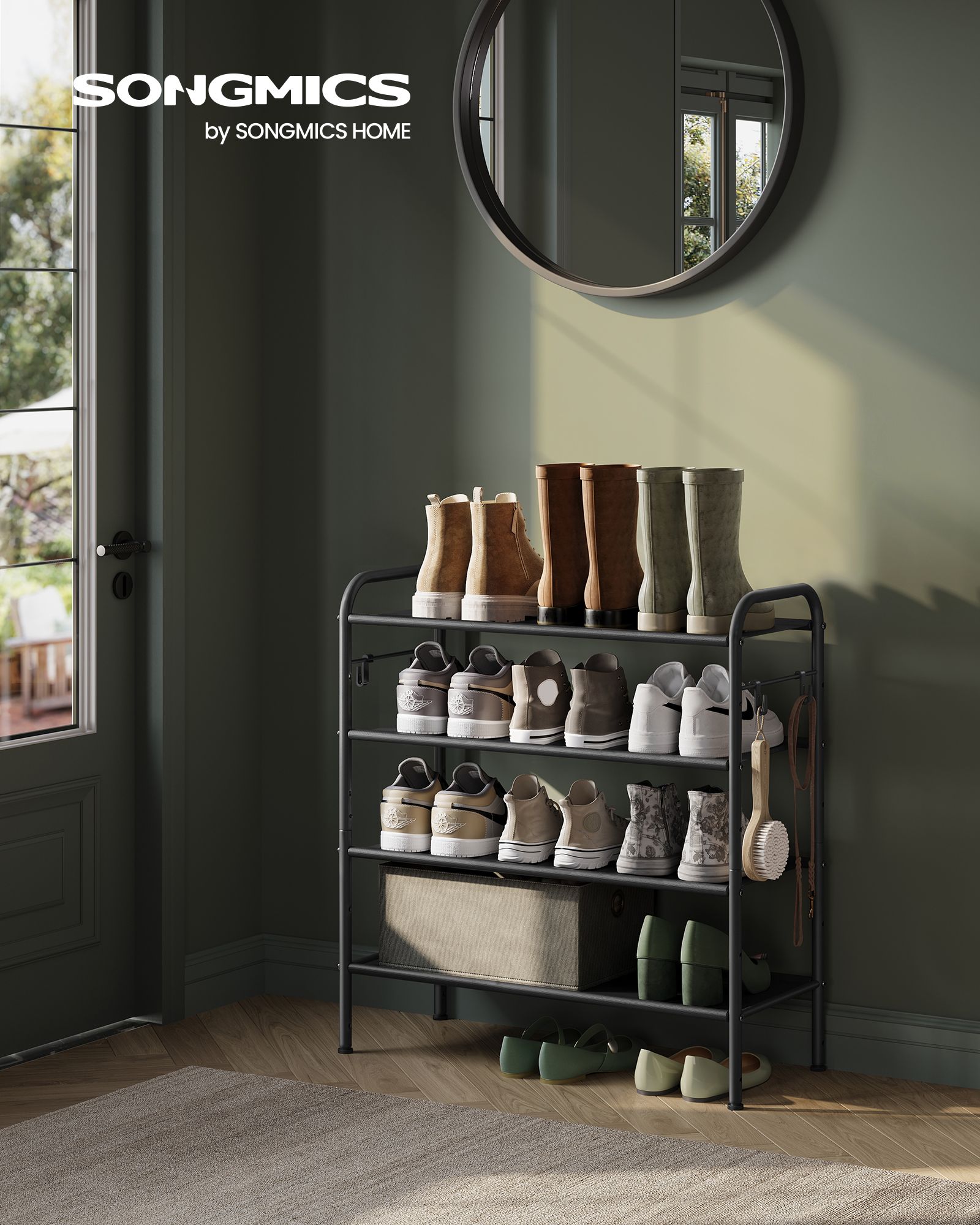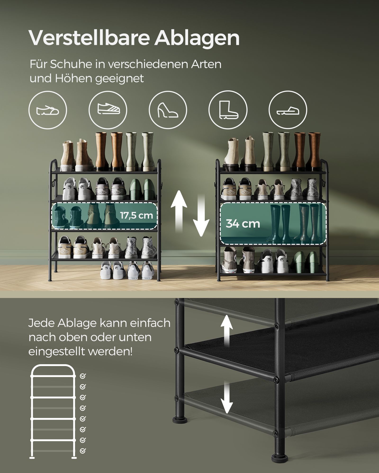 SONGMICS kenkähylly, kenkäteline, tasot, kangashylly, sivukoukut, korkeussäädettävä hylly, eteisen vaatekaappi, helppo asentaa